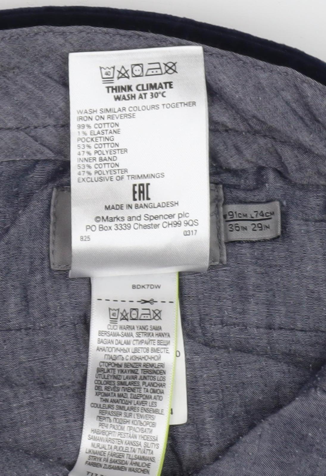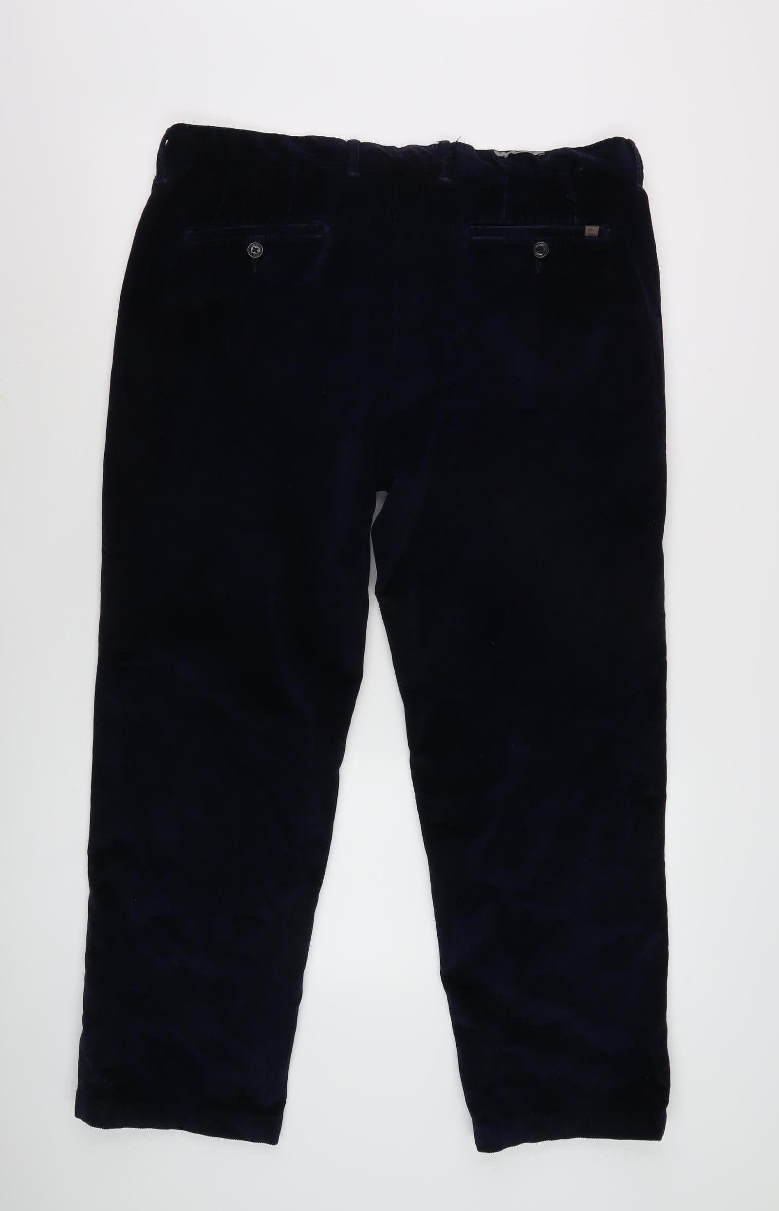 These men's trousers by Marks and Spencer, crafted from an elegant dark blue cotton corduroy, offer a sophisticated yet casual look. The regular fit provides comfort and style, while the flat front and straight leg design add a timeless appeal. Perfect for autumn and winter, these trousers are designed to keep you warm with their durable, quality fabric. The trousers are machine washable, ensuring easy care and maintenance, making them ideal for everyday wear. With a convenient button closure and a waist size of 36 inches, paired with an inside leg of 29 inches, these trousers are perfect for a night out or a relaxed day at the office. Enjoy the subtle flexibility of the fabric, thanks to the slight addition of elastane, ensuring ease of movement and fit. Despite a minor mark on the leg, these trousers maintain their excellent condition, offering style at a great value.