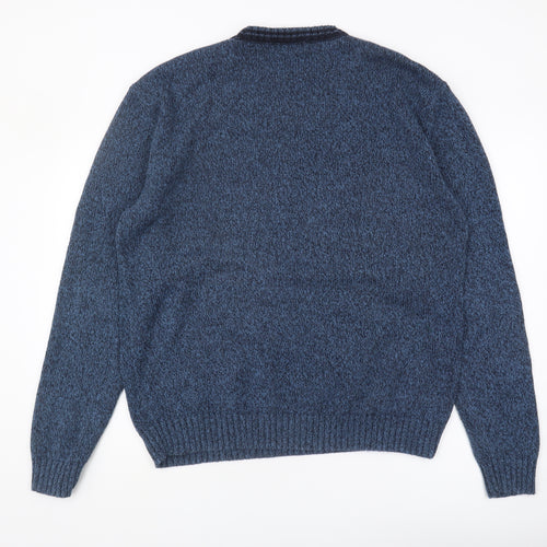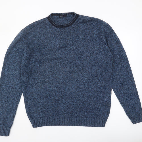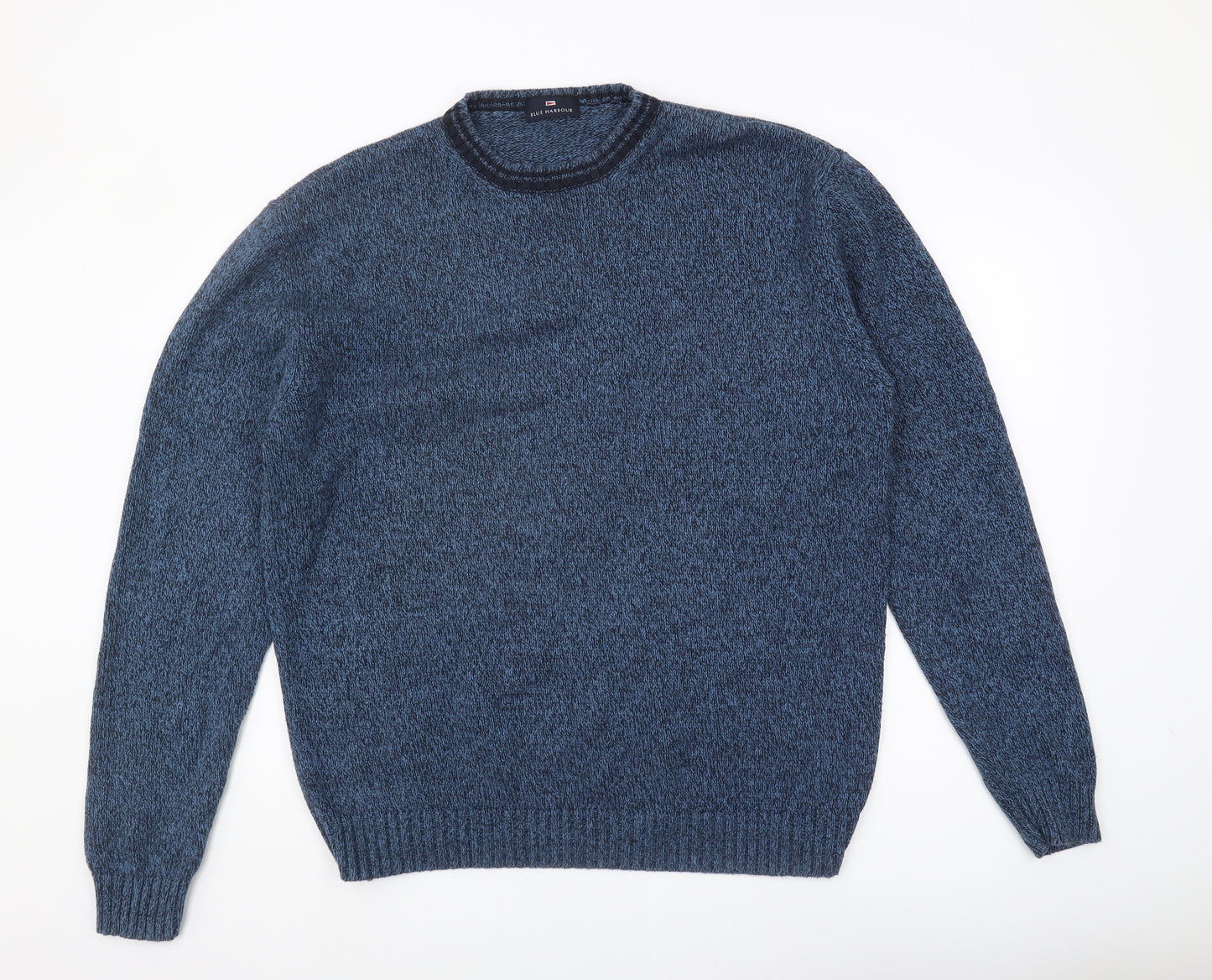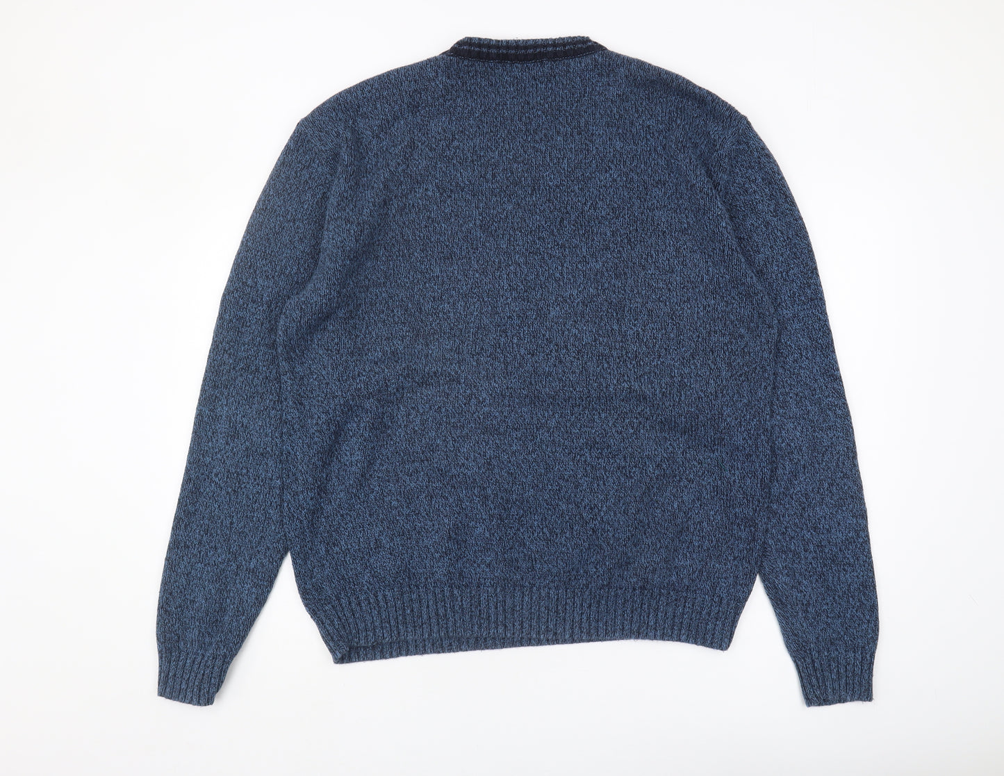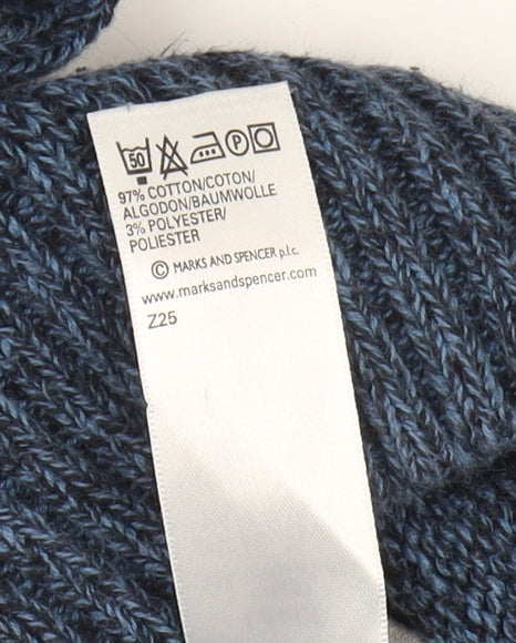Elevate your wardrobe with this stylish blue pullover jumper from Marks and Spencer, designed specifically for men. Crafted in a comfortable cotton-polyester blend, this jumper ensures both warmth and breathability, perfect for all seasons. The classic crew neck style and long sleeves make it versatile for casual outings or layering into a more formal look. With a regular fit and no pattern design, it seamlessly integrates into any wardrobe, giving you the freedom to mix and match effortlessly. Whether you're dressing for comfort or style, this jumper is an ideal addition to your daily wear. Enjoy its machine washable convenience, allowing for easy care and maintenance. Although not brand new, the jumper remains in excellent condition with no visible wear. Add this essential piece to your collection today and enjoy a perfect balance of style and functionality.