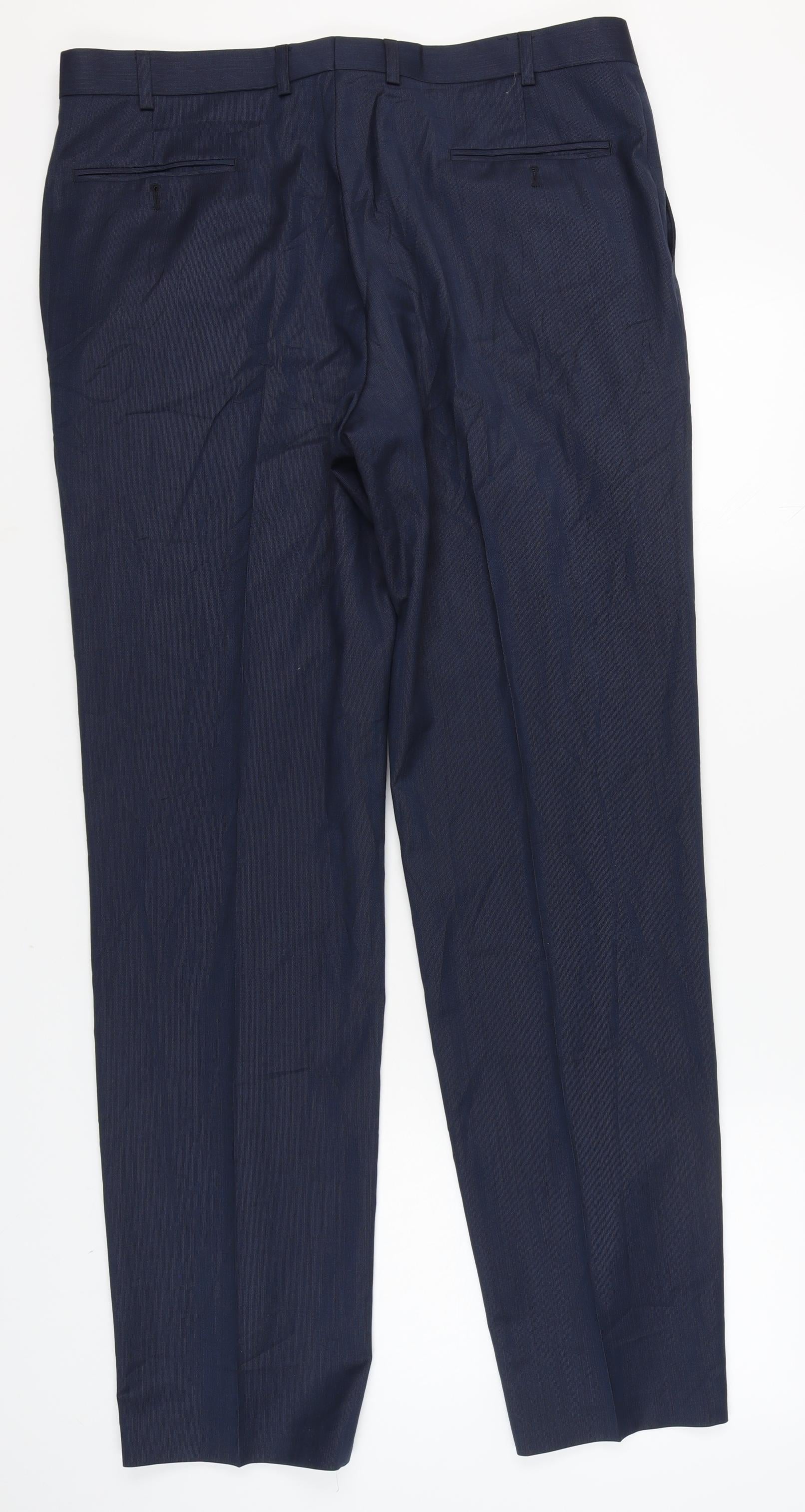 Elevate your wardrobe with these sophisticated Marks and Spencer men's dress trousers, hand-crafted from a luxurious blend of 70% wool and 30% polyester, perfect for comfort and style. The rich indigo blue shade provides a modern, versatile look suitable for a variety of occasions, from formal events to professional environments. With a 38-inch waist and a 35-inch inside leg, these trousers deliver a tailored fit that accentuates a sleek silhouette. The flat front design complements its crisp aesthetic, while the button closure ensures security and ease. Ideal for pairing with a classic dress shirt or a smart blazer, these trousers are dry clean only, adding an extra touch of care to maintain their premium quality. Seize the opportunity to own these timeless trousers brand new with tags, highlighting the pristine condition and ensuring comfort and durability for prolonged wear. Transform your collection with this essential piece of savvy fashion, crafted for the quintessential gentleman.