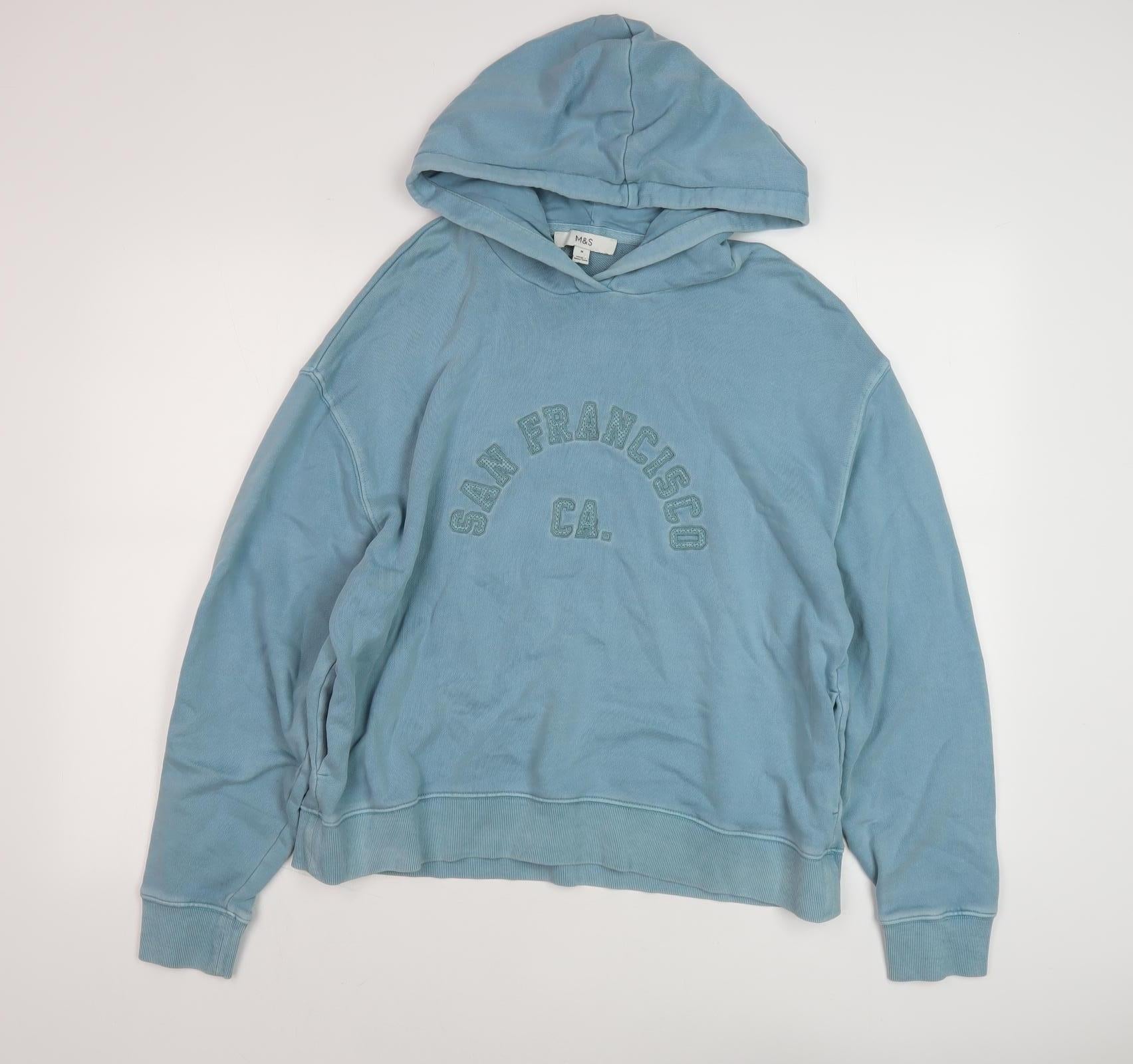 Step into casual comfort with this Marks and Spencer Men's Blue Pullover Hoodie, ideal for a laid-back day out or a cosy evening in. Crafted from 100% cotton jersey, this midweight hoodie offers breathability and ultimate comfort, making it perfect for the autumn, winter, and spring seasons. The relaxed fit design ensures a roomy feel, while the hooded style adds an extra layer of warmth and protection, perfect for brisk mornings or chilly evenings.Featuring a classic crew neckline and long sleeves, this hoodie is the epitome of simple and stylish. The blue hue is adorned with a subtle logo accent on the front, introducing a touch of city-inspired flair that enhances its casual aesthetic. Whether you're off to the gym or meeting up with friends, its graphic print adds a bit of personality to your outfit.Designed with practicality in mind, this hoodie is machine washable, ensuring easy care and maintenance. The fabric's durability means it will withstand regular wear, and the slight colour fading adds a hint of vintage charm while maintaining an overall excellent condition.This hoodie is versatile enough to pair with joggers for a relaxed ensemble or with jeans for a more polished look. Don't miss out on this comfortable and stylish addition to your wardrobe. Ideal for men who appreciate quality and understated urban style, this hoodie truly embodies casual elegance.