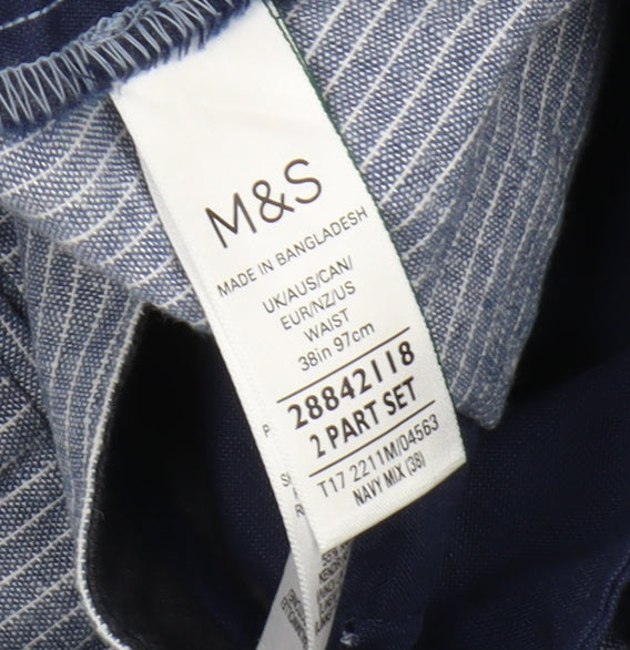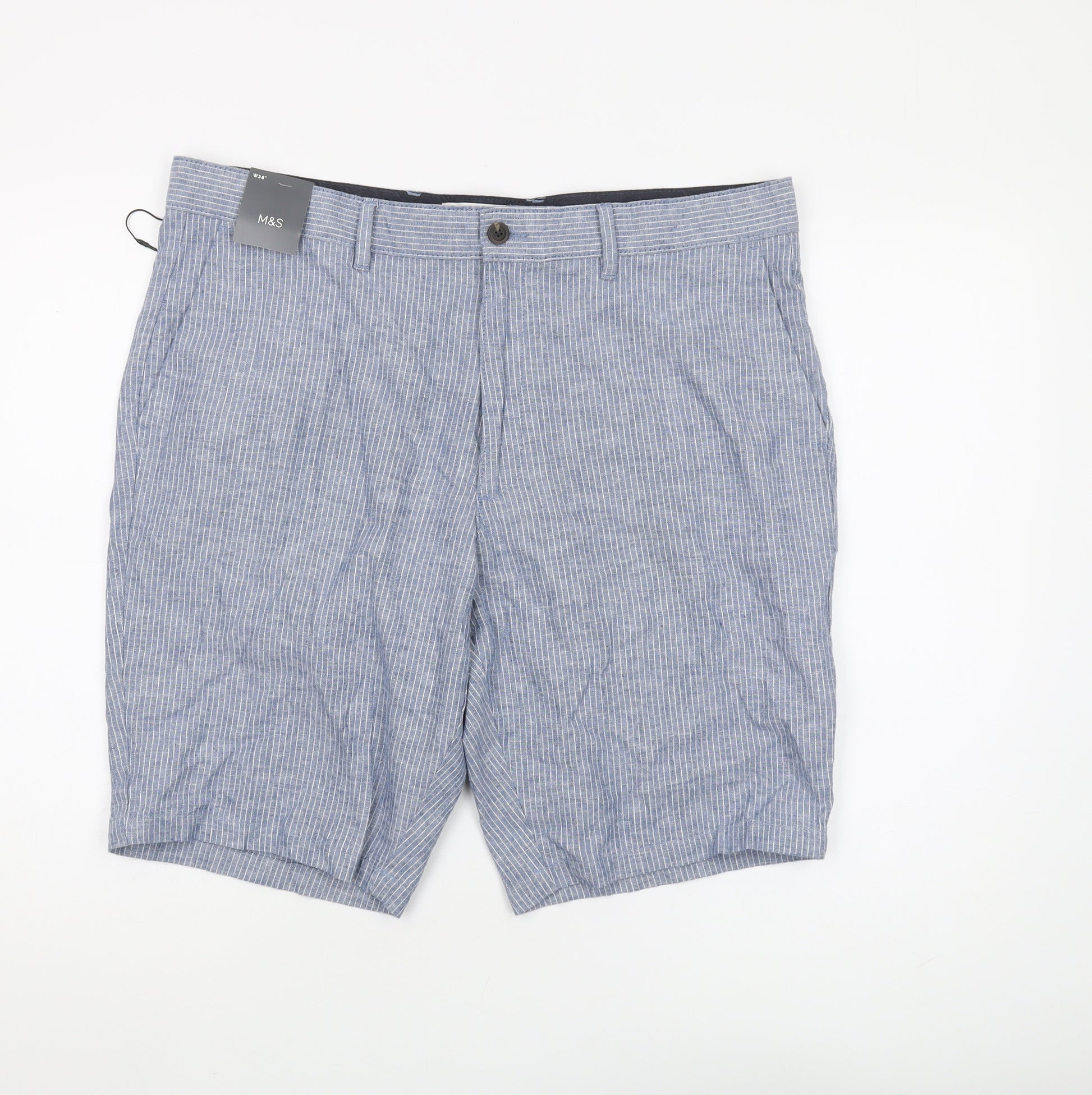 Elevate your summer wardrobe with these classic chino shorts from Marks and Spencer. Crafted from a premium blend of linen and cotton, these shorts offer comfort and style in equal measure. Featuring a timeless blue striped pattern, these shorts are perfect for both casual and smart looks. The regular fit ensures easy movement, while the flat front and button closure enhance their classic appeal. Ideal for a variety of occasions, these shorts are your go-to choice for warm weather. Machine washable for added convenience, they maintain their fresh look wear after wear. These shorts, new with tags, promise a fresh addition to your collection. With a waist size of 97 cm, they fit comfortably for a sophisticated style. Don't miss the chance to own a chic piece of summer fashion with these essential shorts.