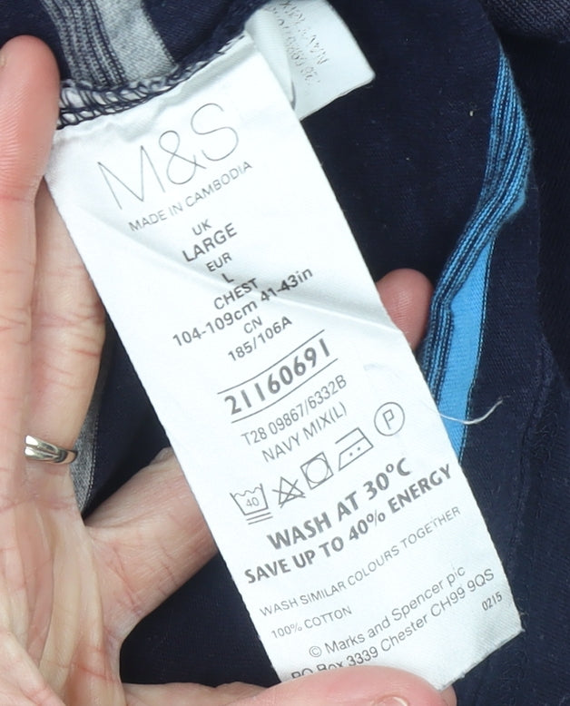 This Marks and Spencer Men’s Blue Striped Polo Shirt in size Large brings together classic comfort and smart-casual style. Crafted from 100% cotton, the polo offers a soft and breathable feel perfect for everyday wear. The shirt features a navy base with horizontal stripes in shades of blue and grey, giving it a timeless appeal suitable for both relaxed and semi-casual occasions. Designed with a collared neckline and a two-button placket, this top delivers a refined yet effortless look. The short sleeves and lightweight cotton fabric make it ideal for spring and summer yet comfortable under layers during autumn. The chest measures approximately 105 cm (41–43 inches), making it a regular fit that suits most builds. This polo embodies Marks and Spencer’s trusted quality, providing durability with all-day comfort and easy maintenance thanks to its machine-washable fabric. It's an excellent choice for casual Fridays, weekend outings, or leisurely holidays. Pair it with chinos, jeans, or shorts for a polished but laid-back ensemble. The breathable cotton ensures that you remain cool and comfortable, while the pattern adds subtle contrast that elevates your outfit. In excellent pre-owned condition with light wear and no major flaws, this piece retains its vibrant colour and shape. Whether you’re updating your smart-casual wardrobe or looking for a dependable everyday polo, this Marks and Spencer shirt combines style, comfort, and quality at great value. A wardrobe essential that blends practicality with relaxed elegance, making it a standout piece for modern men who value classic looks and reliable construction.