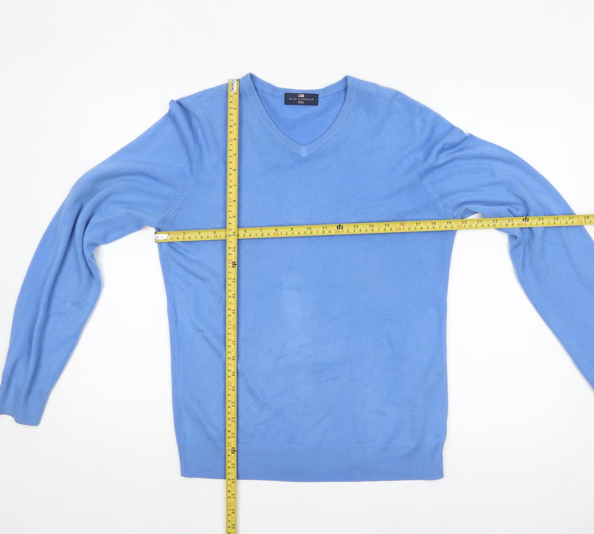Add a refined touch to your everyday style with this Marks and Spencer men's V-neck jumper in a cheerful bright blue shade. Crafted entirely from 100% acrylic, this lightweight knit offers both softness and durability, making it a superb layering choice for year-round wear. The jumper is designed in a classic regular fit and a timeless V-neckline, providing a sharp yet relaxed silhouette that works equally well with shirts or casual tees. With its smooth knit texture and ribbed cuffs and hem, the garment retains its shape beautifully while giving you a comfortable, flexible fit. Perfect for cooler spring or autumn days and equally suitable for layering under coats during winter, this jumper offers enduring versatility. Designed by Marks and Spencer, a name renowned for its quality craftsmanship and classic menswear, the piece balances comfort, practicality, and understated elegance. Machine washable for easy care, it fits effortlessly into a modern wardrobe for men who appreciate both style and convenience. Ideal for casual outings, office settings, or travel, this versatile jumper transitions effortlessly through occasions without compromising on comfort or style. Finished in bright blue, it brings a subtle pop of colour to your outfit while maintaining a clean, minimal look. In excellent pre-owned condition with no visible blemishes or damage, this jumper represents great value and timeless appeal. A wardrobe essential for refined, everyday dressing.