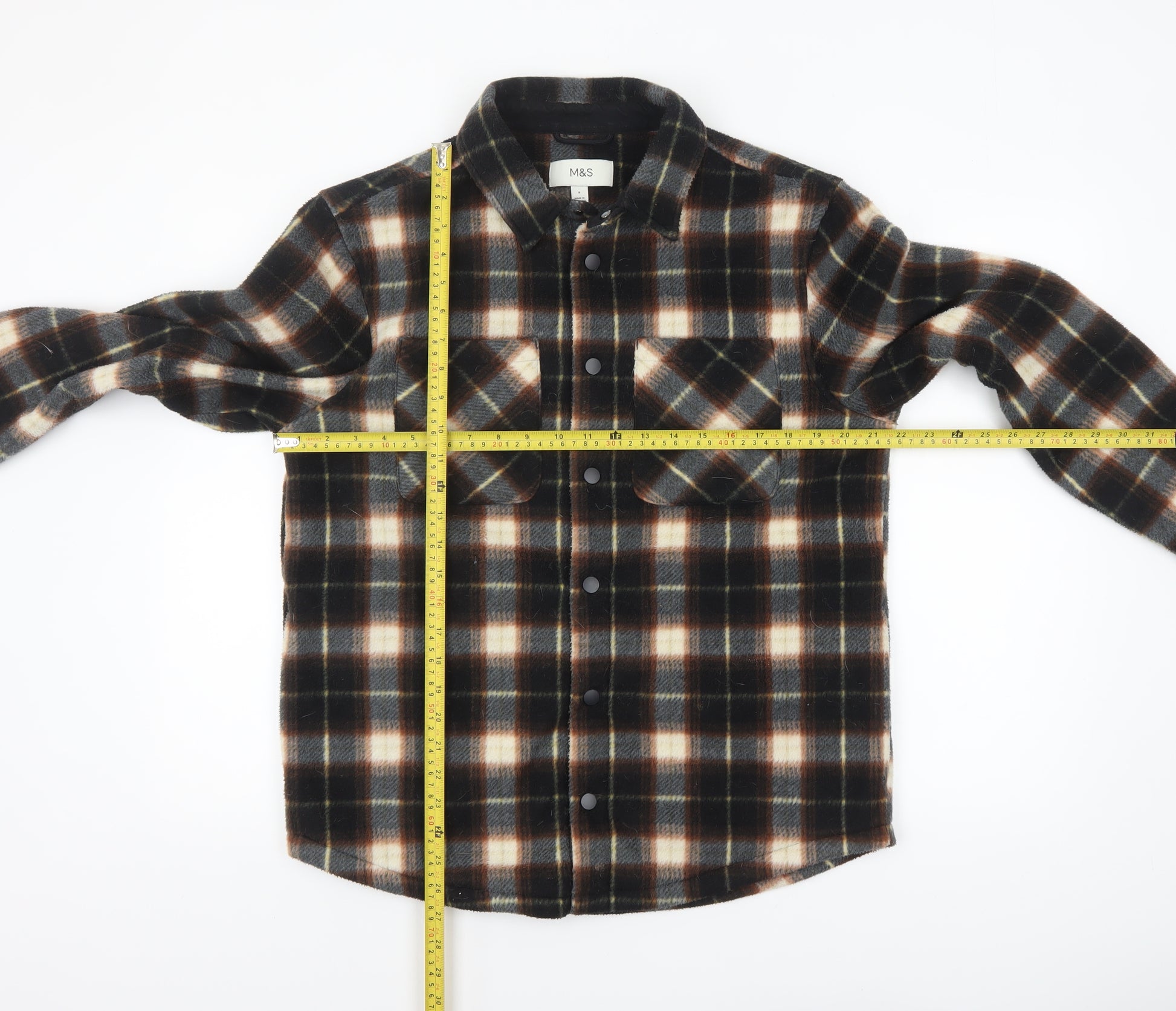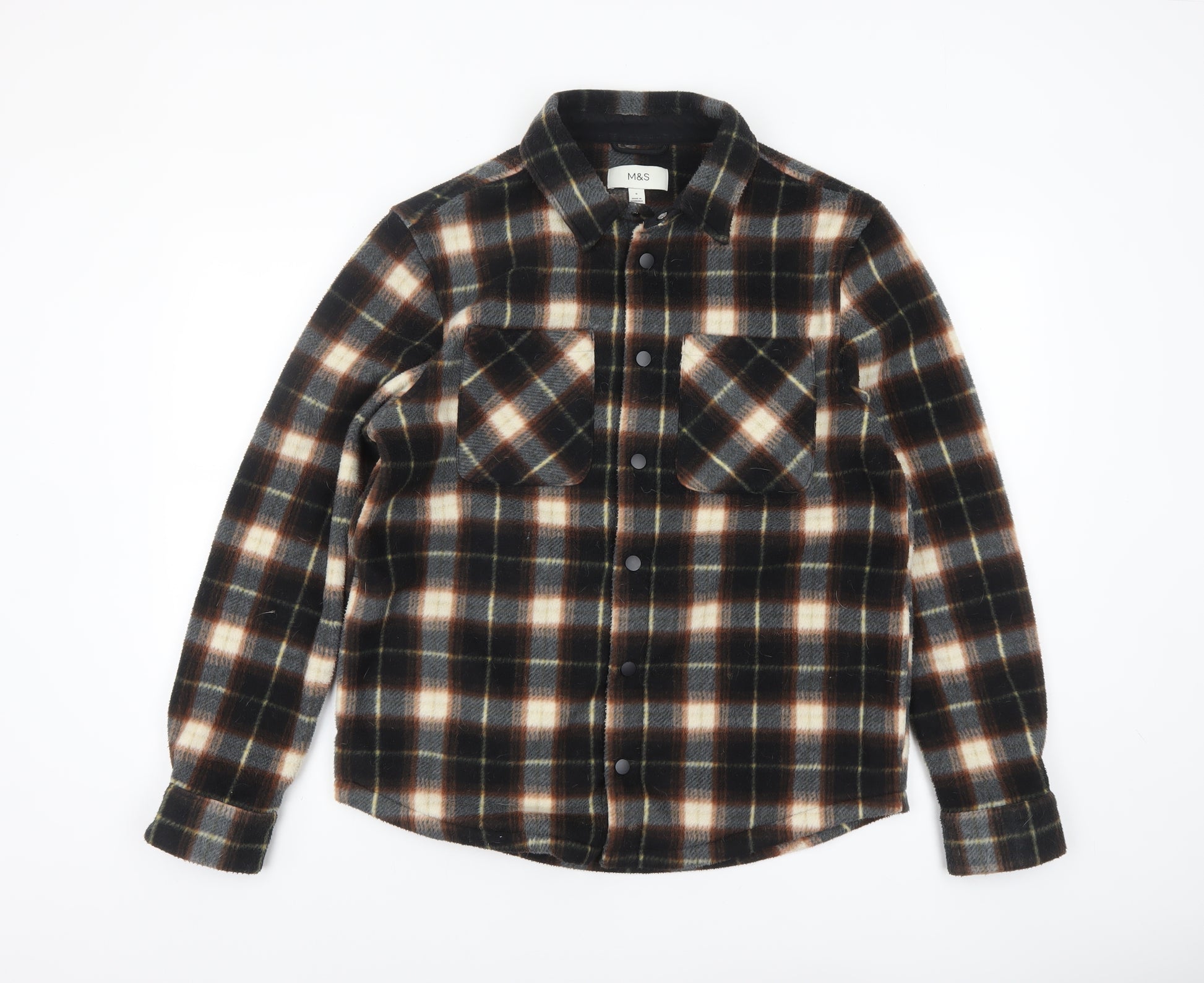 This Marks and Spencer men's check flannel jacket combines warmth, comfort, and timeless style. Crafted from 100% polyester, it offers the luxurious softness of flannel while remaining lightweight and durable. The brown and cream check pattern adds a classic appeal, making it a versatile piece that works perfectly for both relaxed weekends and casual outings. Designed with a traditional button fastening, collared neckline, and dual large chest pockets, the jacket reflects a workwear-inspired aesthetic that's both rugged and refined. The mid-length regular fit ensures comfort and easy layering over shirts or knitwear. Fully lined for extra warmth, this jacket is ideal for the colder months of autumn and winter, providing breathable insulation without being bulky. The polyester composition makes it easy to care for—machine washable and quick drying—ensuring practicality for everyday wear. With its sturdy construction and effortlessly stylish design, it can elevate a simple jeans and t-shirt outfit or be paired with chinos for a neatly put-together look. The subtle M&S branding ensures quality and reliability, while the checked pattern keeps it in line with current fashion trends. Suitable for casual occasions and outdoor walks, it’s a great addition to any modern wardrobe. Perfect for men who value both comfort and understated sophistication, this Marks and Spencer jacket delivers excellent value and timeless charm.