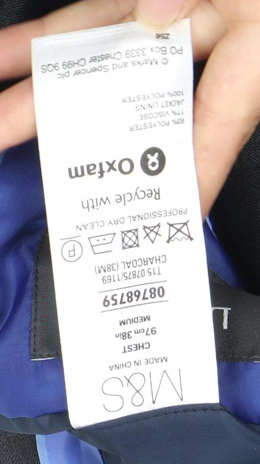 Elevate your wardrobe with this sleek Marks and Spencer men's suit jacket, perfect for business and formal occasions. Crafted in a versatile charcoal grey, this jacket combines sophistication with practicality. Tailored to a medium size, it features a chest size of 38 inches, ensuring a comfortable fit.Constructed from a blend of premium materials, 63% polyester and 17% viscose, the jacket offers both comfort and durability. The lining is 100% polyester, providing a smooth finish that enhances wearability. Designed with a notch lapel style and a single-breasted cut, it boasts a modern aesthetic that aligns with contemporary fashion trends.The jacket includes not just style, but functionality too, featuring inner pockets perfect for holding small essentials discreetly. It sports a two-button front design and a three-button sleeve style, all contributing to a polished look that's ideal for any formal setting. The single-vented back adds an element of comfort and ease of movement, making it a practical choice for long business days or important events.This Marks and Spencer jacket is well-maintained and shows minimal signs of wear, ensuring a professional appearance whenever you wear it. As a testament to its quality, it is recommended that this garment is dry cleaned only.Whether it's a business meeting, a formal event, or any occasion that demands elegance, this jacket is a valuable addition to any man's wardrobe. Invest in timeless style and impeccable quality with this standout piece.
