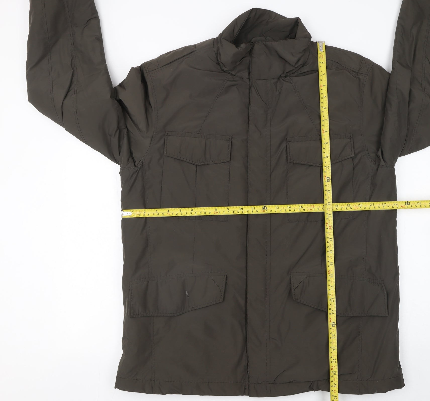 Stay protected and comfortable in this Marks and Spencer men's dark taupe waterproof jacket, designed for both style and practicality. Crafted from 100% polyester, the jacket offers durability and a sleek finish while staying lightweight enough for everyday wear. Fully lined with polyester padding, it provides added insulation, making it perfect for cool autumn and winter days. The water-resistant feature ensures you remain dry during light rain, while the smooth, microfibre-like finish gives it a modern touch. Featuring a full zip closure with a wind-protective flap, four practical front pockets, and an adjustable stand-up collar, this coat balances function with timeless design. The mid-length cut offers a flattering fit, and its roomy pockets add convenient storage for essentials. Ideal for walking, travel, or casual outings, this piece combines effortless style with weather-ready performance. Finished in a sophisticated dark taupe shade, it pairs easily with jeans, chinos, or outdoor trousers for a smart yet comfortable outdoor look. Perfect for the fashion-conscious man who appreciates practicality, this Marks and Spencer waterproof jacket remains a wardrobe essential through unpredictable British weather. Though gently used, with only a small white mark on one pocket, it retains excellent overall condition and quality construction. Built with Marks and Spencer’s typical focus on durability and comfort, this jacket promises warmth, versatility, and elegant protection in equal measure.