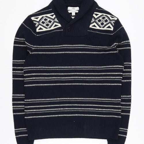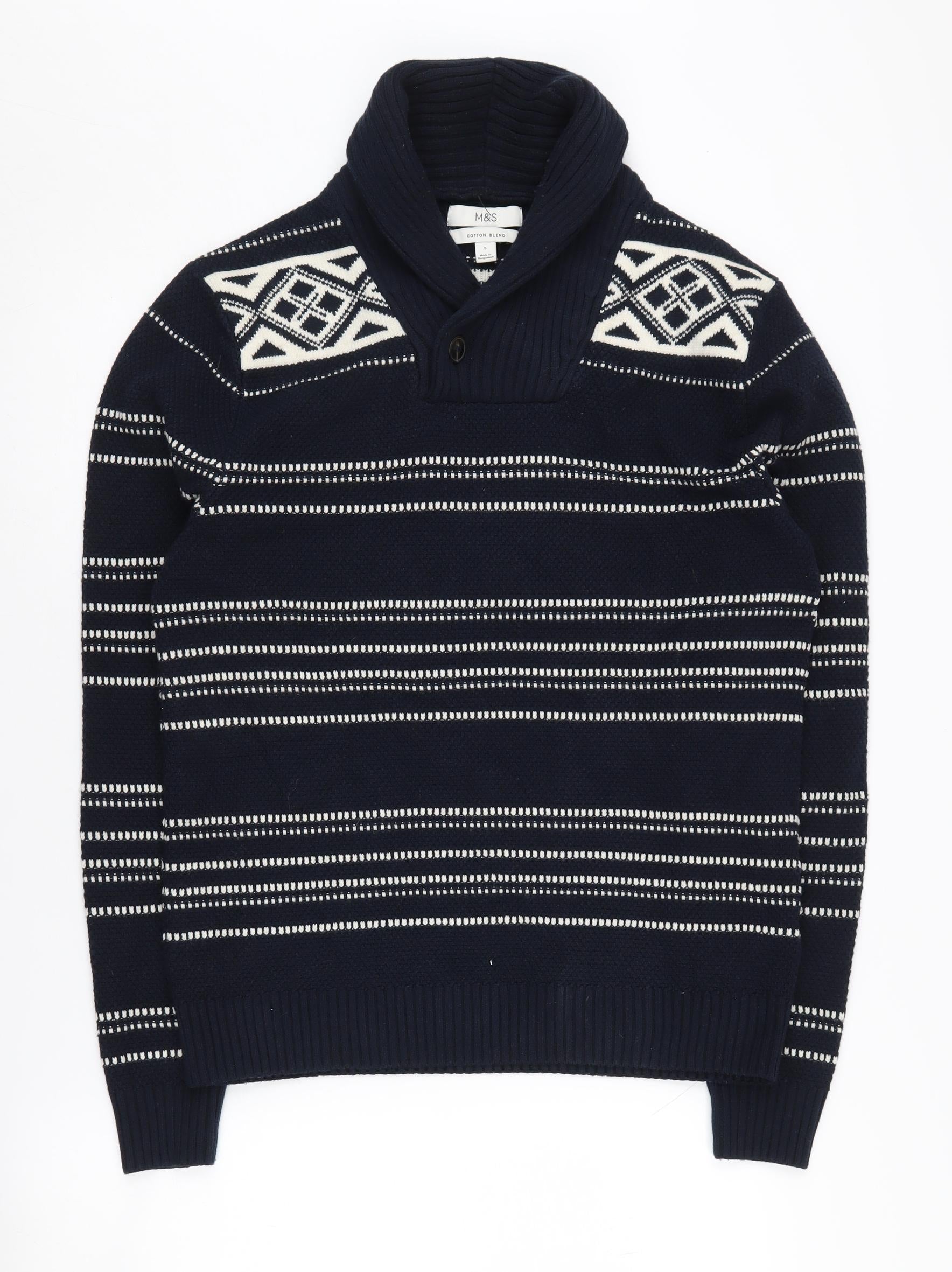 Elevate your winter wardrobe with this stylish Men's Geometric Cotton Blend Jumper from Marks and Spencer. Tailored in a regular fit, this pullover is perfect for keeping warm and looking sharp during the cooler months. Crafted from a comfortable blend of 61% polyester and 39% cotton, it ensures a cosy feel while offering exceptional durability. Featuring a distinct geometric pattern in a sophisticated multicoloured palette, this jumper is ideal for casual outings and everyday wear. The collared neckline adds a touch of elegance while maintaining a laid-back style. Easy to care for with its machine washable fabric, this jumper is a practical addition to your Autumn and Winter attire. Available in size S, this piece is designed to fit well and offer maximum comfort. Whether you're heading out for a casual stroll or meeting friends, this jumper is sure to make a statement. Add this essential piece to your collection and experience the perfect blend of style and comfort.