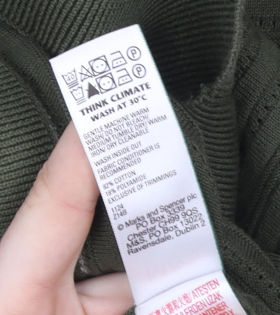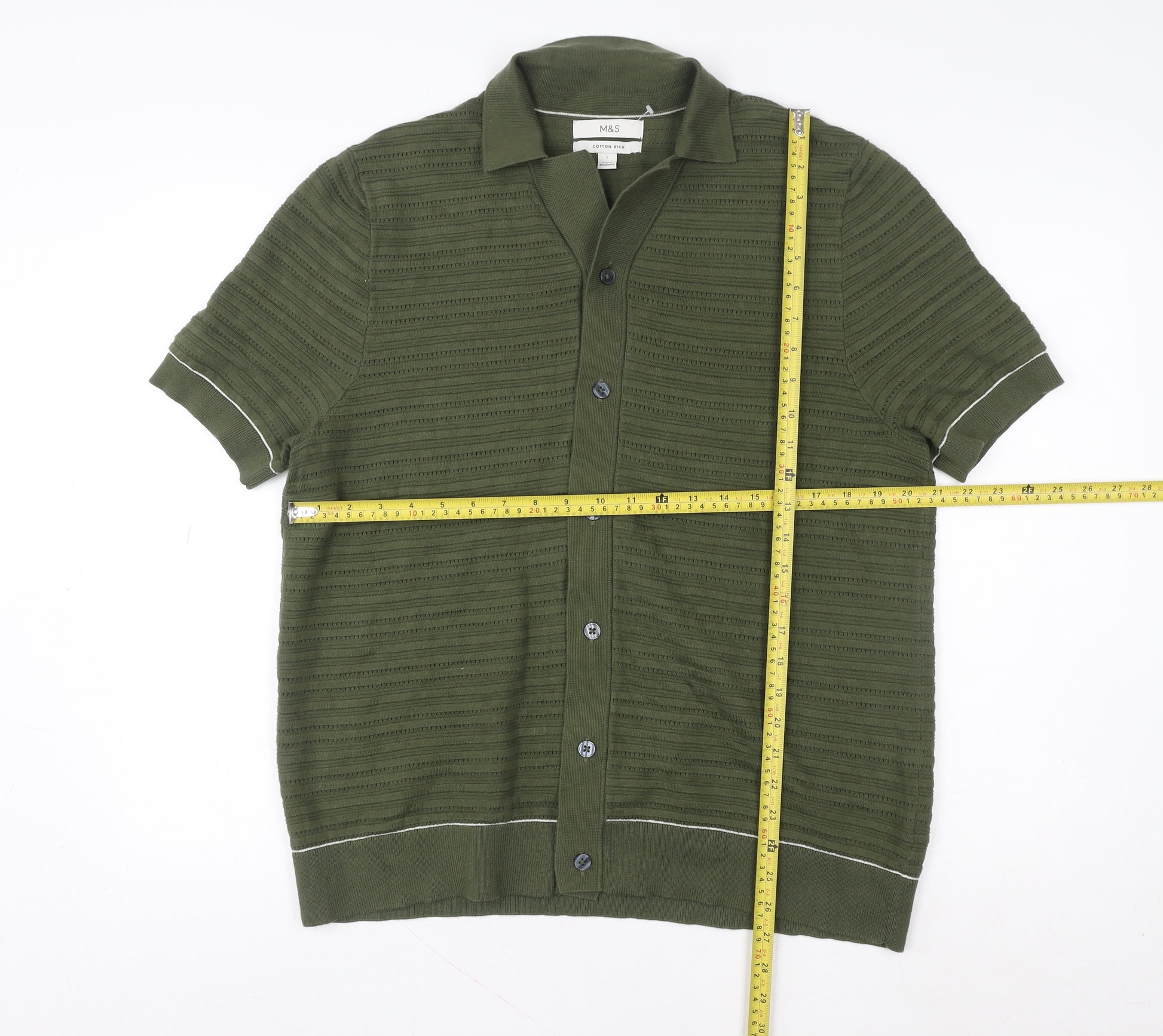 Step into timeless style and everyday comfort with this Marks and Spencer men’s cotton-rich polo shirt. Crafted from a breathable and soft knit blend of 82% cotton and 18% polyamide, this shirt delivers lightweight, airy wear suitable for the warmer months. The dark moss green tone offers a refined yet casual look, perfect for complementing both smart and relaxed outfits. Designed for an easy, regular fit, this polo ensures flexibility and comfort, making it ideal for everyday wear. The button-through front and classic collared neckline lend a vintage-inspired touch while maintaining a distinctly modern aesthetic. Textured detailing across the knit fabric adds depth and visual interest without compromising simplicity. The short sleeves and open knit structure keep you cool through spring and summer, while the subtle contrast trim near the cuffs and hem enhances the shirt’s character with understated sophistication. Practical as well as stylish, this polo benefits from machine washability and an easy-care finish for hassle-free maintenance. Whether paired with chinos for a weekend outing, tailored shorts for a casual lunch, or jeans for an off-duty look, this polo adapts effortlessly to different occasions. It’s a versatile addition to any wardrobe, representing the high standard of craftsmanship and comfort associated with Marks and Spencer. In excellent condition with no visible flaws, this pre-loved piece has been carefully inspected to ensure quality. Perfect for the modern man who values enduring style and everyday practicality, this green knit polo shirt blends polished detailing with casual comfort—ideal for enhancing any smart-casual ensemble across multiple seasons.