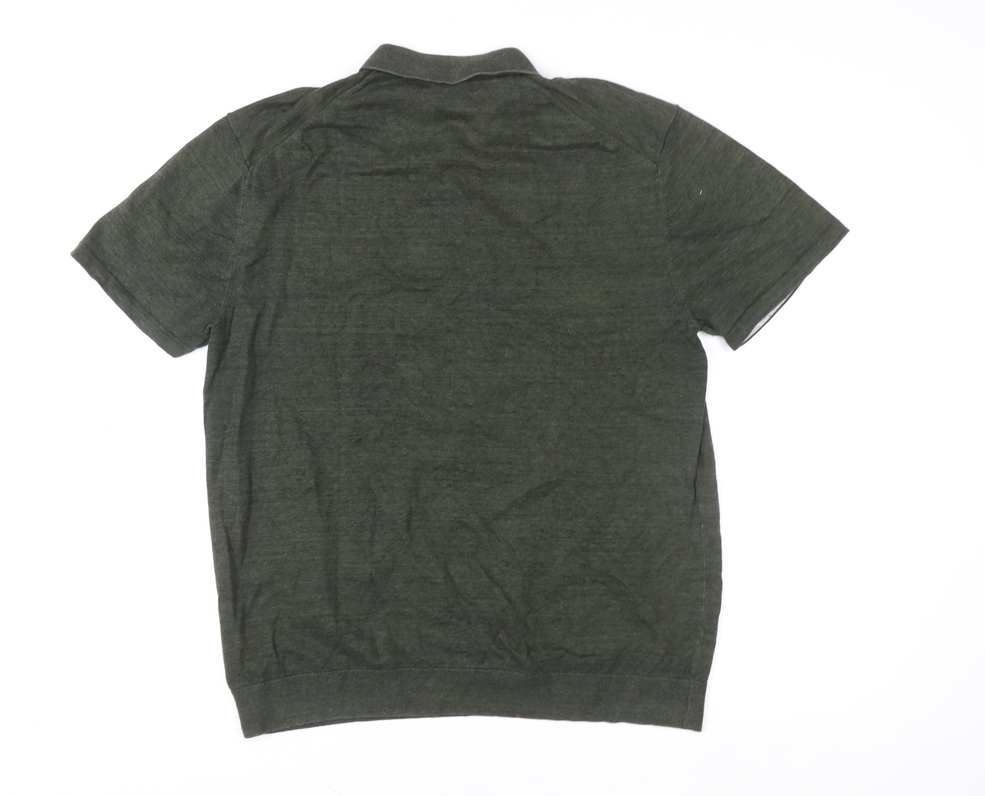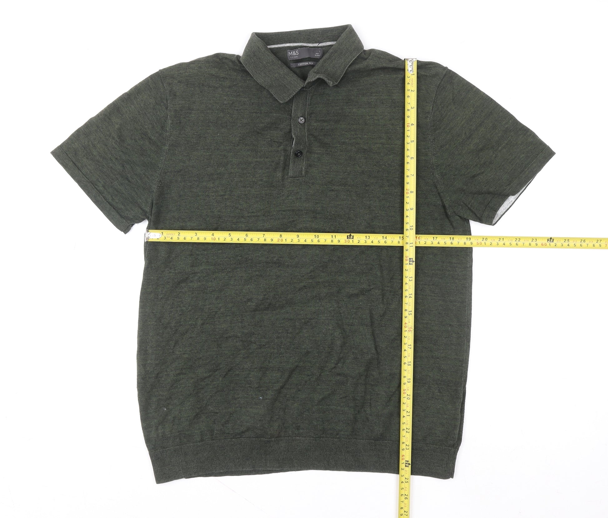 Enhance your casual wardrobe with this stylish Marks and Spencer men's polo shirt in a classic green tone. Designed for comfort and everyday wear, it features a soft cotton-rich fabric blend for a breathable and lightweight feel, ideal for warmer days or layering under a casual jacket. The polo showcases a traditional collared neckline with a three-button placket and short sleeves, finished with a ribbed hem and cuffs that lend a neat fit. Made in Myanmar, this quality garment represents Marks and Spencer’s signature craftsmanship and timeless appeal.The solid green shade offers versatility to pair effortlessly with chinos, jeans, or shorts. Cut in a regular fit, it provides ample comfort without compromising on shape, ensuring a composed appearance whether worn at home, on a weekend outing, or for casual work settings. The cotton-rich composition enhances softness while maintaining durability through repeated washing and wear. Easy to maintain, this machine-washable polo makes everyday dressing simple and convenient.Perfect for men who appreciate understated style, this piece carries subtle branding, clean lines, and a polished finish. The breathable and lightweight fabric ensures that you stay comfortable from morning to evening, whether running errands or enjoying a relaxed brunch. Its solid tone and classic structure make it a wardrobe staple across multiple seasons, especially suitable for spring, summer, and autumn wear. With its minimal design and comfortable cut, this Marks and Spencer polo shirt adds a touch of refinement to casual ensembles without losing its relaxed appeal.Offered in excellent pre-owned condition, the shirt shows light wear but no noticeable defects, keeping it attractive and ready for immediate wear. Upgrade your off-duty look with this well-crafted, easy-to-style polo, combining comfort, quality, and timeless British design for everyday versatility.