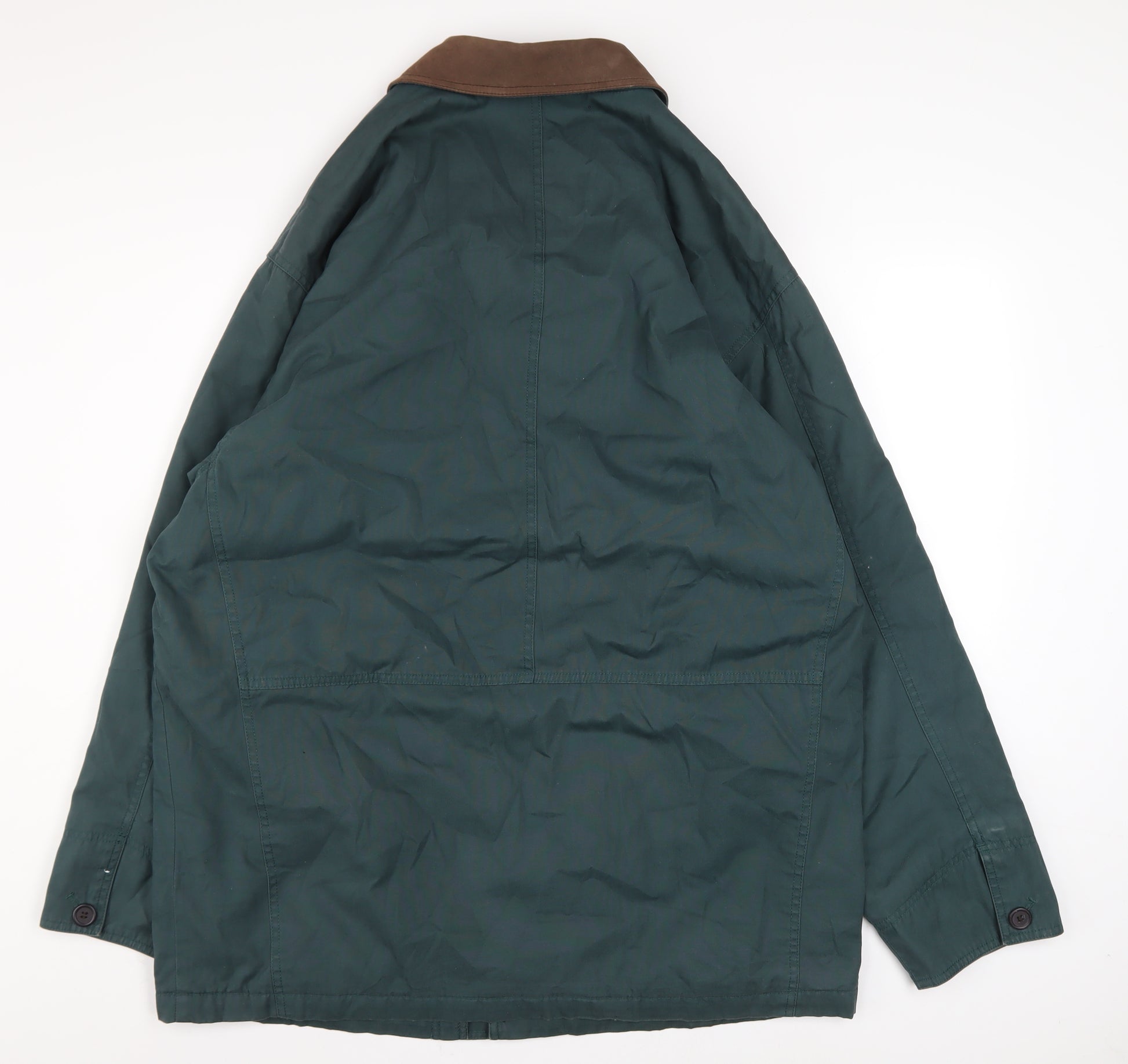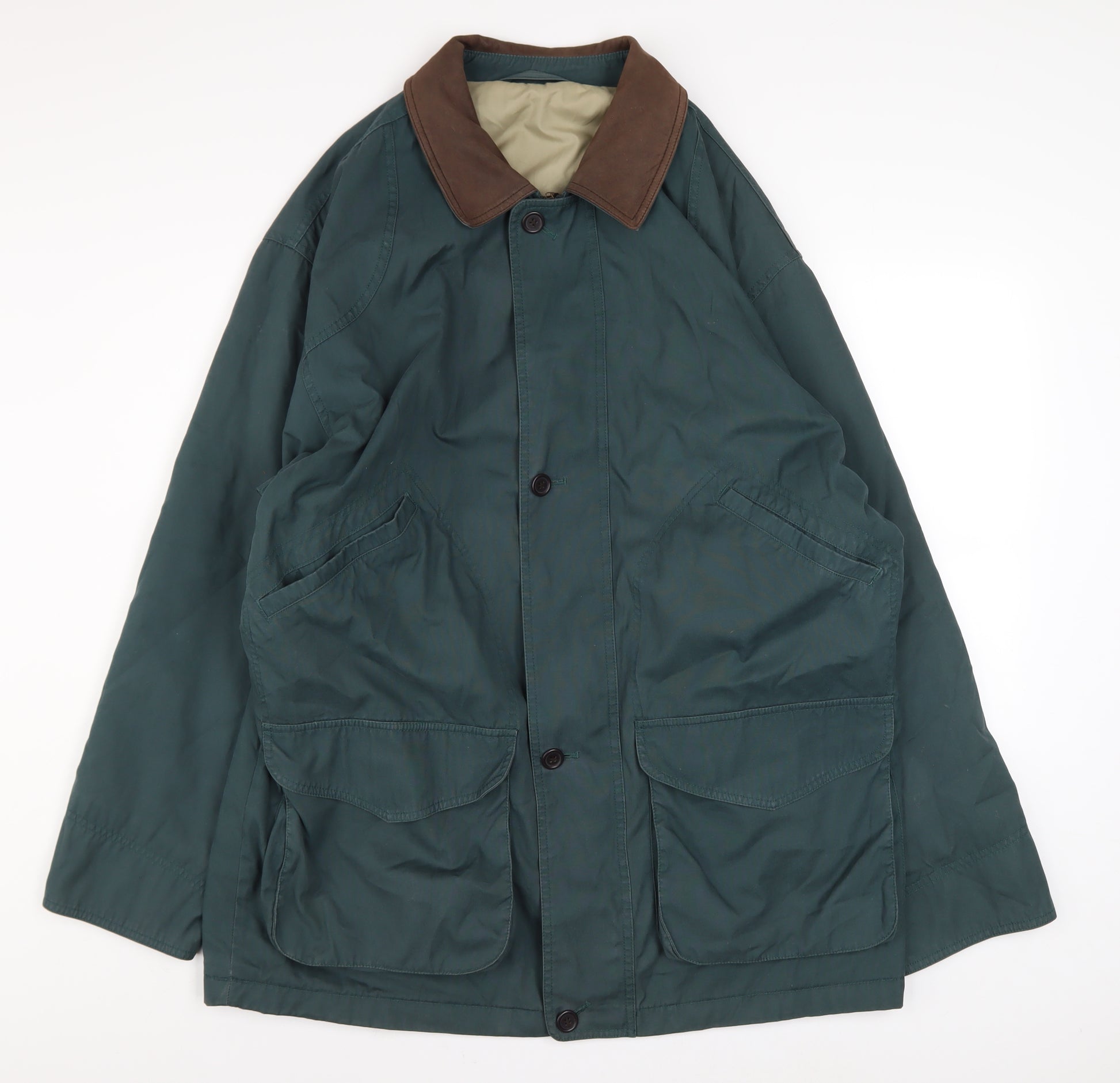 This Marks and Spencer men's overcoat offers a timeless country-inspired design combining classic tailoring with durable functionality. Crafted from a high-quality blend of 65% polyester and 35% cotton, the jacket is both robust and comfortable, ideal for cooler months. The dark slate green colour gives it a versatile and sophisticated look, complemented by a soft genuine leather collar for added texture and refinement. Designed in a regular fit, this mid-length jacket provides a practical yet stylish outer layer suitable for daily wear, countryside walks, and casual outings. The button front closure and multiple spacious pockets add convenience and a touch of heritage style, reminiscent of traditional outdoor coats. Inside, a full polyester lining enhances comfort and warmth, making it perfect for autumn and winter wear. Small signs of use are present, such as light marks on the fabric, but these are minor and do not detract from its overall appearance. This jacket retains its structure, stitching strength, and durable feel, ensuring it remains wearable for years to come. This Marks and Spencer piece, originally labelled under the 'St Michael' line, represents enduring British quality and design. It balances timeless charm with functionality, finished with details like button cuffs and a smart spread collar. Ideal for layering over knitwear, it transitions seamlessly between rural countryside walks and casual city wear. For the man who appreciates understated style and reliable craftsmanship, this overcoat is an excellent addition to the wardrobe. Practical yet stylish, it achieves a relaxed refinement ideal for a wide range of activities. A great find for lovers of heritage menswear looking for warmth, durability, and timeless appeal in one garment.
