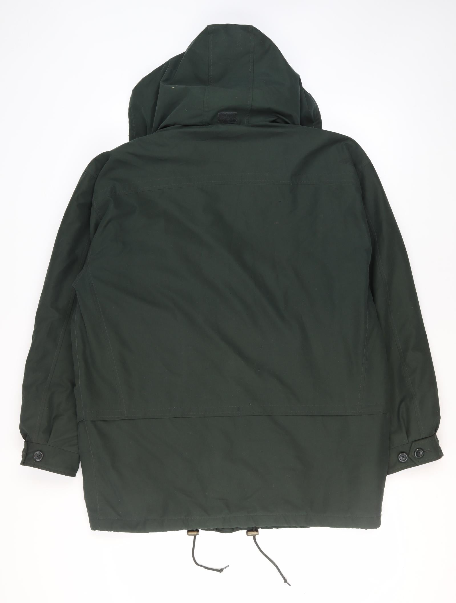 Stay comfortable and stylish with this Marks and Spencer utility parka jacket, perfect for Autumn and Winter outings. Crafted for men, this medium-sized parka features a rich green colour, offering a versatile addition to your wardrobe. Its durable polyester outer shell and softshell fabric type ensure both comfort and functionality. This mid-length jacket is designed with hiking and casual travel in mind, providing practicality with a breathable and waterproof finish. The jacket comes with multiple features including a hood, zip closure, and button accents for convenience and style. The stand-up collar adds an extra touch of warmth, while the regular fit ensures easy layering. Ideal for both the outdoors and urban settings, it's machine washable for easy care, making it a perfect choice for adventurous souls.