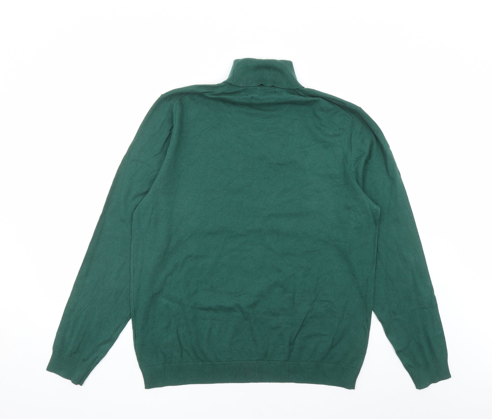 Mens Green Roll Neck Cotton Pullover Jumper Size L Long Sleeve