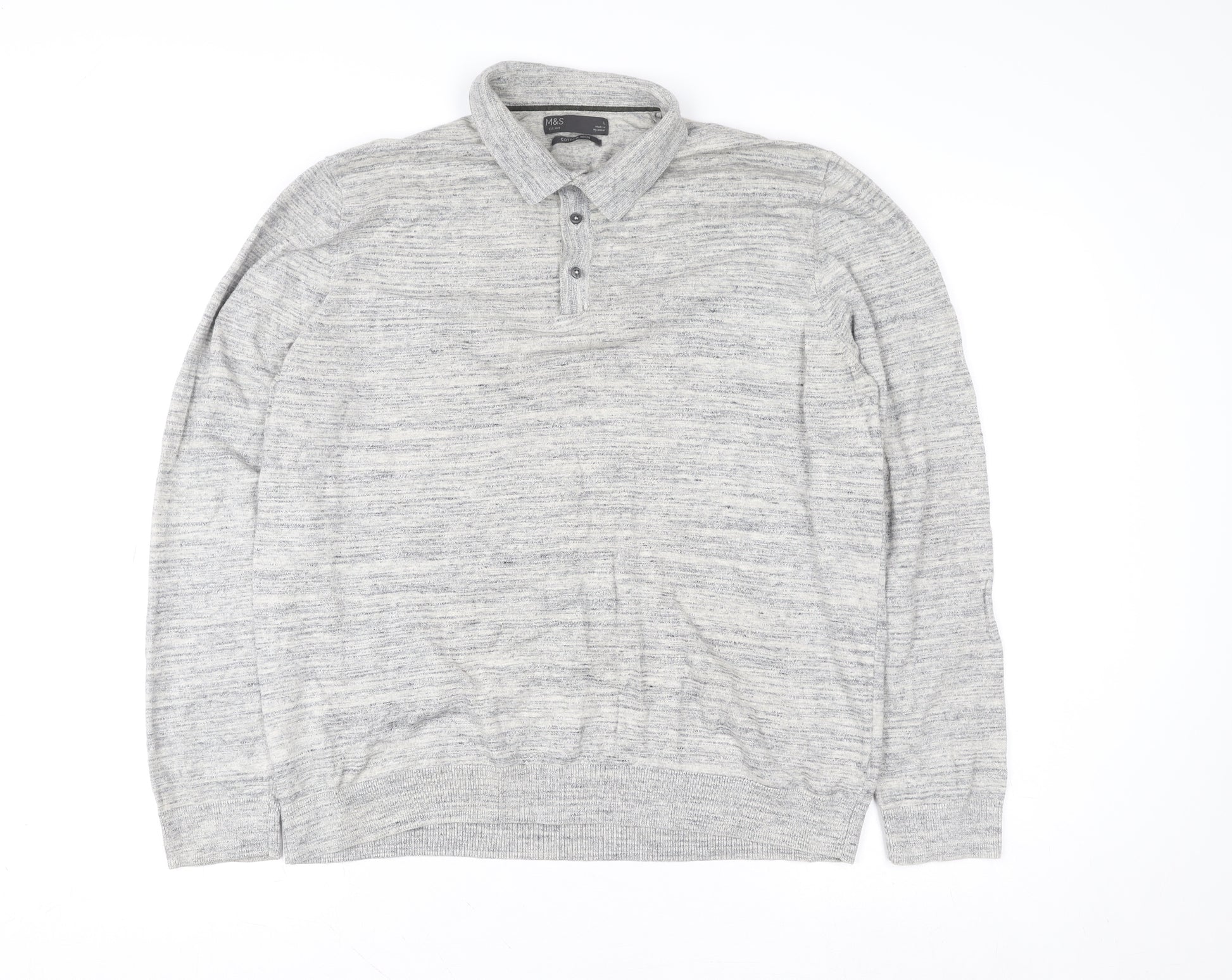 Elevate your casual wardrobe with this stylish Marks and Spencer men's cotton-rich henley sweatshirt in light grey. Expertly crafted to blend comfort with understated sophistication, this piece is perfect for layering throughout the cooler months. Made with a breathable and lightweight knit fabric, it offers a soft texture that sits comfortably against the skin. The collared neckline and three-button placket lend a refined touch to this versatile garment, making it equally suitable for relaxed weekends or smart-casual occasions.The sweatshirt is designed in a regular fit, ensuring comfort and freedom of movement without compromising on shape. The long sleeves feature ribbed cuffs for a secure fit, while the hemline is subtly elasticated to maintain its structure. Crafted from a cotton-rich blend with a touch of polyester for durability, it promises both softness and lasting quality. The understated grey hue offers effortless versatility, pairing seamlessly with jeans, chinos, or joggers.This henley sweatshirt embodies Marks and Spencer’s timeless attention to detail and commitment to comfort, suitable for everyday wear in autumn, spring, and winter. The simple knit texture and button accents keep the look clean and classic, ensuring it remains a smart staple in any man’s wardrobe.In excellent pre-loved condition, showing minimal signs of wear and no visible defects, this garment has been carefully checked to ensure its quality. Whether worn under a jacket or solo for an effortlessly polished yet casual appearance, this Marks and Spencer light grey sweatshirt is ideal for anyone seeking a refined everyday essential that blends modern comfort with enduring style.
