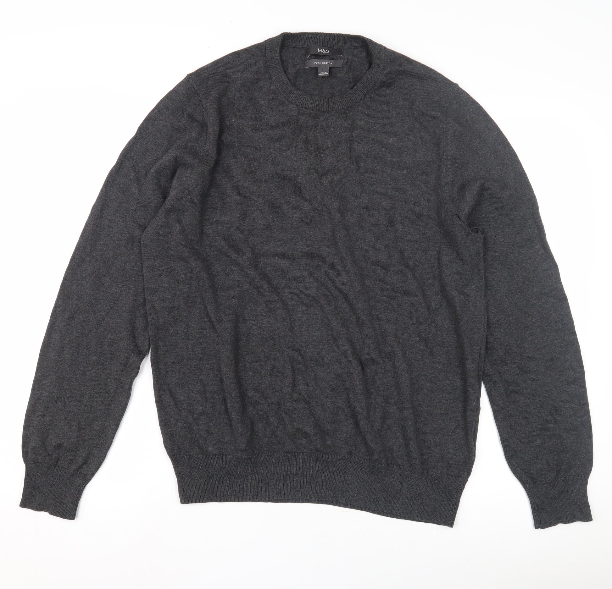 Elevate your everyday style with this classic grey pullover from Marks and Spencer, designed for the discerning man who values both comfort and quality. Crafted from 100% pure cotton, this jumper offers a smooth, soft touch that makes it perfect for those cooler autumn and winter days. Its regular fit ensures it sits comfortably, whether you are dressing up for a casual outing or layering it for warmth on an adventurous weekend. The subtle crew neck design along with its long sleeves make it an ideal addition to any wardrobe, providing a versatile piece that pairs effortlessly with jeans or chinos. Its neutral grey shade complements various colours, adding a touch of refined simplicity to your outfit. With its knit fabric construction, this pullover promises durability and breathability, making it a reliable choice for everyday wear. Despite being slightly worn, it remains in excellent condition, showcasing only minor signs of previous use. This Marks and Spencer jumper is a must-have for anyone seeking an elegant yet practical garment at a reasonable price. Don't miss out on this opportunity to enhance your wardrobe with a piece that embodies both style and substance.