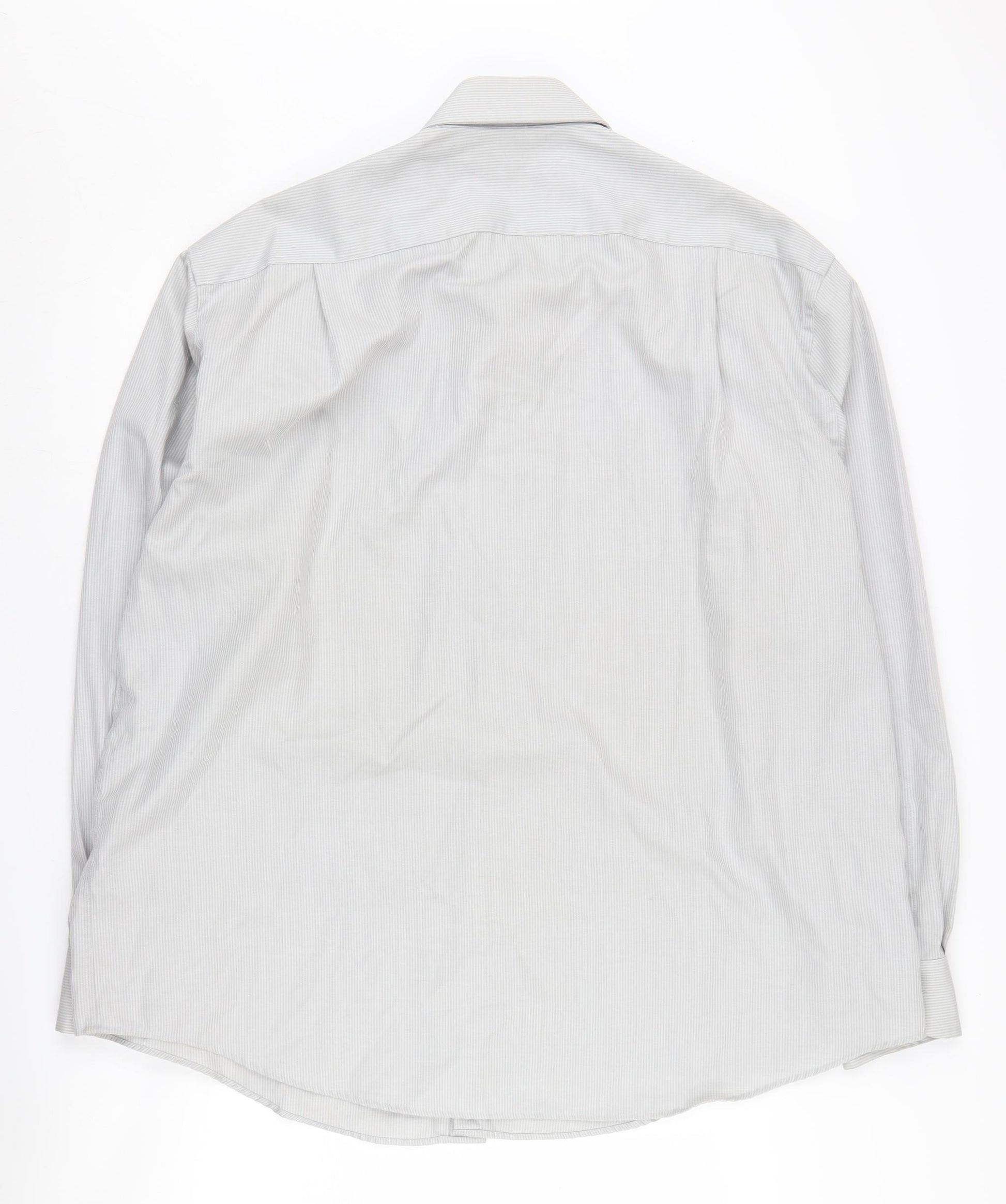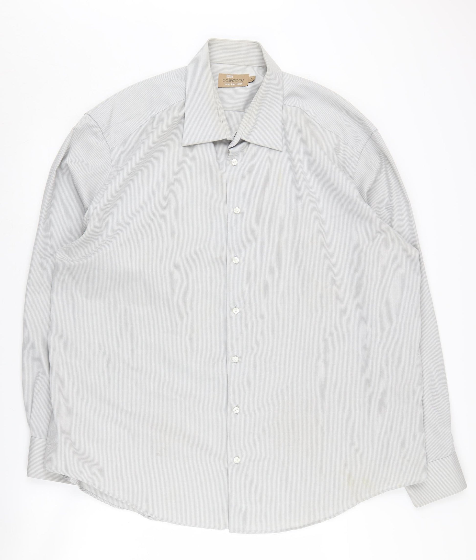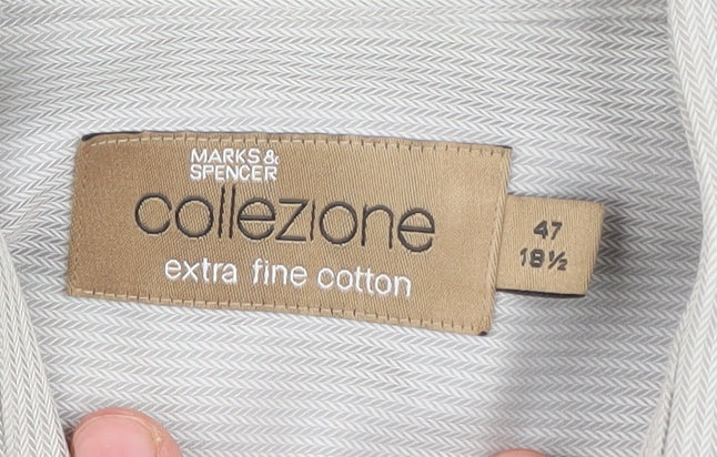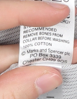 Elevate your casual wardrobe with this Marks and Spencer Men's Grey Herringbone Button-Up Shirt. Crafted from 100% cotton for a comfortable and breathable fit, this shirt is perfect for a day at the office or a casual weekend outing. The subtle herringbone pattern adds a touch of sophistication, while the classic long sleeves and collared neckline ensure a timeless look. With a chest size of 18.5 inches and available in size 47, this versatile piece is designed to fit seamlessly into any style. The button closure adds a classic finish, making it easy to style with both jeans and trousers. Despite slight signs of wear, including small stains on the front, this shirt remains in good condition and is perfect for those looking for quality at a great price. Machine washable for easy care, this shirt is a reliable addition to any fashion-forward individual's collection. Don't miss the chance to own this stylish piece today.