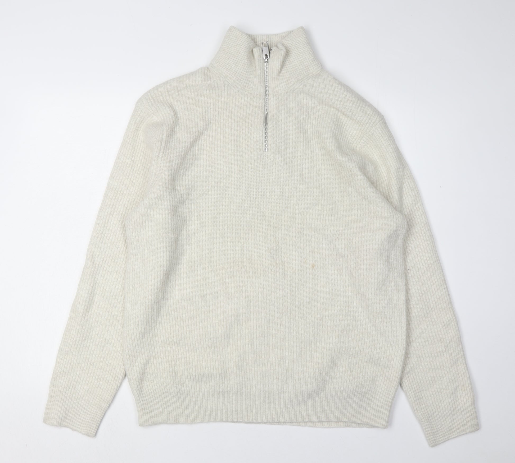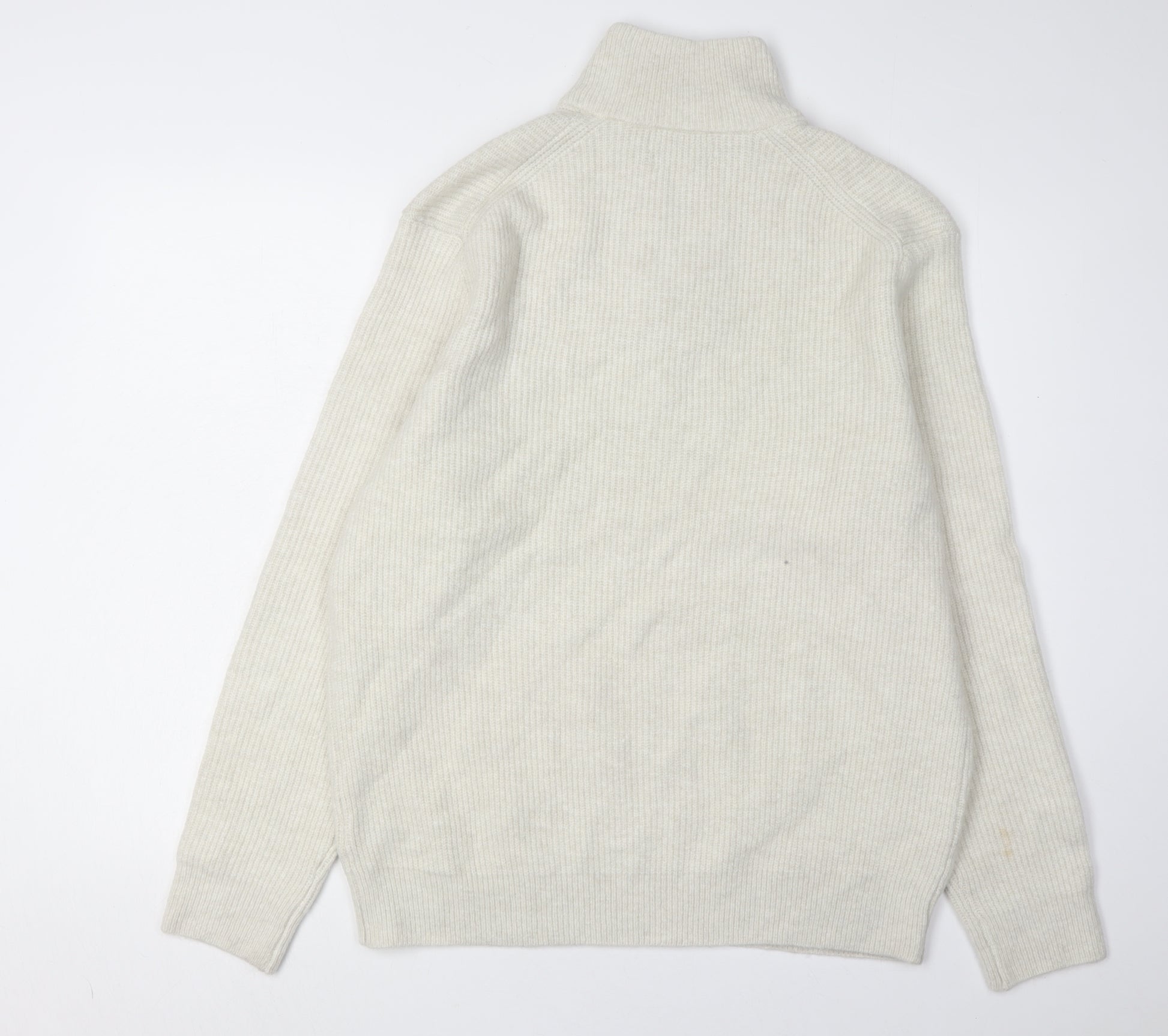 Elevate your casual wardrobe with this chic Marks and Spencer Men's Jumper, beautifully crafted in a timeless ivory shade. Made with a blend of high-quality materials including Acrylic, Polyamide, and Wool, this jumper ensures warmth and comfort during the autumn and winter months. The high-neck and half-zip design provide a modern touch, allowing for versatile styling options. Perfect for a relaxed yet stylish look, it's suitable for a variety of occasions, from casual outings to cosy evenings at home. The regular fit and stretchy knit fabric offer ease of movement, while being machine washable adds to its convenience. Although there is slight discolouration on the front, the overall condition remains very good, ensuring longevity and durability. Priced attractively, this jumper combines style and practicality, making it an ideal addition to your collection.