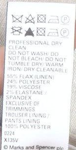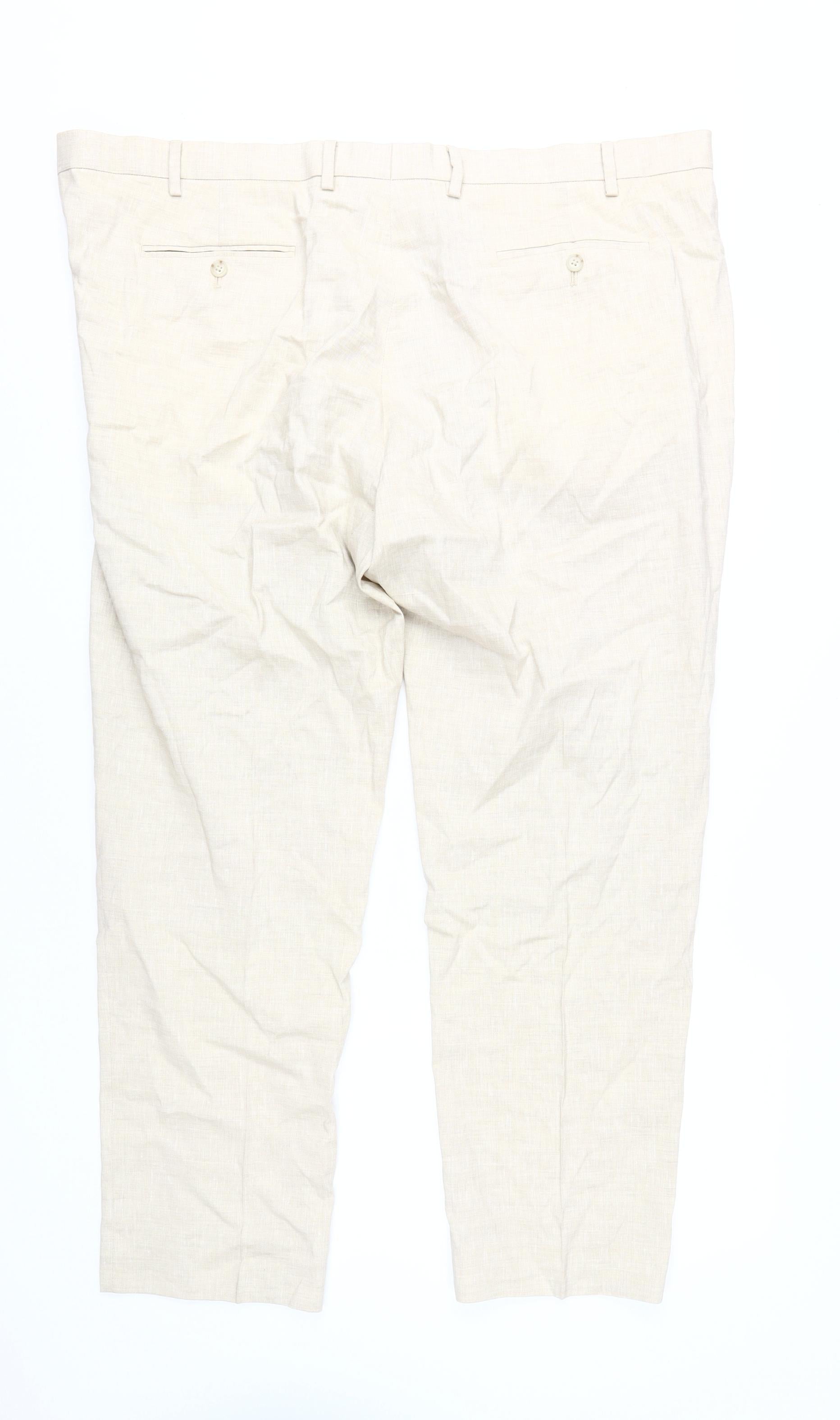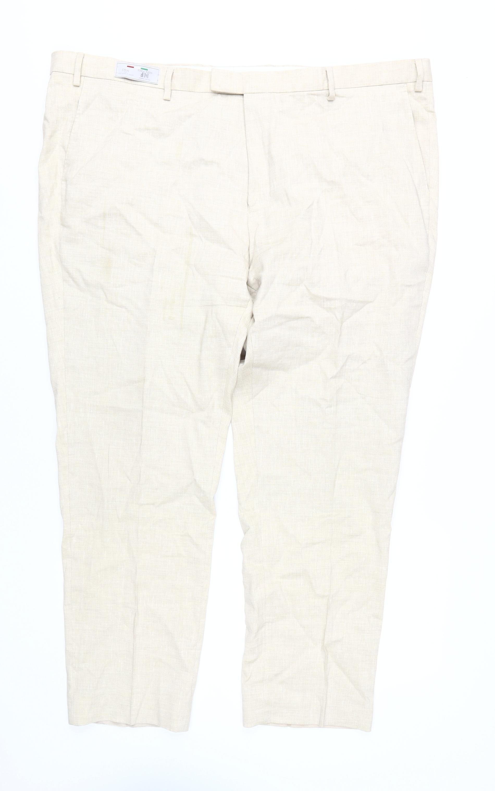 Step into timeless style and comfort with these Marks and Spencer Men's Chino Trousers. Perfectly tailored for the modern man, these trousers feature a sophisticated ivory hue that's ideal for both casual outings and more formal occasions. The trousers are crafted from a premium linen blend, combining linen, polyester, viscose, and a touch of elastane to provide a light, breathable, and slightly stretchy fabric that ensures comfort throughout the day. Designed with a mid-rise and flat front, these chinos offer a classic straight leg fit that flatters any silhouette. With practical slash pockets and a reliable button and zip closure, they are as functional as they are fashionable. Ideal for spring and summer wear, these trousers can easily be paired with a crisp shirt for a polished look, or dressed down with a tee for a laid-back vibe. Despite being pre-owned, the trousers remain in excellent condition with only minor creasing, ensuring they look pristine and ready for any occasion. Opt for these versatile and stylish chinos to elevate your wardrobe effortlessly.