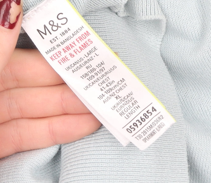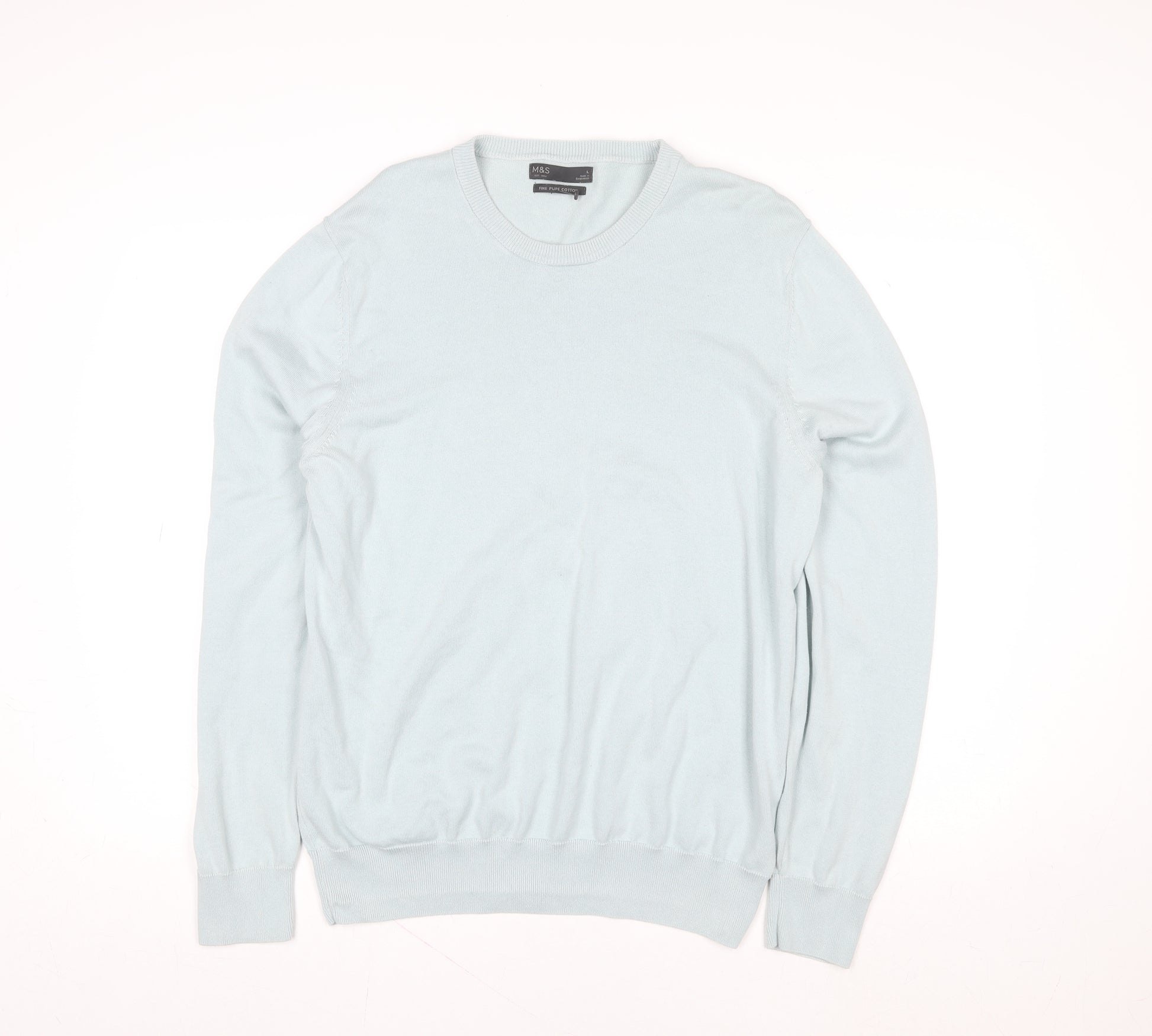 Refresh your everyday wardrobe with this elegant Marks and Spencer men’s light blue crew neck sweatshirt. Crafted from 100% fine pure cotton, it offers a soft, breathable feel that provides lasting comfort throughout the seasons. Its simple pullover design and regular fit deliver an easy-to-wear, effortlessly classic silhouette suitable for both casual and smart-casual settings. The lightweight knit texture adds a refined touch, making it ideal for layering over shirts or wearing solo for a clean, understated look.Designed for versatility, this long sleeve sweatshirt features ribbed cuffs, hem, and neckline for a gently fitted finish that holds its shape wash after wash. The cool pastel tone complements any wardrobe, pairing perfectly with jeans, chinos, or trousers for a laid-back, confident aesthetic. Perfect for transitional seasons like spring and autumn, yet warm enough for cooler winter days, it’s an all-seasons essential that balances style and practicality with ease.Made with durability and comfort in mind, this Marks and Spencer piece reflects the brand’s long-standing reputation for dependable quality. The pure cotton composition ensures breathability and a naturally soft touch, while the easy, machine-washable care instructions make it low-maintenance and ideal for everyday wear. Whether you’re heading out for a relaxed weekend, working remotely, or meeting friends, this sweatshirt offers both comfort and clean, modern style.In excellent pre-owned condition with only minimal signs of wear, it has been carefully checked to ensure quality and appearance. A timeless addition to any collection, this men’s pullover exemplifies the best of simple British design: practical, comfortable, and effortlessly stylish. Add this Marks and Spencer classic to your wardrobe today for a versatile, everyday look that never goes out of fashion.