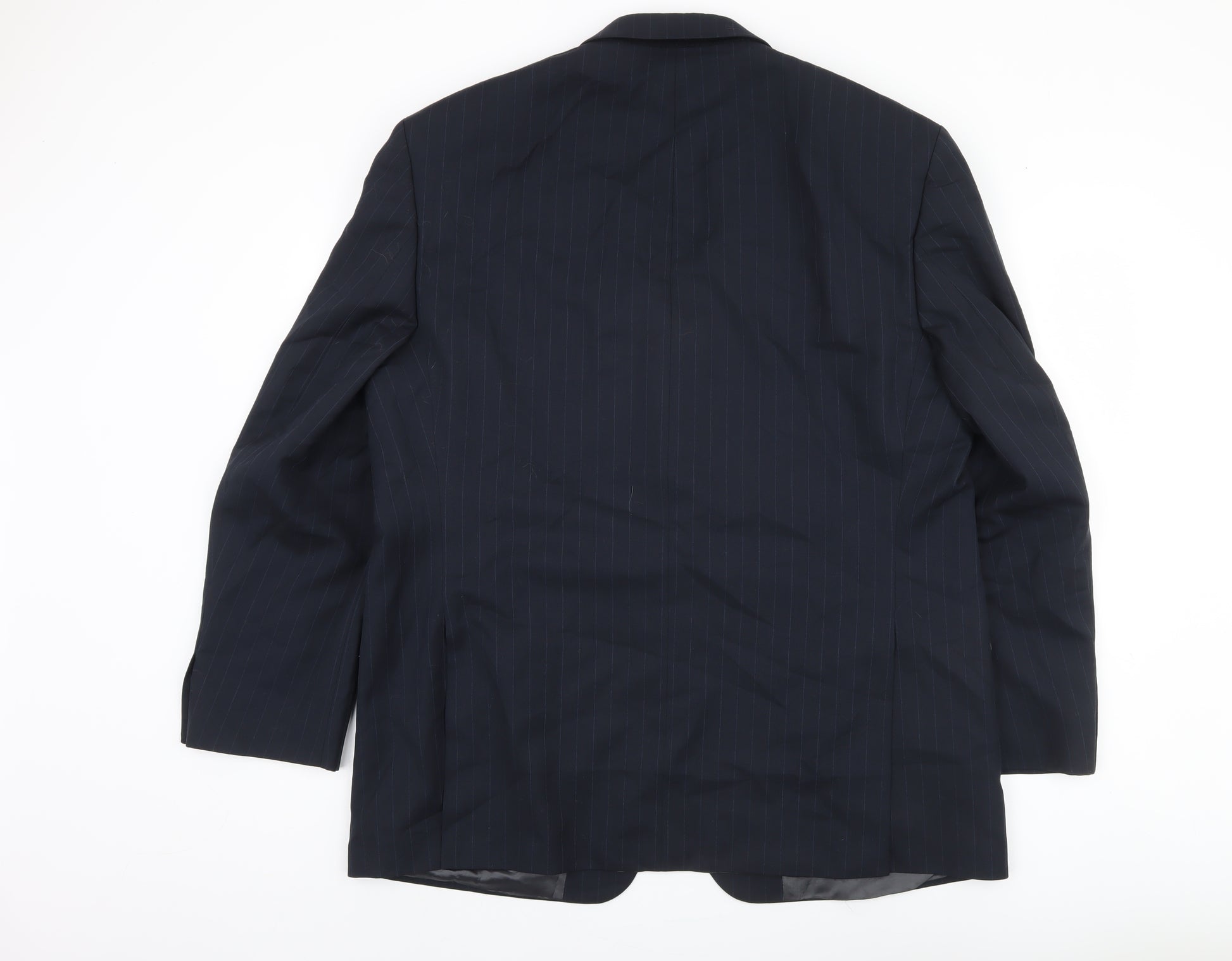 Elevate your formal attire with this sophisticated Marks and Spencer navy suit jacket, perfect for business and formal occasions. Crafted in Portugal, this vintage piece is a testament to timeless elegance with its sharp notch lapel and understated striped pattern. Made from 100% pure wool, this jacket ensures both luxury and warmth throughout the autumn and winter seasons. Its regular fit and size 46M design offer comfort with a touch of tailored finesse, while the double-vented back enhances mobility and style. The single-breasted, two-button front closure adds a modern twist to this classic look. With practical features such as inner pockets, it combines functionality with fashion seamlessly. The jacket, lined with 100% viscose, provides a smooth, refined finish. Ideal for a discerning gentleman, this Marks and Spencer jacket is an exemplary piece for a wardrobe staple. Experience the perfect blend of comfort and elegance, whether you're attending a formal gathering or a business meeting.