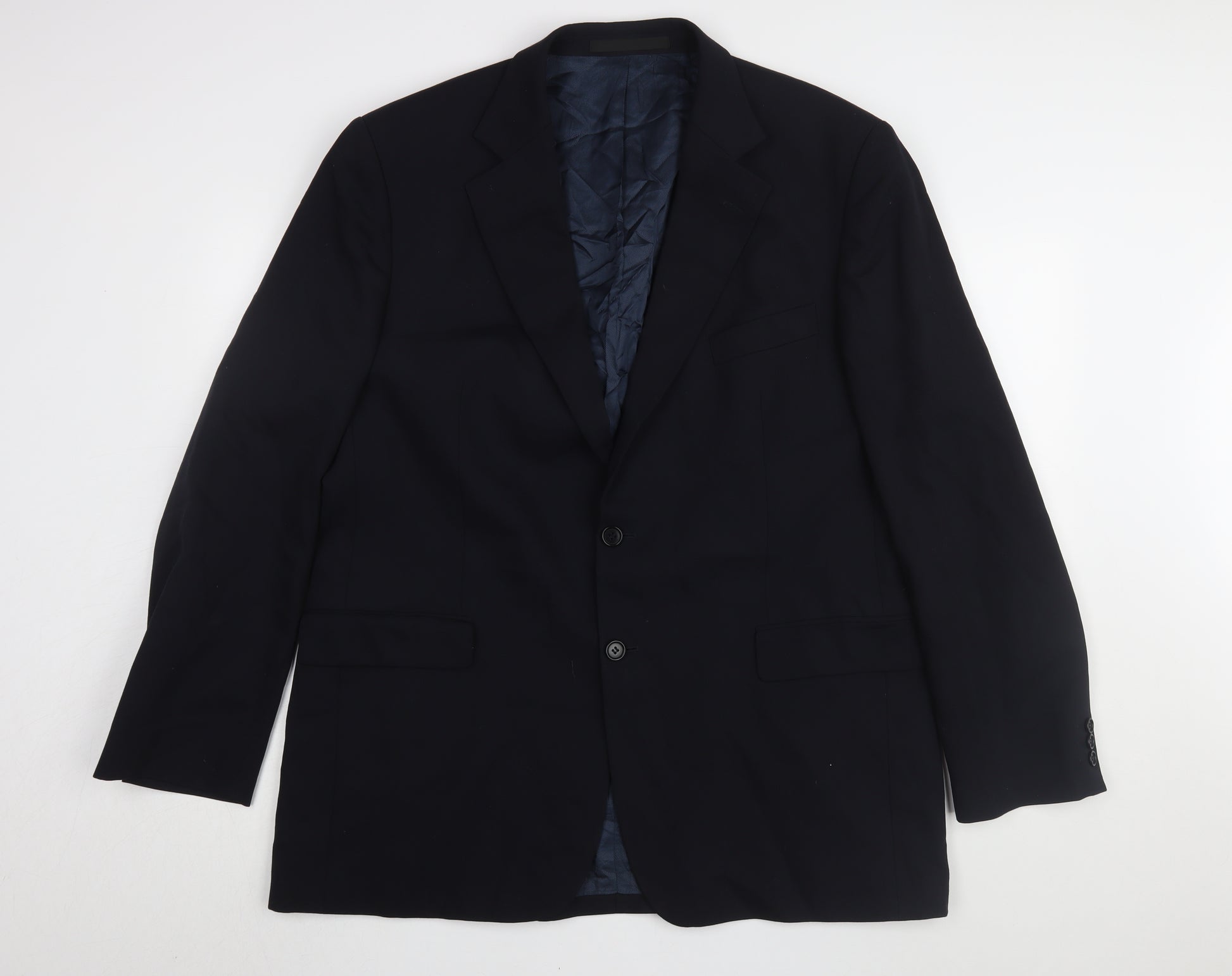 Upgrade your wardrobe with this sophisticated Marks and Spencer Men's Navy Wool Blazer, perfect for business or formal occasions. Expertly crafted from pure new wool, this classic single-breasted blazer offers a timeless look with a modern twist. The navy colour complements any ensemble, making it a versatile addition to your collection. It features a long jacket length, perfect for the taller gentleman, and is tailored to fit a chest size of 44. The blazer is designed with double-vented back for mobility and comfort, while the notch lapel adds a touch of elegance to this traditional piece. With a two-button front fastening, this blazer ensures a secure and flattering fit. The interior lining is made from luxurious viscose/rayon, offering a comfortable feel against the skin, while also granting easy movement. New with tags, this blazer is in pristine condition, ensuring you receive a quality piece. Make a statement at your next event or in the office with this exquisite wool blazer from Marks and Spencer. Available for the competitive price of just £39.75, it offers exceptional value for a high-end garment. Ideal for the autumn and winter seasons, this blazer provides warmth and style when you need it most. Whether paired with suit trousers for a complete formal look or with jeans for a smart-casual attire, this jacket will undoubtedly elevate your appearance.
