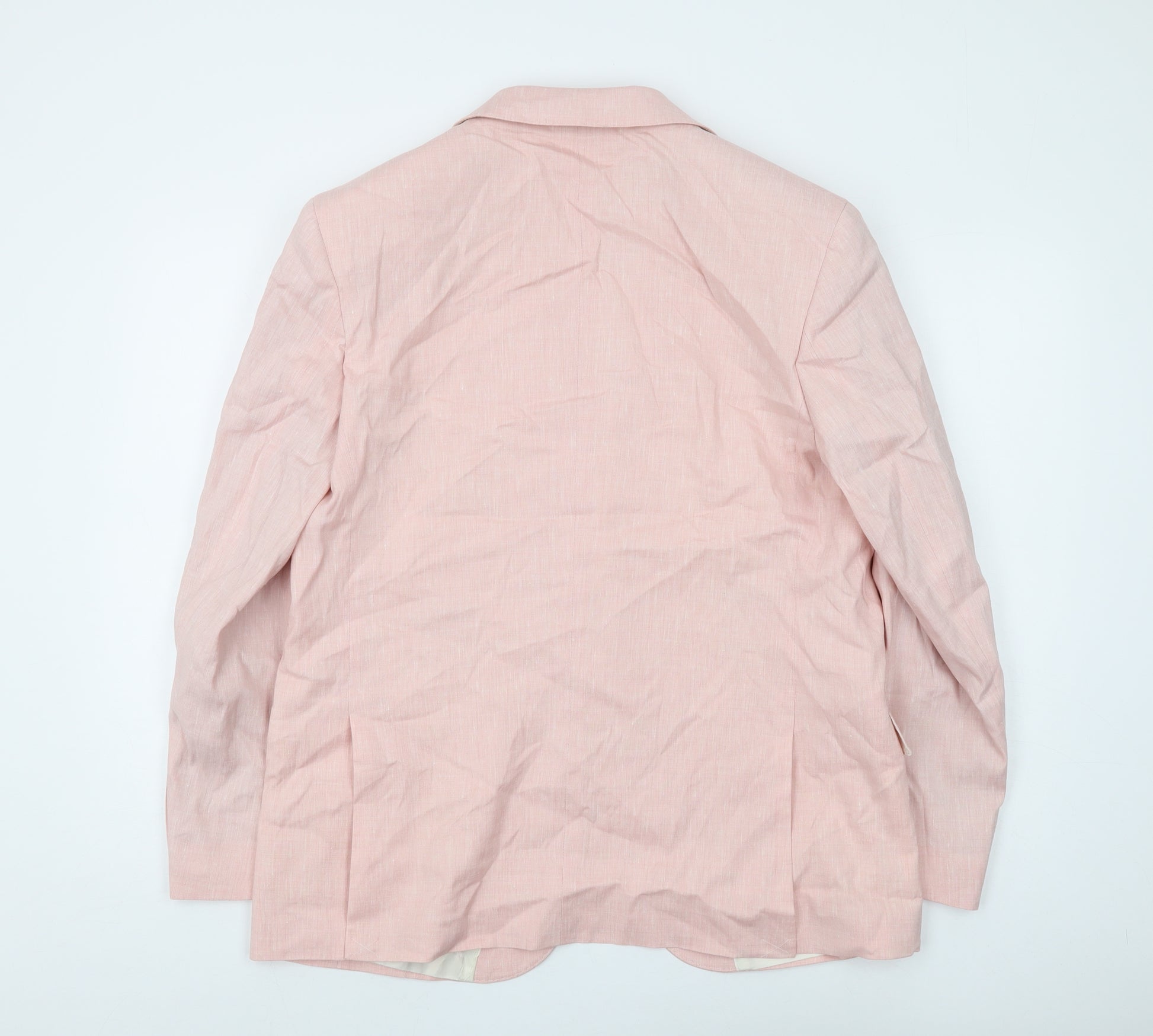 Introducing the ultimate addition to your smart wardrobe, this Marks and Spencer men's pink blazer crafted from premium materials ensures comfort and durability. Ideal for both business meetings and weddings, this single-breasted blazer provides a classic, elegant look. Featuring a flattering short length and a two-button front, it offers a tailored fit that complements various physiques. Its notch lapel style and single vent enhance the sophisticated design while allowing freedom of movement. Constructed from a blend of flax, polyester, viscose, and elastane, the blazer promises a breathable, flexible wear comfortably accommodating the warmer seasons of spring and summer. Inner pockets add convenience, making this blazer functional yet stylish. Lined with viscose, it adds a layer of comfort to your everyday formal attire. Embrace the pastel pink shade for a subtle yet distinct addition to your ensemble, suitable for both the classic and modern wardrobe. Invest in this timeless piece and enjoy its versatile presence in your collection.