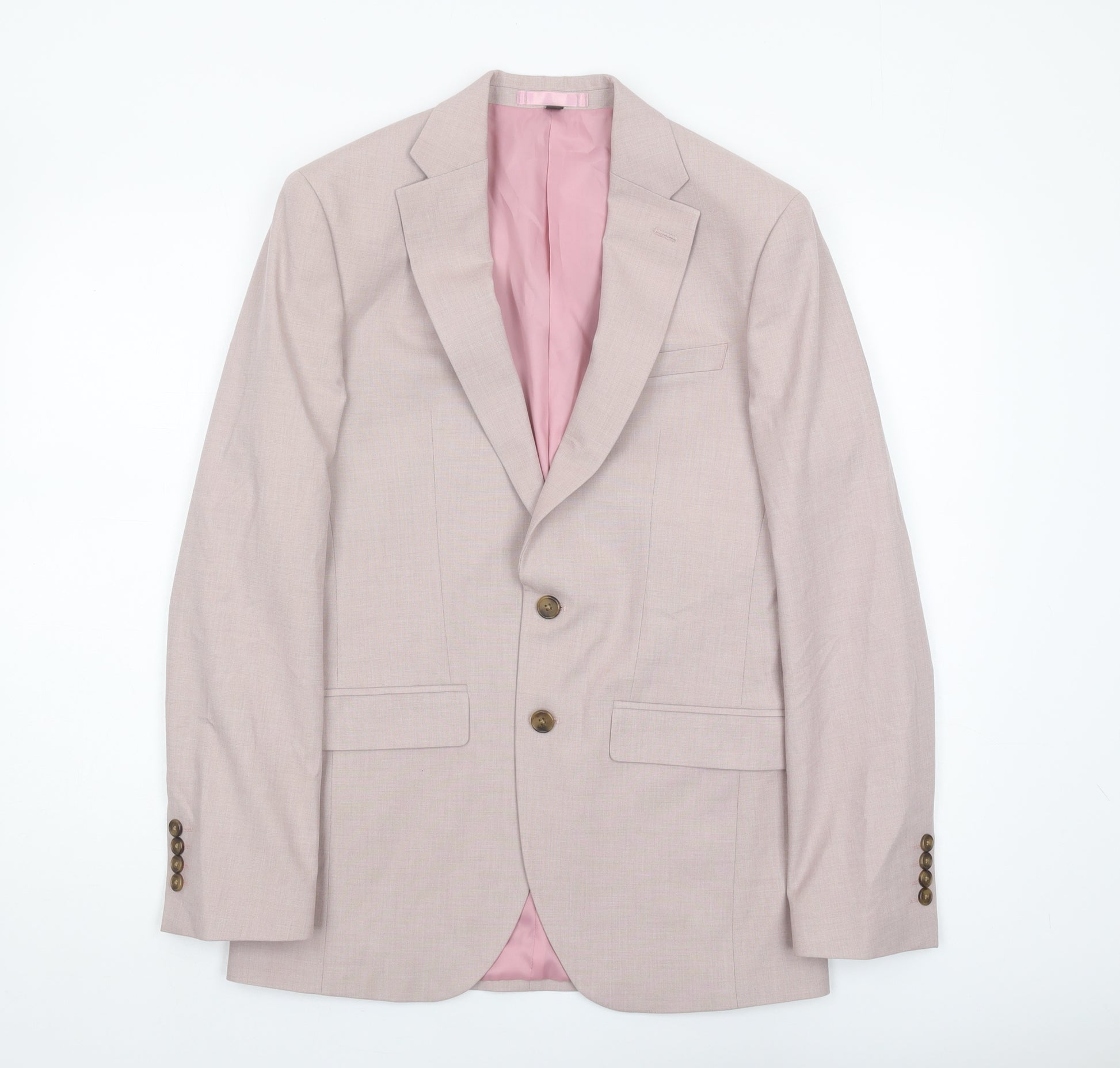Elevate your style with this distinguished Marks and Spencer Men's Blazer, perfect for any formal or semi-formal occasion. Crafted in a charming shade of pink, this single-breasted jacket is sure to make a subtle yet captivating statement. The blazer features a classic notch lapel and a sleek two-button front closure that enhances its timeless design. Designed for a regular fit, this jacket ensures both comfort and style, making it a versatile choice for various events. The double-vented back allows for ease of movement, ensuring you remain comfortable throughout the day or night. Made from a durable blend of 65% polyester, 29% viscose, and 6% elastane, this blazer not only looks exquisite but also provides a comfortable wearing experience. The inner lining, crafted from 100% polyester, offers a smooth and soft feel against your skin. Be it a business meeting, a wedding, or a sophisticated evening affair, this Marks and Spencer blazer is your ideal companion. Its modern yet classic appeal makes it easy to pair with various trousers or jeans, giving you endless styling options. Additionally, its easy-care attribute means you can keep it looking fresh and new with minimal effort. Add this stunning piece to your wardrobe and enjoy the confidence that comes with wearing a quality garment from a renowned brand. Whether you're aiming for a polished, professional look or a more relaxed, elegant style, this blazer has you covered. Don't miss the chance to own a piece that effortlessly marries tradition with contemporary fashion.