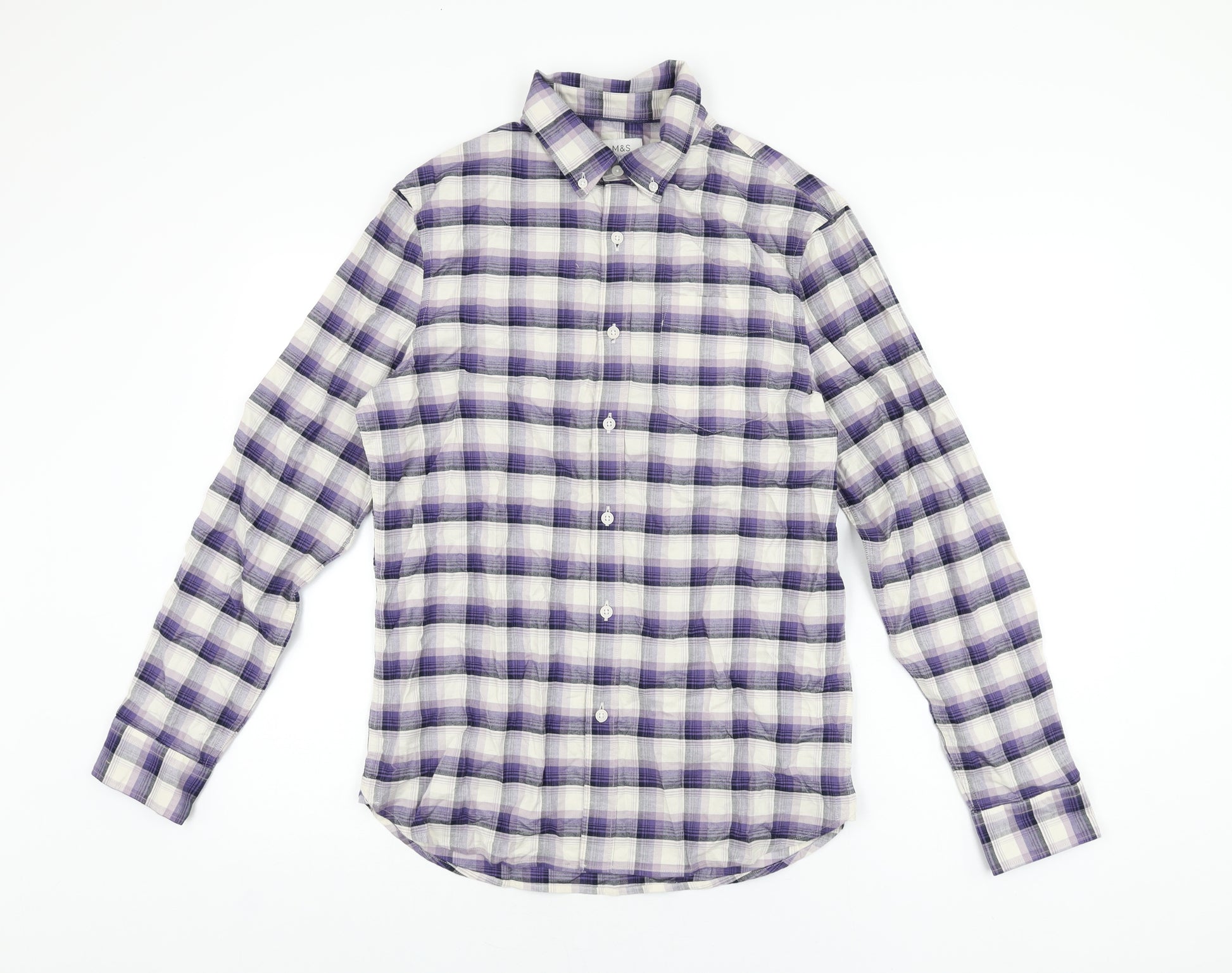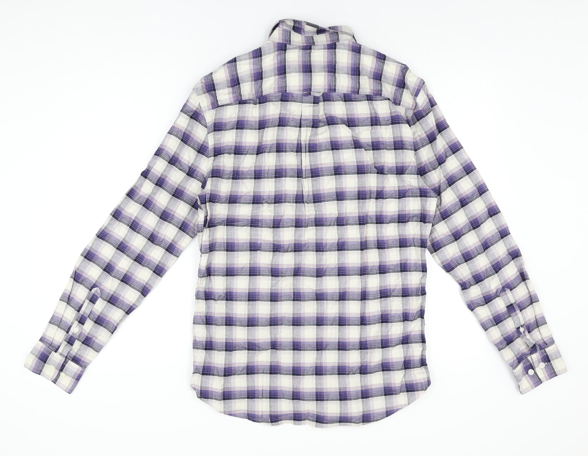Mens Purple Plaid Cotton Button-Up Size S Collared Button