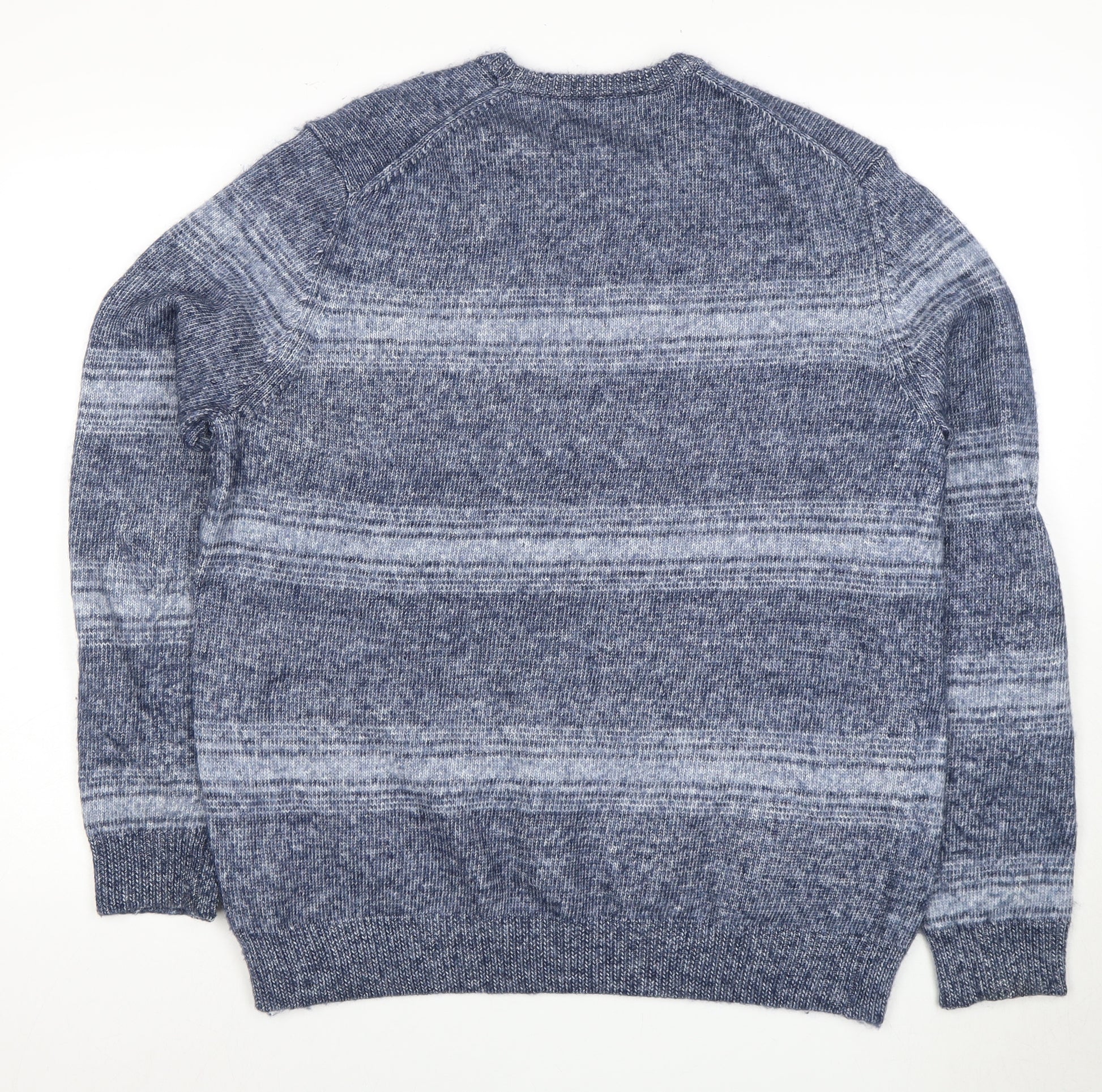 Discover a stylish addition to your winter wardrobe with this Marks and Spencer men's pullover jumper. Crafted in a regular fit style to provide comfort and ease, this garment is made from a luxurious blend of polyamide, polyester, and acrylic. The jumper features a crew neck design and long sleeves, perfect for keeping warm during chilly days. The classic blue colour combined with a subtle striped pattern makes this versatile jumper suitable for any casual occasion. The machine washable fabric ensures easy care and maintenance. Whether you're heading out for a casual meet-up or simply lounging at home, this jumper epitomises cosy style. Structural integrity and a lightly worn condition mean this piece still holds its charm. Affordable and versatile, this jumper is an ideal pick for anyone looking to expand their collection without compromising on style or quality.
