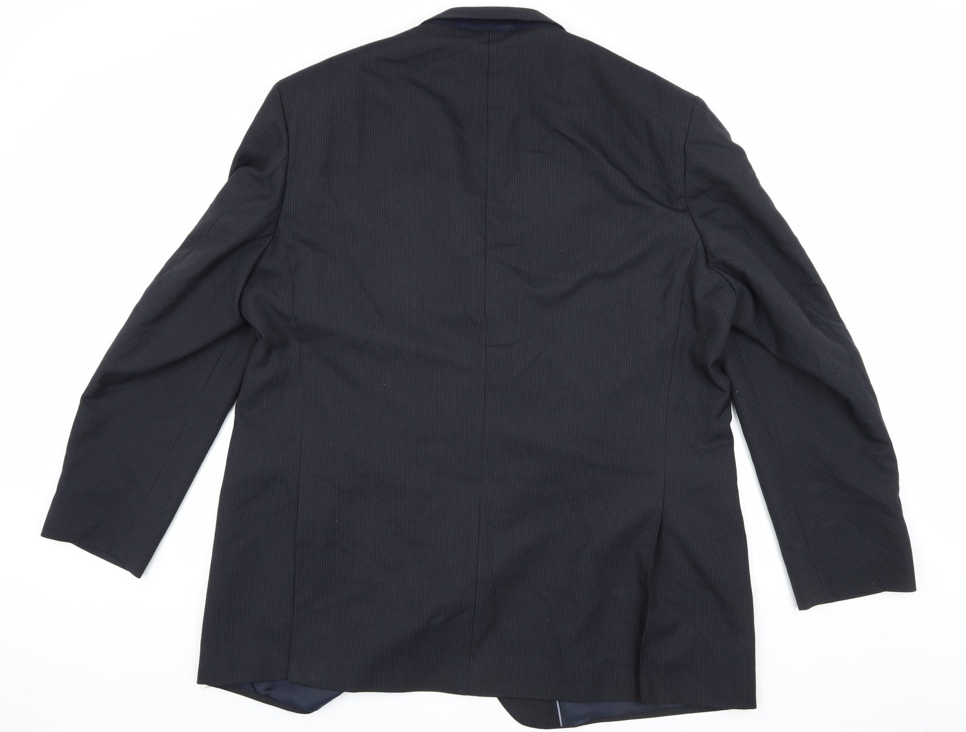 Upgrade your wardrobe with this smart and sophisticated Marks and Spencer navy blazer, perfect for both business and formal occasions. Tailored for a 48 Long chest size, this single-breasted blazer offers a sleek fit and a timeless striped pattern that adds a touch of class to any ensemble. Crafted from a durable blend of 85% polyester, 13% viscose, and 2% elastane, it ensures comfort and longevity. The blazer is lined with polyester for a soft feel against your skin while the notch lapel style and double-vented back provide a classic look.This three-button front design features inner pockets, making it both practical and stylish. The three-button sleeve detail adds an extra layer of elegance. Designed with a regular size type, it fits seamlessly into any gentleman’s wardrobe. Its sleek navy colour complements a range of outfits, from autumn and spring trends to year-round wear.Whether worn to the office or a formal event, this blazer exudes confidence and style. Pair it with matching trousers and a crisp white shirt for a polished look that never fails to impress. Carefully dry clean only to maintain its pristine condition. Condition is excellent with minimal wear noted but no significant damage, ensuring readiness to complement your attire immediately.