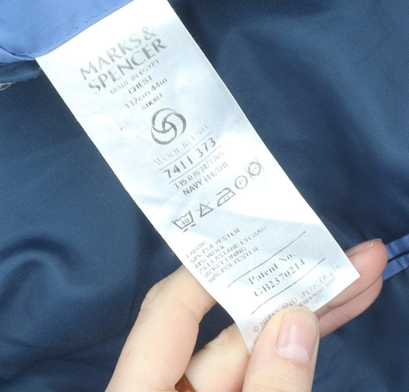 Elevate your wardrobe with this sophisticated navy blazer from Marks and Spencer, perfect for any formal or business occasion. Crafted for the modern man, this single-breasted jacket embodies elegance and classic style. The regular fit ensures comfort without compromising on style, making it ideal for cooler autumn and winter months. The blazer is composed of a luxurious blend of 54% polyester, 44% wool, and 2% lycra, offering both warmth and durability. The lining is 100% polyester, enhancing the overall comfort. With its notch lapel, and three-button front style, this blazer is designed to make a subtle yet powerful statement. The jacket features a single-vent style at the back, contemporary inner pockets, and a sophisticated three-button sleeve detail. Suitable for business meetings or formal occasions, its minimalist design allows for versatility in pairing with trousers or smart jeans. Though pre-owned, it's maintained in excellent condition, with good structure and no visible defects. Don’t miss the opportunity to add this classic piece to your collection, ready to offer a polished look for your next event.