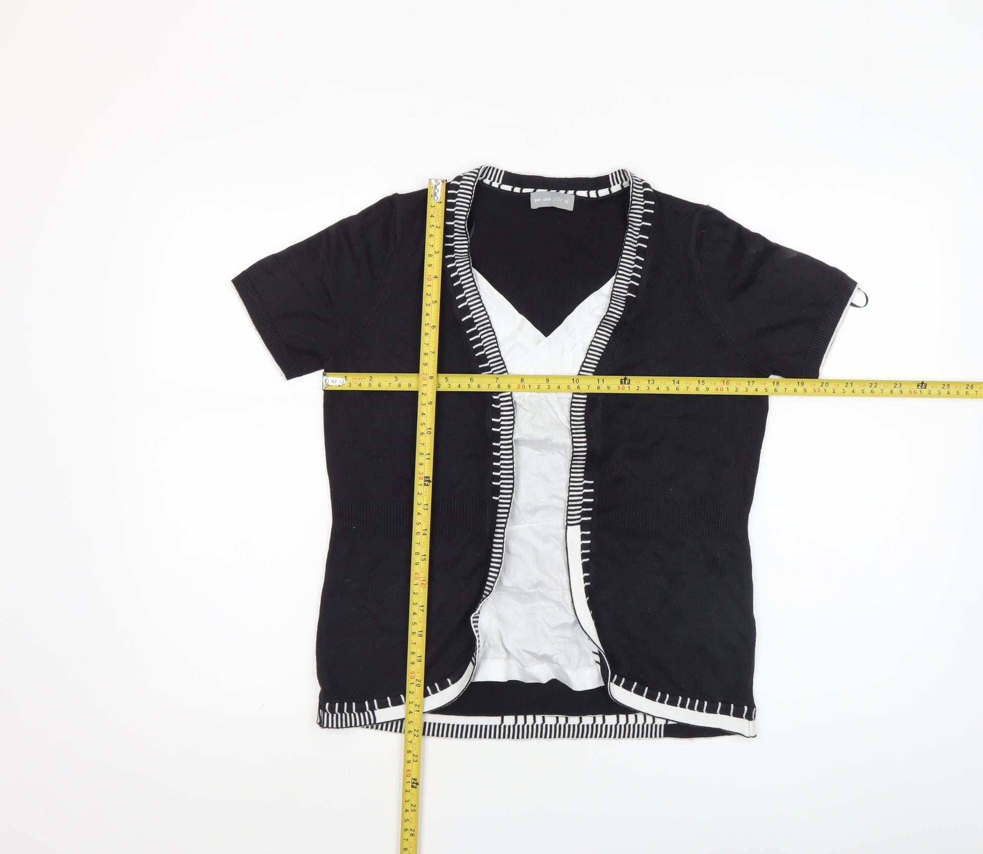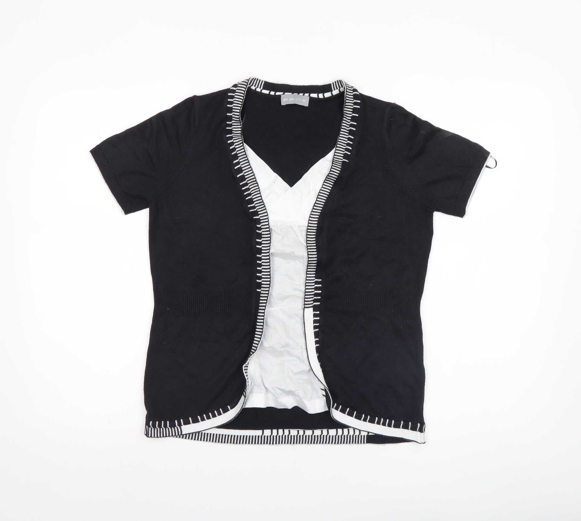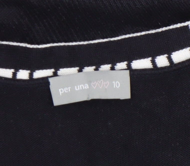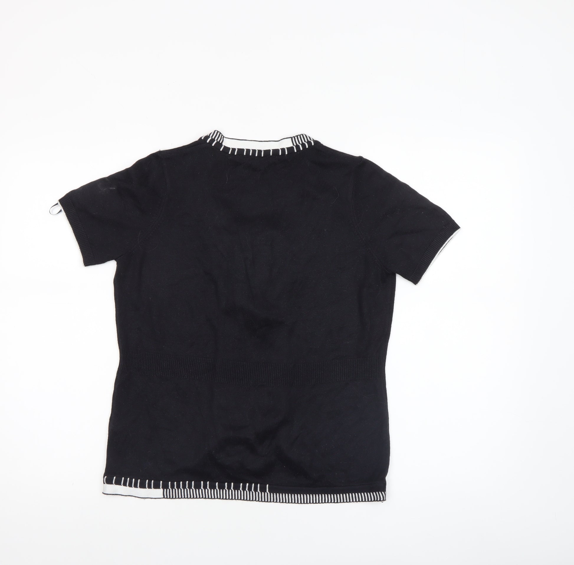 This stylish Marks and Spencer Per Una women’s blouse is a lovely everyday piece designed with casual elegance. Featuring a flattering short-sleeved cut and a V-neckline, the black knit fabric is accentuated by charming contrasting white trim that adds a touch of modern sophistication. Crafted from a comfortable blend of 50% cotton and 50% acrylic, this lightweight knit blouse provides both breathability and softness, ideal for wearing through spring, summer, or layering in the cooler months of autumn. The open front design makes it easy to pair with camisoles or fitted tops underneath, suitable for both casual outings and semi-smart occasions, offering versatile styling options. The fabric hugs gently around the waist ensuring a feminine fit while allowing ease of movement. Made by Marks and Spencer’s Per Una collection, known for its thoughtful detailing and quality finish, this blouse exemplifies the brand’s commitment to enduring design. In very good pre-owned condition, showing minimal signs of wear and maintaining excellent structure and colour, this knit blouse is perfect for adding refined comfort to your wardrobe. Ideal for pairing with jeans, skirts, or tailored trousers, it can be dressed up or down depending on the occasion. Whether you’re running errands, meeting friends, or heading to the office, this top delivers a blend of effortless sophistication and everyday practicality. Machine washable for easy care, it remains a durable, dependable essential with timeless appeal. A beautiful choice for women who appreciate stylish simplicity with a refined edge, promising comfort and versatility season after season.