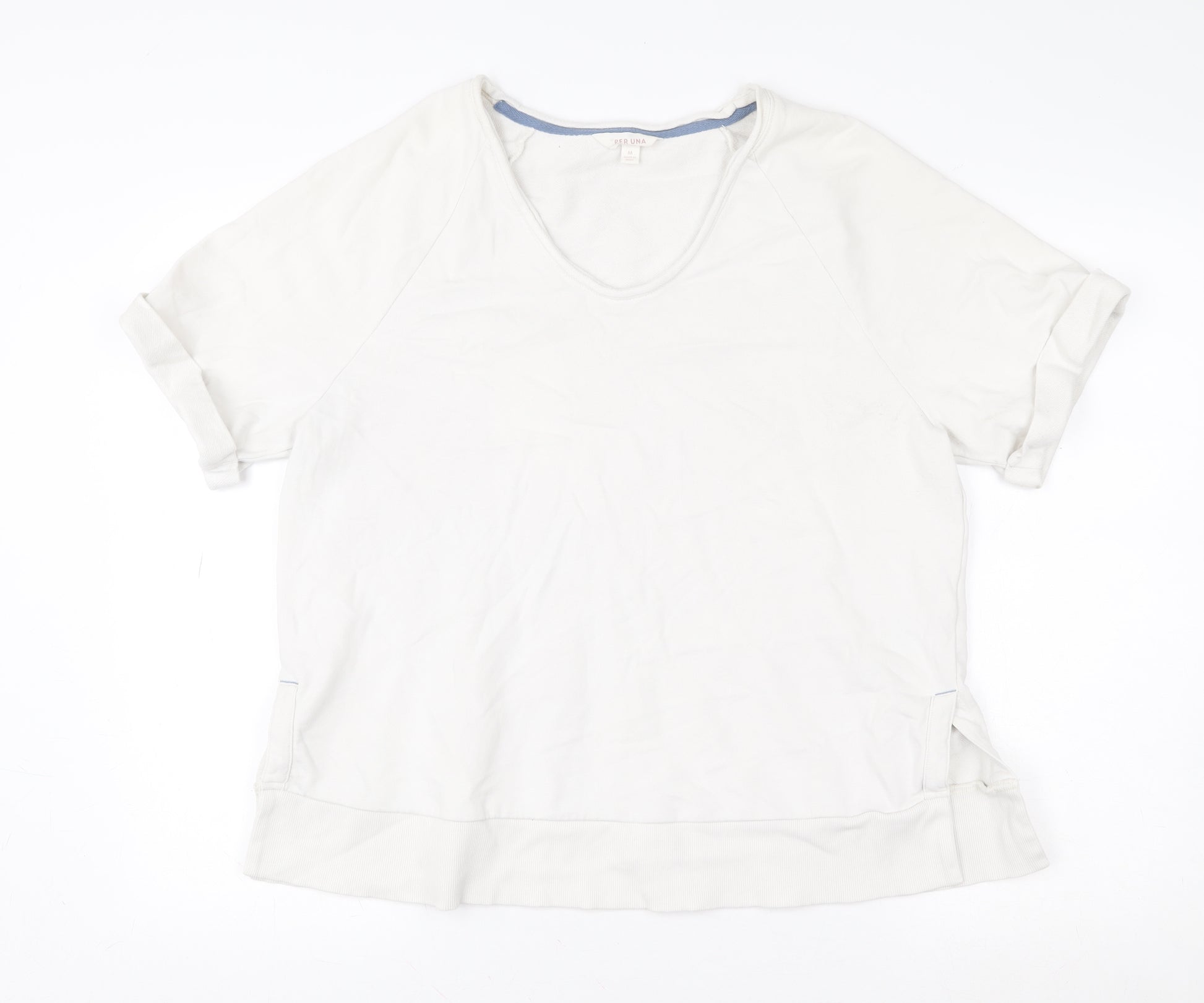 This Marks and Spencer Per Una women's white pullover sweatshirt combines relaxed comfort with casual elegance. Designed in a soft, breathable cotton-rich fabric, it offers a comfortable fit perfect for everyday wear. The sweatshirt features a smooth, plain texture with ribbed hem and sleeve cuffs that subtly enhance its minimalist, contemporary style. Its versatile white shade allows easy pairing with jeans or joggers for a casual daytime look or layered with a jacket for cooler evenings. The short sleeves and easy pullover design add convenience and practicality, ideal for transitional weather. Crafted from quality materials, the sweatshirt is finished with neat side vents that offer extra movement and style. The neckline has a slightly scooped round shape for a flattering, feminine finish. Made with care in India, ensuring durable craftsmanship from Marks and Spencer’s well-regarded Per Una collection. This piece is lightweight, breathable, and machine washable, making it an effortlessly stylish and low-maintenance wardrobe essential. In excellent pre-loved condition with only light signs of wear, this sweatshirt remains soft and clean without any major flaws. A perfect addition for those who appreciate simple yet refined quality in casual fashion.