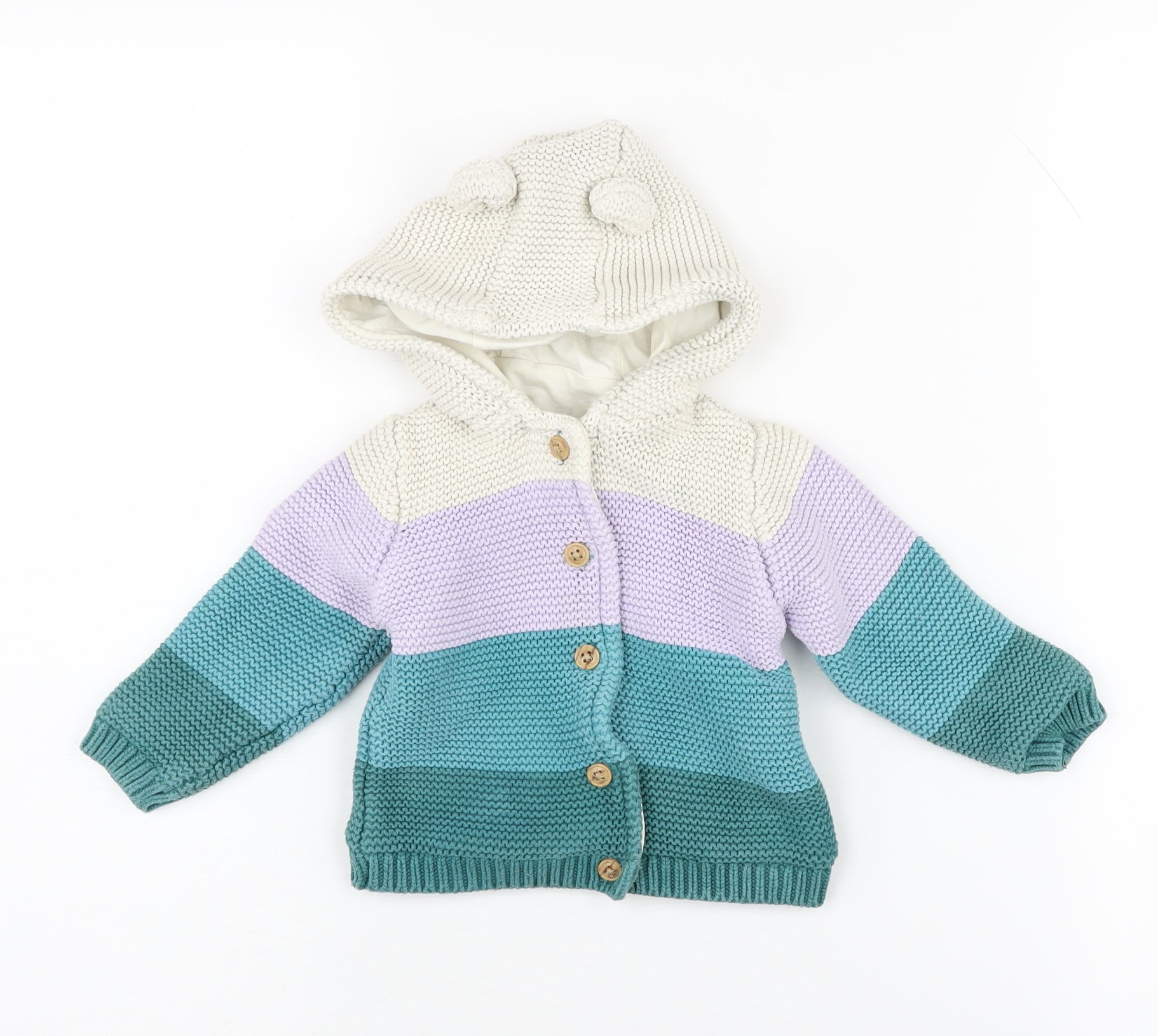 Add a touch of brightness to your little one's wardrobe with this charming Marks and Spencer baby jacket, designed in a delightful striped pattern that combines ivory, blue, and purple hues. Perfectly crafted for unisex baby and toddler wear, this jacket is a wonderful addition to any child's closet. It's made from 100% cotton, ensuring your baby's comfort with its soft texture and breathable quality. The jacket features convenient button closures, making it easy to put on and take off, tailoring to the needs of parents and guardians who seek simplicity and efficiency. Designed for babies aged 9-12 months, it fits comfortably, providing freedom of movement and comfort as they explore their surroundings. With long sleeves offering added warmth, this jacket is well-suited for casual outings or festive occasions. Its machine washable fabric underscores practicality, allowing it to withstand frequent washes while maintaining its vibrant colours and soft feel. Although it doesn't come with original sales tags, the jacket is in excellent condition, free from any noticeable stains or damages. This Marks and Spencer baby jacket is an ideal choice for those looking to combine style, comfort, and functionality, making it a thoughtful gift or a practical addition to your little one's everyday wear. Secure a balance of quality and intelligibility with this standout piece, and provide your baby with a cosy yet fashionable outfit option.