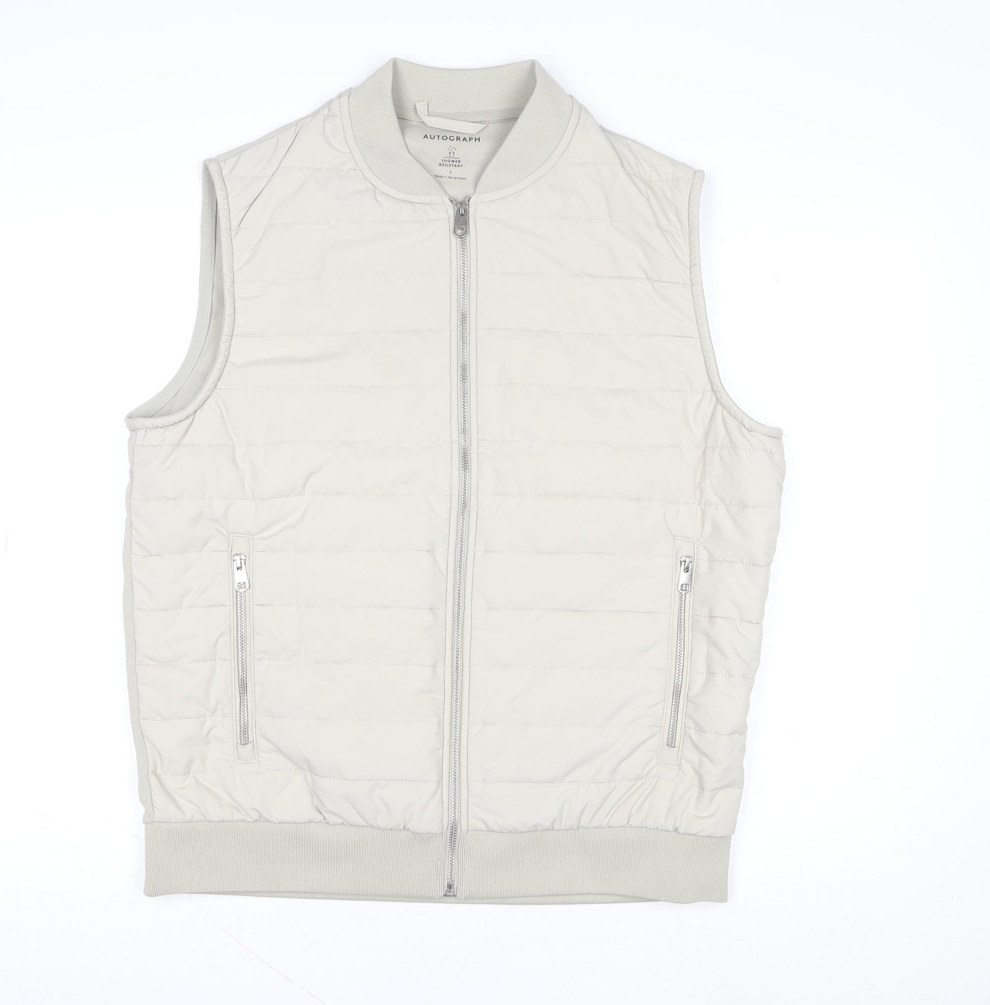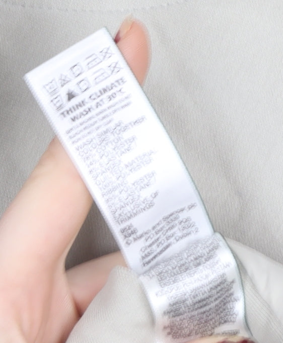 This elegant beige waistcoat from Marks and Spencer’s premium Autograph collection combines functional design with a polished, versatile appearance. Crafted from 100% polyester, the lightweight microfibre outer shell is shower-resistant, offering practical protection against light rain and wind while maintaining breathability and comfort. The sleeveless design makes it ideal for layering over jumpers, long-sleeved tops, or shirts in cooler weather, perfect for spring and autumn days. Featuring a full front zip fastening, secure zipped side pockets, and a comfortable ribbed hem, this waistcoat ensures both style and utility. The smooth polyester lining enhances comfort, while the insulation provides subtle warmth without adding bulk. Its clean, contemporary silhouette and light beige tone deliver a sophisticated, minimalist look that pairs easily with jeans, trousers, or skirts for casual or smart-casual ensembles.The Autograph waistcoat is designed for the modern woman who appreciates both practicality and refined style. The shower-resistant fabric and streamlined quilted pattern lend a tailored aesthetic suited to everyday wear, travel, or outdoor leisure. It’s an effortless layering piece that brings versatility to any wardrobe, balancing function with fashion appeal.Presented in excellent pre-owned condition, the waistcoat shows minimal signs of wear and retains its original high-quality finish. Machine washable at 30°C, it’s easy to care for, making it both durable and low maintenance. Whether added to casual outfits or used as a transitional layer, this Marks and Spencer Autograph waistcoat exemplifies understated luxury and timeless appeal – the perfect choice for those seeking a reliable, stylish addition to their outerwear collection.