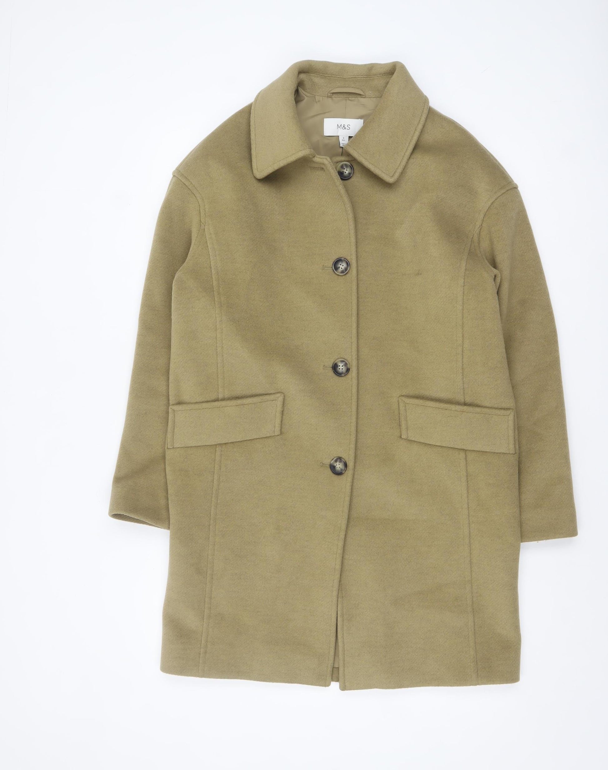 Step into timeless sophistication with this classic beige overcoat from Marks and Spencer, designed exclusively for women. In a flattering UK size 8 with a regular fit, this coat strikes the perfect balance between structure and comfort, making it an ideal choice for daily wear or smart casual outings. Crafted from a premium polyester and viscose blend, the outer shell mimics the luxurious feel of wool while providing a soft yet durable finish. Fully lined in smooth polyester, it ensures a comfortable feel against the skin and reinforces its smart, tailored appearance. The design features a collared neckline and a full button closure down the front, offering a refined silhouette that can easily transition from work to weekend wear.The two front flap pockets add a practical touch while maintaining clean lines. Falling to a mid-length cut, this coat provides just the right amount of coverage for the cool seasons, making it perfect for autumn through to winter. The neutral beige hue complements a wide range of outfits and accessories, giving it endless versatility whether styled over business attire, denim, or cosy knitwear. Designed to be machine cleaned professionally through dry cleaning, it will retain its shape and elegance season after season.In excellent pre-loved condition with minimal signs of wear, this Marks and Spencer coat represents high-quality British tailoring combined with modern practicality. Perfect for anyone seeking effortless elegance and an understated look, it’s a wardrobe investment piece that will remain relevant year after year. A sophisticated staple at an affordable price, this coat offers luxury, warmth, and timeless style in one beautiful design. Treat yourself to chic simplicity and reliable quality with this stylish overcoat from Marks and Spencer.