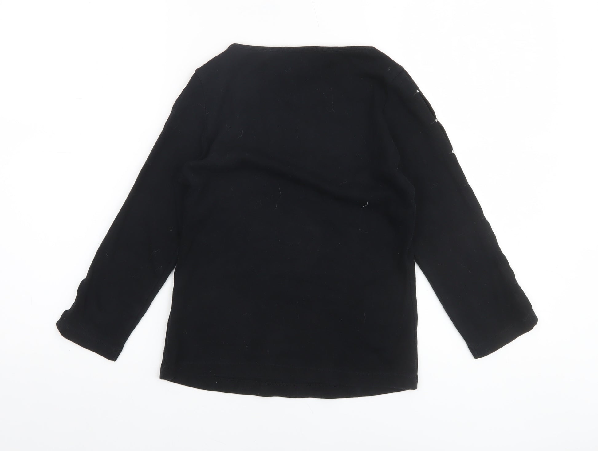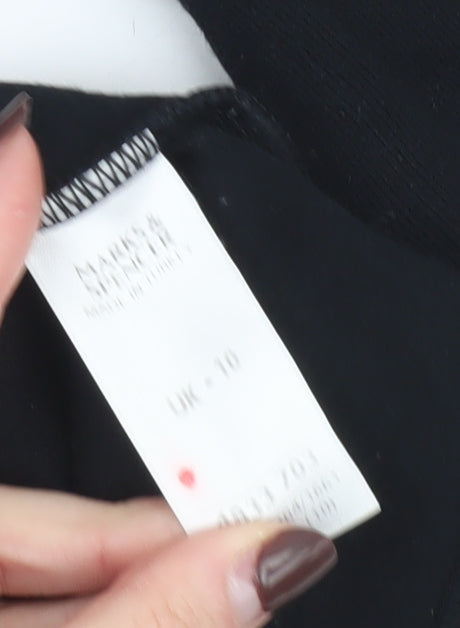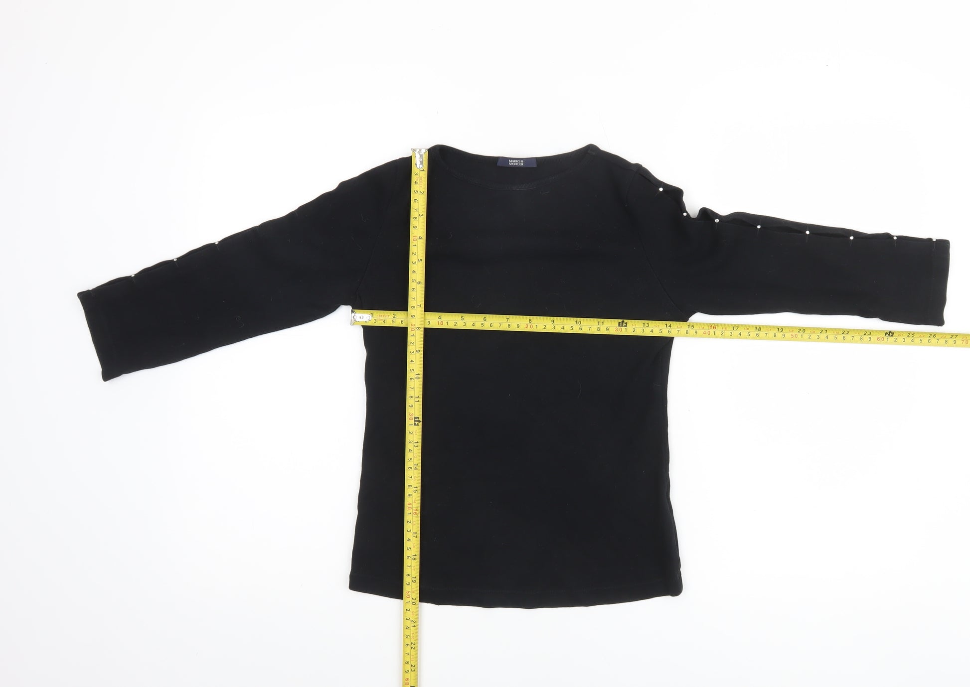 This elegant black top from Marks and Spencer offers a timeless addition to any woman’s wardrobe, perfect for both casual and workwear occasions. Crafted from soft cotton fabric, it provides comfort and breathability, making it suitable for year-round wear. The classic boat neckline gives a refined silhouette that flatters the shoulders and neckline, while the long sleeves with subtle button accents down the arms add a modern touch of detail without overpowering the simplicity of the design. Designed in a regular fit, this versatile piece embodies the effortless style and quality that Marks and Spencer are known for. Whether you pair it with tailored trousers for a smart-office look or denim for a chic weekend outfit, this top is sure to become a go-to essential. The solid black hue enhances its adaptability, easily coordinating with a variety of colours and accessories. Although pre-owned, this garment remains in excellent condition with no major signs of wear, ensuring many more seasons of enjoyment. Elevate your collection with this simple yet sophisticated top – an ideal choice for those seeking everyday elegance with practical style and comfort. Discover its understated luxury that transitions seamlessly from workday to evening events.
