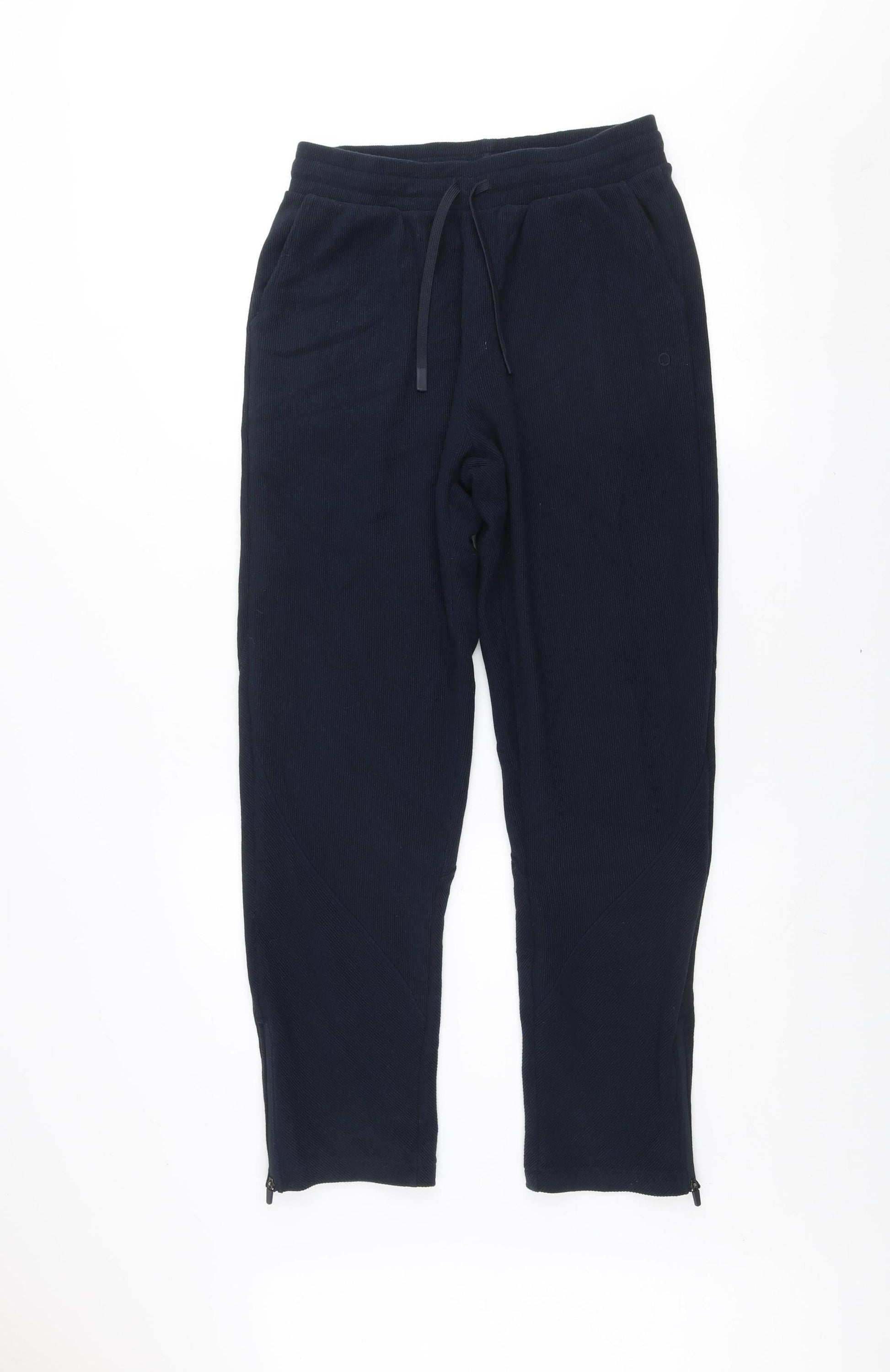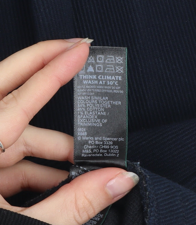 Step into effortless comfort and timeless style with these Marks and Spencer women’s black track pants. Designed in a tapered fit, they combine classic activewear utility with everyday comfort—perfect for a gym session, walk, or a relaxed day at home. Crafted from a soft and breathable blend of polyester, cotton, and elastane, they offer just the right amount of stretch while maintaining structure and warmth. The midweight knit fabric feels substantial and cosy against the skin, making these trousers ideal for autumn through spring seasons.A practical elasticated waistband with an adjustable drawstring ensures a custom fit, allowing flexibility for a range of activities. The zip detailing at the ankle adds a sporty touch, while also offering ease when wearing trainers. The minimal design—without any patterns or logos—keeps the look sleek and versatile, making it effortless to pair with your favourite tops, hoodies, or lightweight jackets.Whether you’re heading out for a jog, a yoga class, or simply running errands, these trousers provide the durability and ease you’d expect from Marks and Spencer’s quality craftsmanship. Their regular fit offers freedom of movement without compromising on a flattering silhouette. Easy to care for, they’re machine washable at 30°C, staying soft and in shape after each wash.Conditioned in excellent pre-loved state, these trousers have minimal signs of wear and retain their structure beautifully. With a versatile black shade that complements any wardrobe palette, these track pants bring comfort, performance, and understated style together seamlessly. Perfect for those seeking both practicality and style in their activewear, they prove to be a reliable staple that will effortlessly find its place in your everyday rotation.