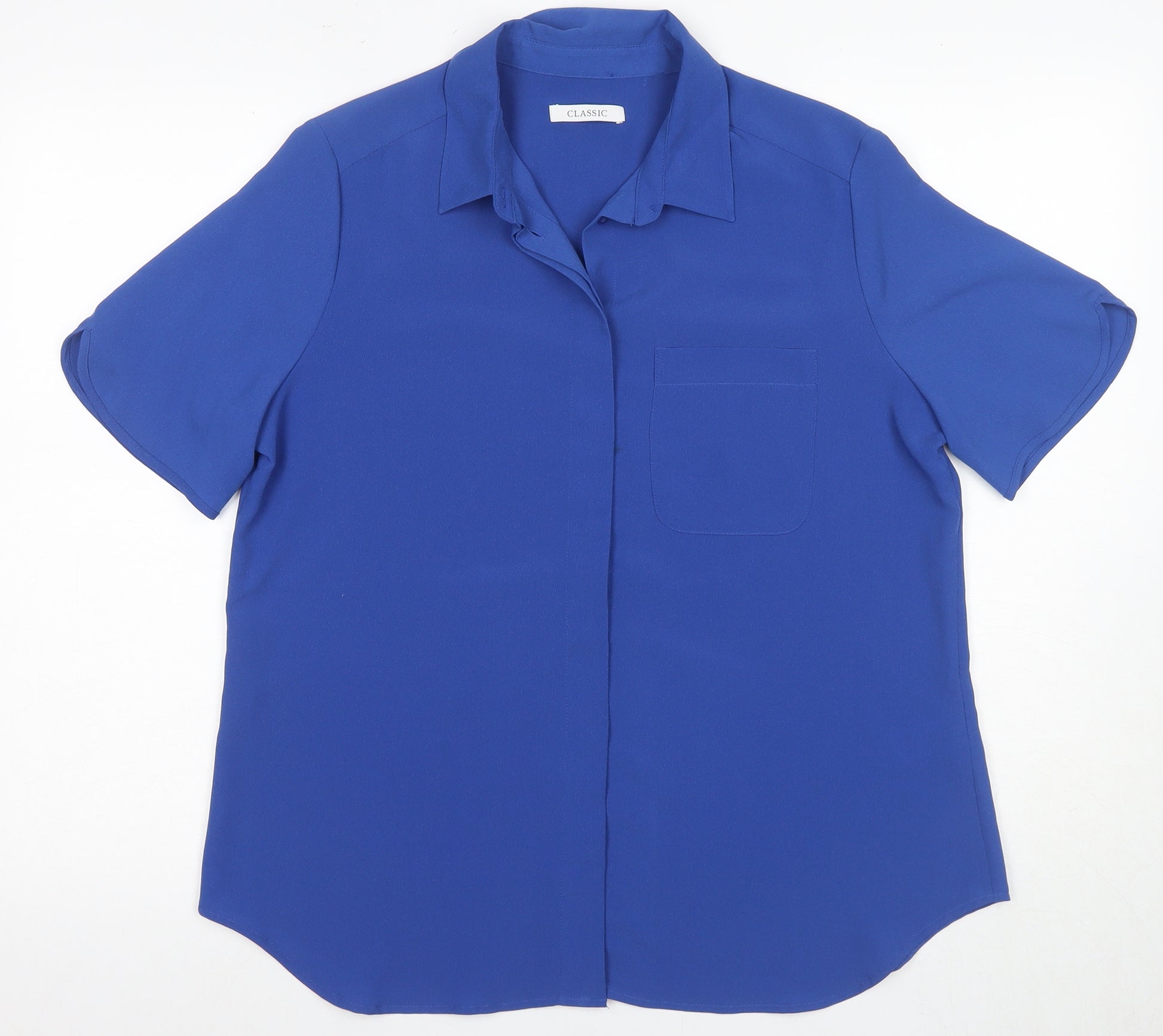 Step out in timeless elegance with this Marks and Spencer Women's Blue Classic Button-Up Shirt. Crafted from high-quality polyester, this shirt offers not only a sleek and polished look but also an easy-care fabric that is machine washable for your convenience. The collared neckline and classic fit provide a flattering silhouette, perfect for smart casual occasions or everyday wear. The vibrant solid blue colour adds a touch of sophistication that will energize your wardrobe. Designed for women with a short sleeve length, this shirt is a versatile addition to any outfit, offering both style and comfort. Ideal for a day at the office or a leisurely brunch, this piece seamlessly combines a classic flair with modern sensibilities. Elevate your wardrobe with this essential button-up, providing a polished look that is effortlessly chic.