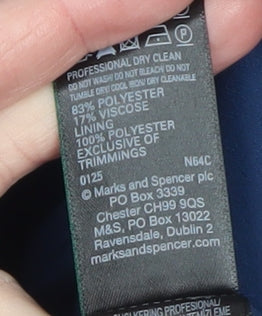 Elevate your outerwear collection with this elegant Marks and Spencer women’s overcoat in a timeless blue shade. Designed with a flattering mid-length cut, this coat offers a sophisticated silhouette that complements both contemporary and classic wardrobes. Crafted by trusted high street brand Marks and Spencer, it combines quality with understated style, perfect for transitioning through the colder seasons. The coat is made from a durable blend of polyester and viscose, giving it a smooth, structured finish that holds its shape beautifully while providing comfort and softness against the skin. The fully lined interior, made from 100% polyester, adds a layer of warmth and ensures ease of movement, making it an ideal piece for autumn and winter wear. Styled with a traditional collared neckline and front button fastening, it creates a timeless look suited for both business and casual occasions. Two front flap pockets offer convenient storage while enhancing the coat’s classic tailoring. It’s a versatile wardrobe staple that effortlessly layers over office wear, dresses, or casual knits. The deep blue colour flatters all skin tones and adds a refreshing alternative to black or grey outerwear. With its regular fit and long sleeve design, this Marks and Spencer coat provides comfortable coverage and an effortlessly polished appearance. Professionally dry clean only, this piece reflects quality craftsmanship designed to last for seasons. Light wear is present but no visible damage, keeping the garment in excellent used condition. A perfect investment piece for anyone seeking elegance, practicality, and timeless style. Pair it with boots and a scarf for a smart day out or style over a dress for an evening look. Practical, effortlessly chic, and made with the high-quality materials Marks and Spencer is known for, this blue mid-length coat will be a favourite in your outerwear collection for years to come.