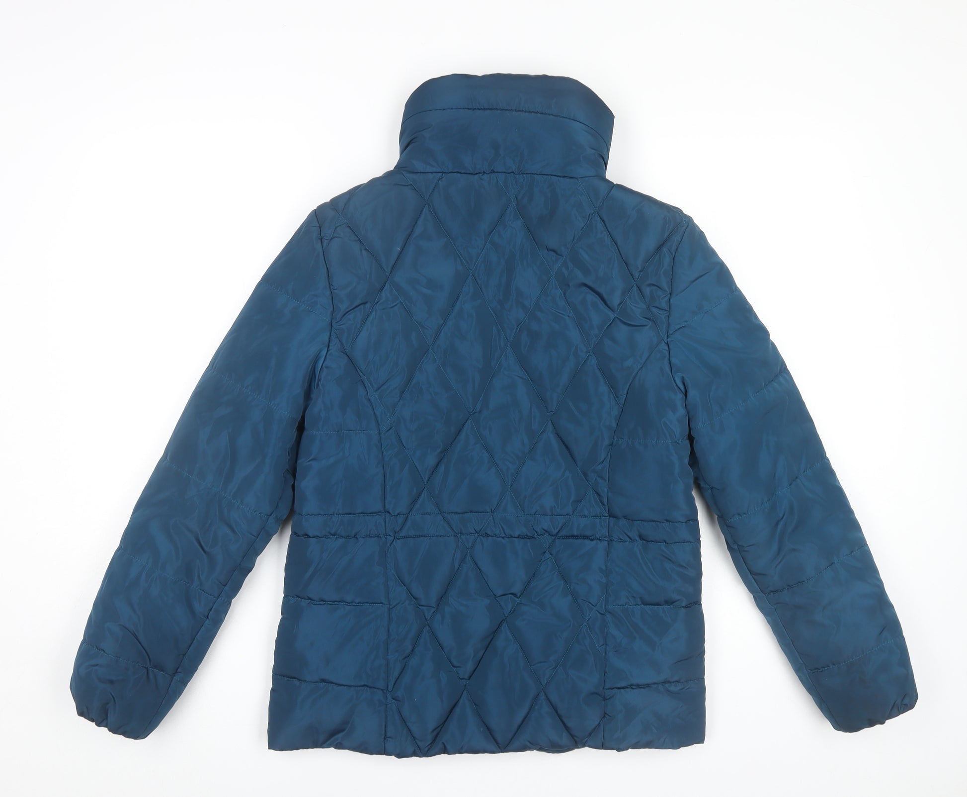 Step into the cooler seasons with this stylish and versatile Marks and Spencer women’s quilted puffer jacket in a deep dark marine blue. Perfectly designed for autumn and winter wear, this jacket combines practical features with timeless classic style. Made entirely from durable polyester, both the outer shell and padding ensure warmth and lightweight comfort, while the smooth polyester lining provides a cosy fit. The quilted design not only adds texture and visual appeal but also helps in retaining heat efficiently, making this jacket an ideal choice for chilly days.The full zip closure makes it easy to wear and allows you to adjust for comfort, while the two zippered pockets provide practicality for securely storing your essentials. The mid-length cut strikes a balance between coverage and movement, perfect for layering over both casual and smart outfits. Its water-resistant fabric provides additional protection against light rain, offering peace of mind during unpredictable weather. Designed in a classic fit with long sleeves, this jacket ensures both comfort and a flattering silhouette for everyday wear.With thoughtful features such as a padded interior, quilted accents and zipped pockets, this jacket is both functional and stylish. Suitable for casual everyday use, travel essentials, or even as a lightweight outerwear piece for city outings, it’s a wardrobe staple that will serve you season after season. The dark marine blue colour complements a wide range of outfits and adds a sophisticated edge to your outerwear collection.This Marks and Spencer quilted jacket is in excellent pre-loved condition with only light wear and no major flaws, ensuring plenty of wear left for its next owner. Affordable, stylish, and practical, this jacket is a must-have addition for anyone seeking reliable outerwear with a touch of timeless appeal.