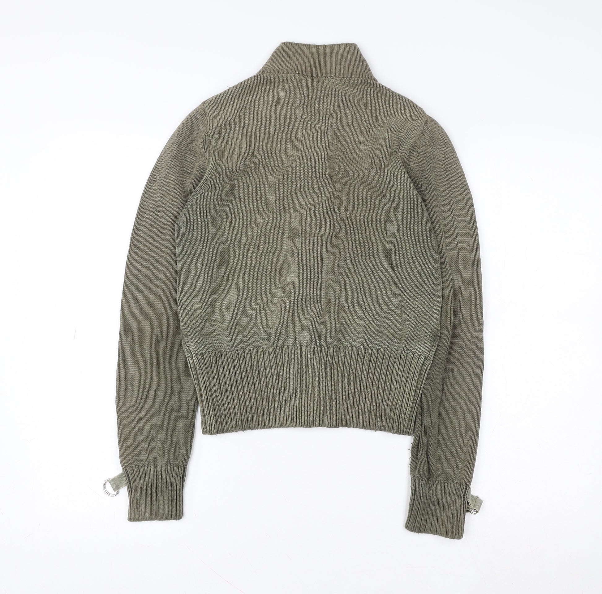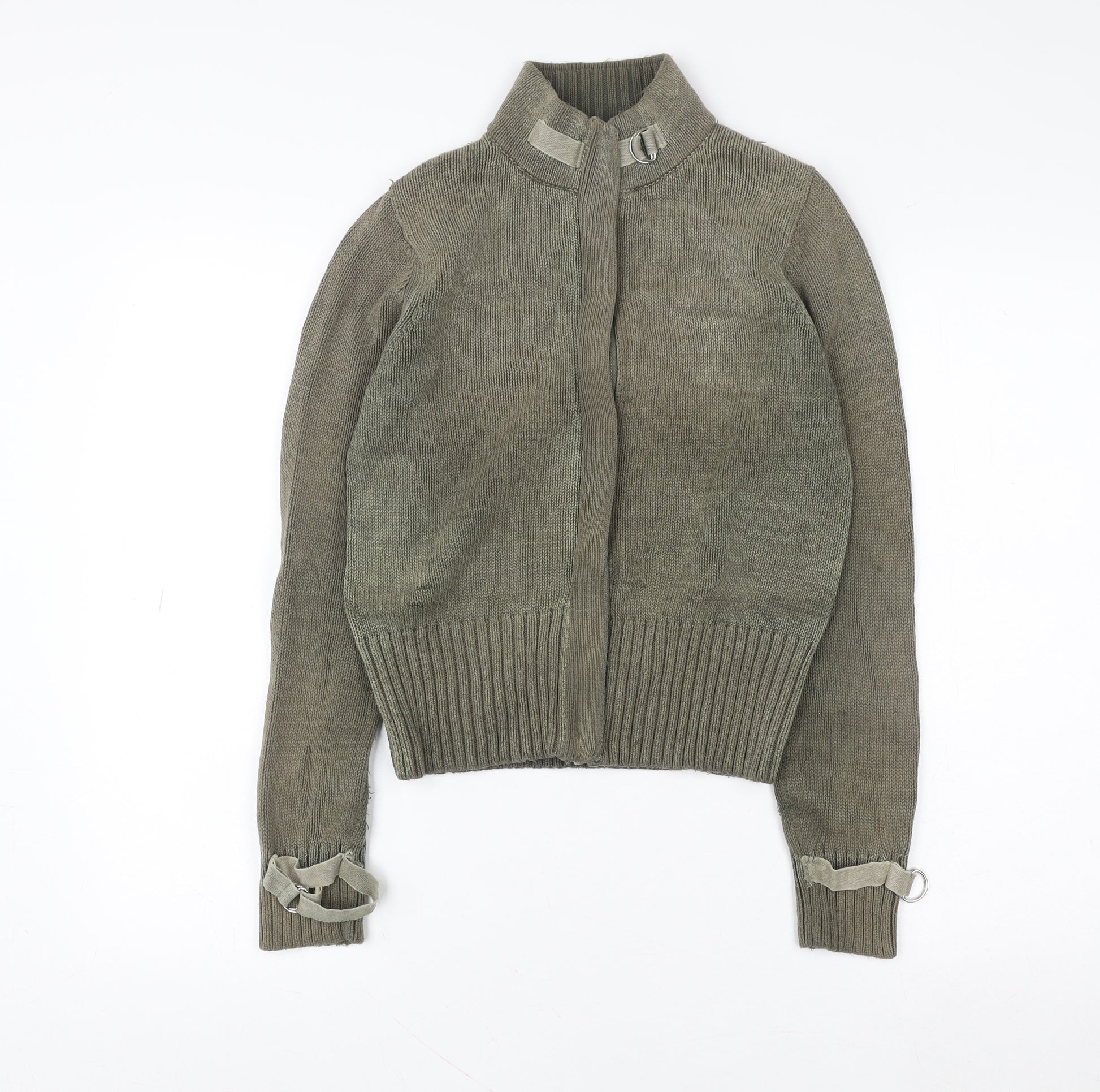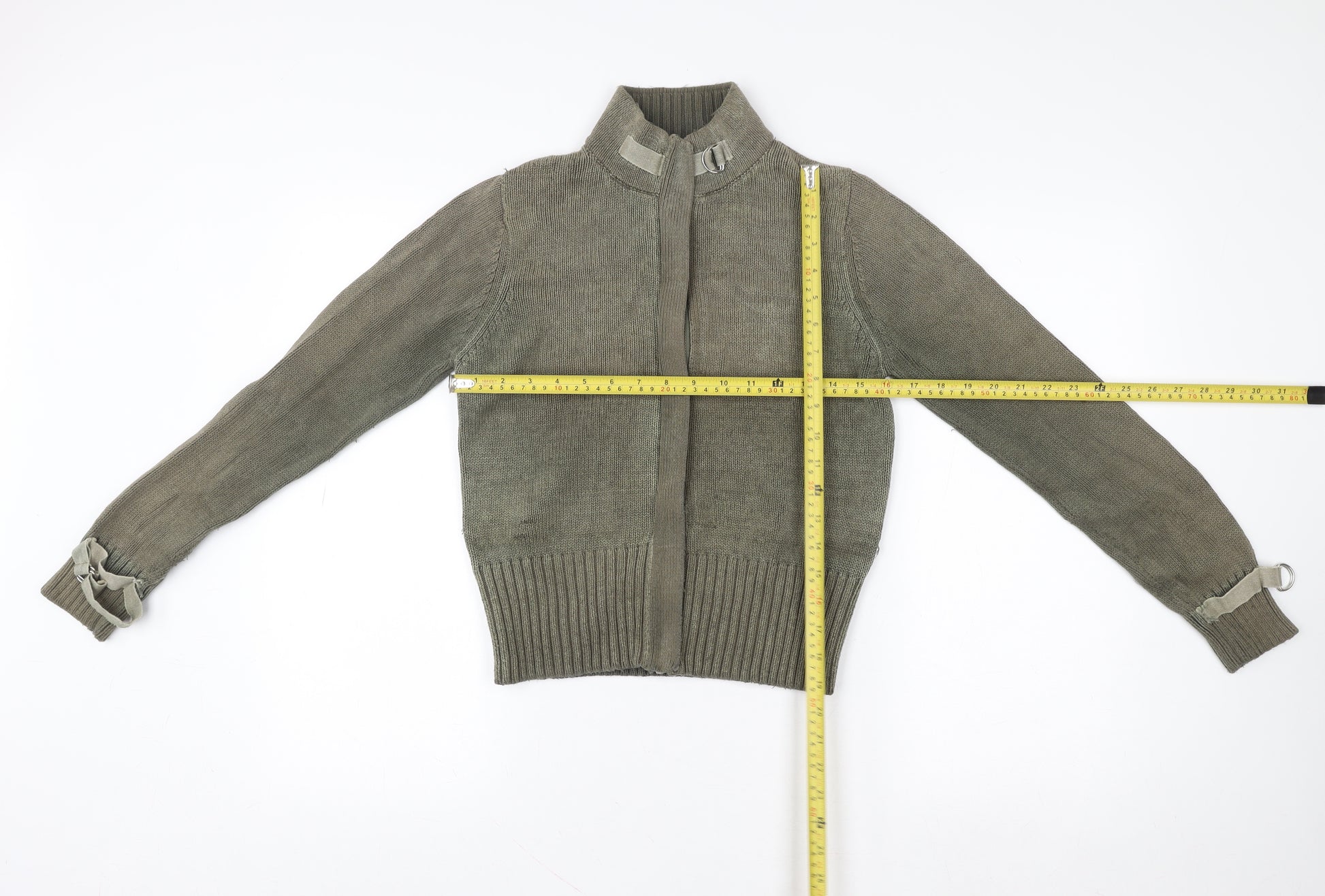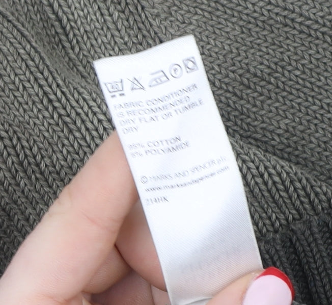 Step up your casual wardrobe with this stylish Marks and Spencer women’s full zip knit sweatshirt, crafted with comfort and everyday durability in mind. In a classic muted green tone that complements all-season styling, this cotton-rich piece blends 95% cotton with 5% polyamide for long-lasting softness, breathable wear, and easy maintenance. The ribbed hem and cuffs provide a flattering shape while ensuring a snug fit, making it perfect for layering when the weather cools down. Designed with a functional front zip closure and subtle buckle detailing at the collar and cuffs, this piece combines practicality with understated urban style. The high neckline adds an extra layer of warmth and a modern silhouette, ideal for pairing with jeans, casual trousers, or skirts for a relaxed yet refined look. The full zip allows versatile wear—style it open over a tee for a laid-back afternoon or zipped up for a neat, streamlined finish. Made with quality craftsmanship from Marks and Spencer, this jumper showcases thoughtful detail that enhances its everyday appeal. Suitable for autumn and winter wear, it’s a great addition to a cold-weather wardrobe, offering a cosy knit texture and neutral hue that fits effortlessly into your outfit rotation. Whether worn for weekend brunches, errands, or casual evenings out, this sweatshirt balances warmth, comfort, and timeless design in one versatile piece. In excellent pre-loved condition with only light signs of gentle wear, it retains its original quality and soft texture. A dependable, easy-care wardrobe essential ideal for anyone seeking both comfort and effortless chic in a single garment.