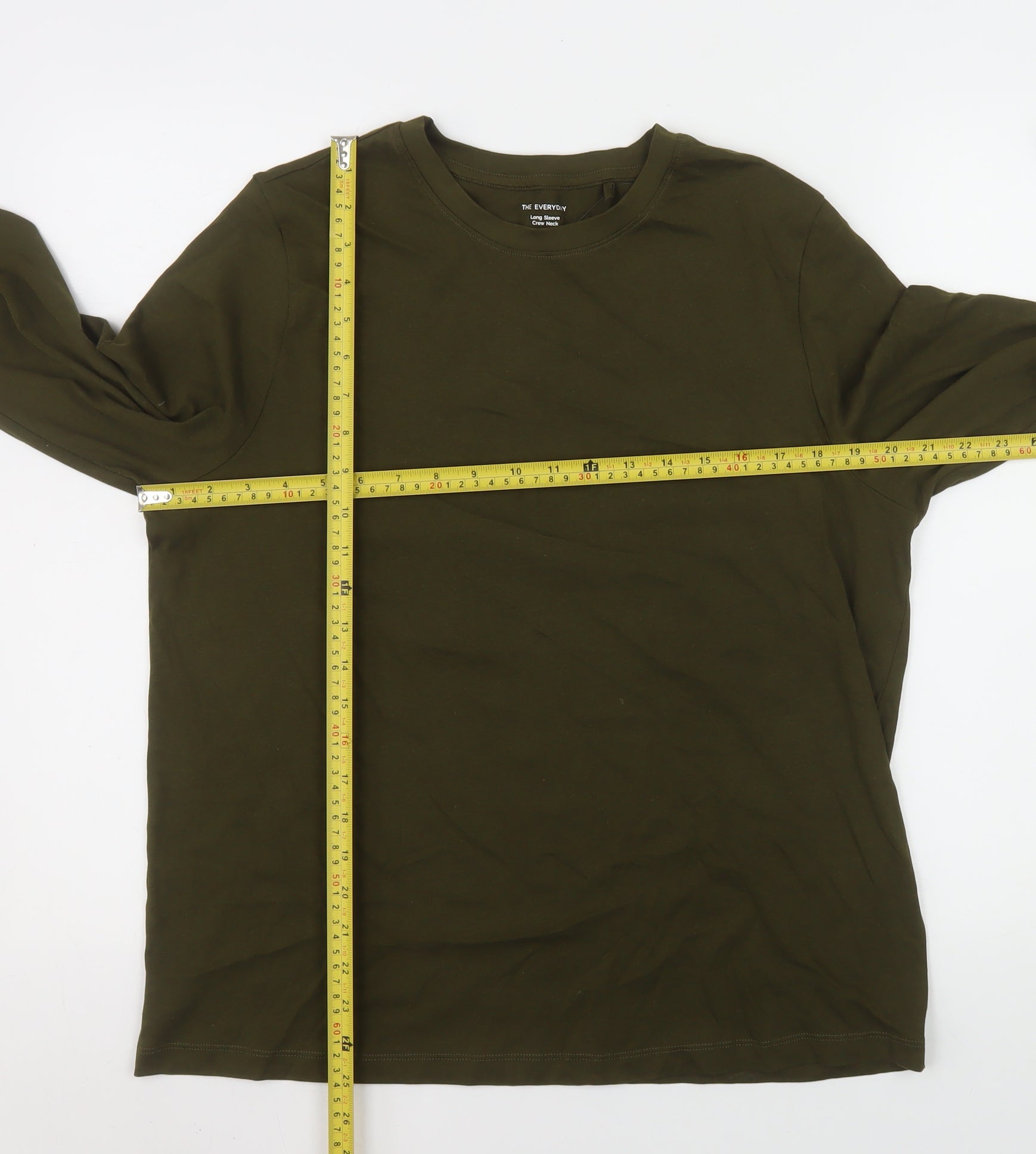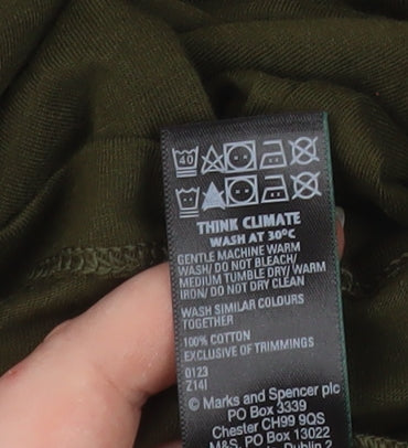 Refresh your casual essentials with this Marks and Spencer women’s long sleeve T-shirt in a rich dark khaki green shade. Crafted from soft 100% cotton jersey fabric, it delivers both comfort and breathability, making it perfect for layering throughout the year. The crew neck design and regular fit offer classic styling that pairs effortlessly with jeans, skirts or joggers. The lightweight yet durable fabric provides a smooth finish, while the relaxed silhouette ensures all-day wearability, whether you’re lounging at home or running errands. Styled in a versatile earthy green tone, this T-shirt complements a range of wardrobe colours, offering year-round appeal. Designed with long sleeves, it’s an ideal staple for cooler spring mornings, crisp autumn afternoons or layering under knits in winter. Easy to care for with machine washable convenience, it helps to make everyday dressing simple and sustainable thanks to Marks and Spencer’s high-quality cotton construction. Made for the modern woman who values timeless style and comfort, this basic piece is a wardrobe essential that combines practicality with understated elegance. Pair it with denim and trainers for a laid-back weekend look, tuck it into a skirt for a neat casual outfit, or layer it under a jacket for effortless transitional styling. This pre-loved piece is in excellent condition with only light signs of wear, maintaining its soft texture and rich colour tone. Offering durable quality and the trusted craftsmanship of Marks and Spencer, it’s an ideal buy for those seeking a reliable, easy-to-style, all-seasons basic top that lasts. A perfect blend of comfort, quality, and simplicity ready to join your everyday wardrobe staples.