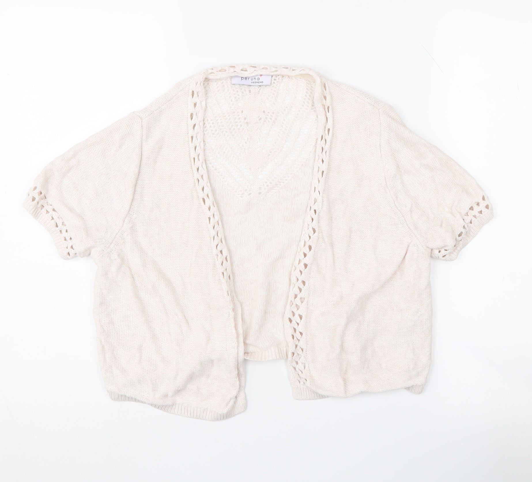Discover a blend of elegance and casual charm with this Marks and Spencer women's cardigan in a delightful ivory hue. Crafted for comfort and style, this regular fit cardigan will effortlessly elevate your spring and summer wardrobe. Designed in a size 14, it is exceptionally suitable for women, offering a flattering and comfortable fit. Expertly made with a combination of 72% viscose and 28% linen, the lightweight knit fabric ensures breathability, making it an ideal choice for warmer days. This short-sleeve cardigan features intricate crochet accents along the edges, adding a touch of sophistication. Its open style design offers versatility, allowing for easy layering over your favourite tops. Whether you're enjoying a casual day out or relaxing indoors, this cardigan promises a relaxed, chic look. With a condition rated as excellent and showing no signs of wear, this pre-owned piece maintains a pristine appearance. The absence of any elaborate patterns means you can effortlessly pair it with a variety of outfits, ensuring it's a versatile addition to your clothing collection. Perfect for casual occasions, this ivory cardigan also aligns well with a minimalist aesthetic, making it not just an apparel choice but a style statement. Embrace the timeless appeal and practical design that Marks and Spencer is known for, ensuring you look your best no matter where your day takes you.