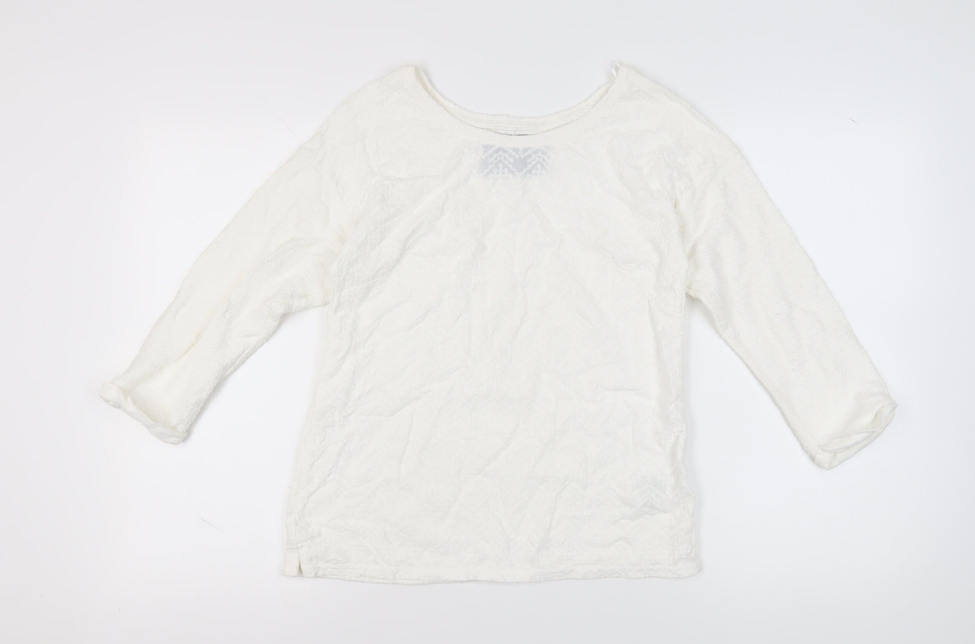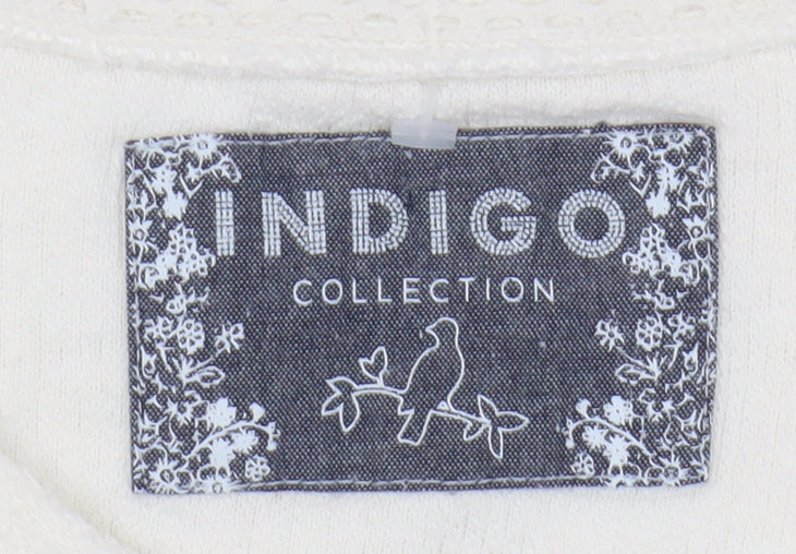 Experience comfort and style with this charming T-shirt from Marks and Spencer's Indigo Collection. Designed for the modern woman, this piece comes in a versatile and gentle ivory hue, perfect for blending with a variety of outfits. Crafted from premium 100% cotton, it offers a soft texture against the skin, making it ideal for everyday wear. The classic scoop neck and fitted 3/4 sleeves provide a flattering silhouette that complements any body shape, while the pullover closure ensures easy wearing. Although slightly wrinkled, indicative of its gently loved condition, the overall appearance maintains its elegant allure. Machine washable and suitable for casual occasions, this T-shirt can effortlessly transition from a relaxed weekend look to a breezy day out with friends. Whether paired with jeans, shorts, or a skirt, this cotton top promises to be a staple in your wardrobe. Add this basic yet essential piece to your collection and embrace a blend of simplicity with sophistication.