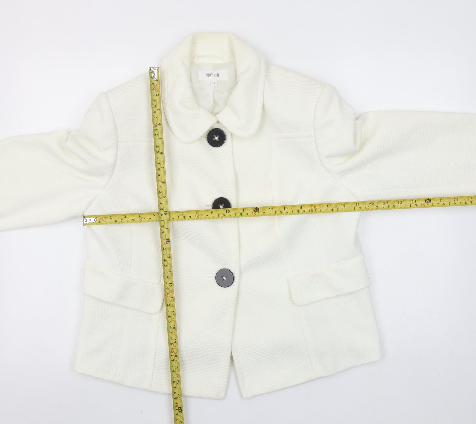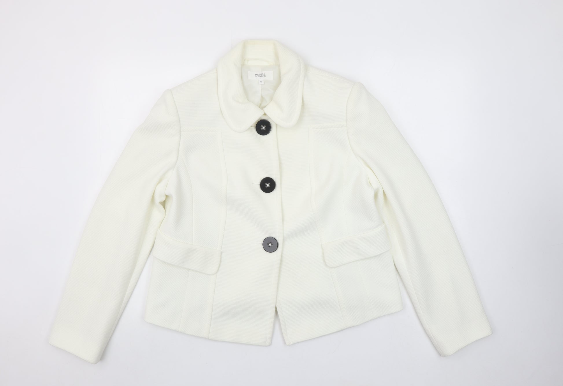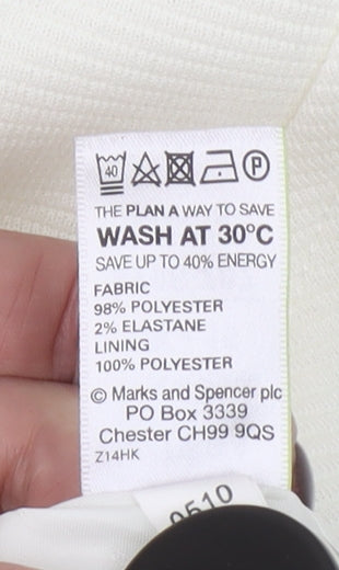 Elevate your professional or smart-casual wardrobe with this elegant ivory blazer from Marks and Spencer. Crafted with precision, this beautifully structured piece combines timeless design with impeccable tailoring. The jacket features a classic single-breasted cut with three large contrasting buttons at the front, delivering a polished yet modern aesthetic. The rounded collar adds a feminine touch while the front flap pockets provide practicality along with understated style. Made from a soft yet durable blended fabric of 98% polyester and 2% elastane, this jacket offers a comfortable fit with a slight stretch for ease of movement throughout the day. It’s fully lined with 100% polyester for a smooth feel and lasting quality. Its mid-weight fabric and long sleeves make it versatile for year-round wear, ideal for layering over blouses or dresses. Whether paired with tailored trousers for business meetings or jeans for a more relaxed brunch look, this jacket transitions effortlessly between occasions.The neutral ivory hue makes it a wardrobe staple, perfect for coordinating with a variety of colours and prints. Carefully designed seams and a structured silhouette enhance the natural shape of the wearer, offering a flattering, feminine fit. Suitable for workwear, business events, or formal outings, its blend of sophistication and subtle detail embodies the enduring quality Marks and Spencer is known for. Conditioned in excellent pre-owned shape with no visible flaws, this piece represents both refined style and lasting value. A stylish essential for the modern woman’s wardrobe, it ensures effortless elegance in every season.