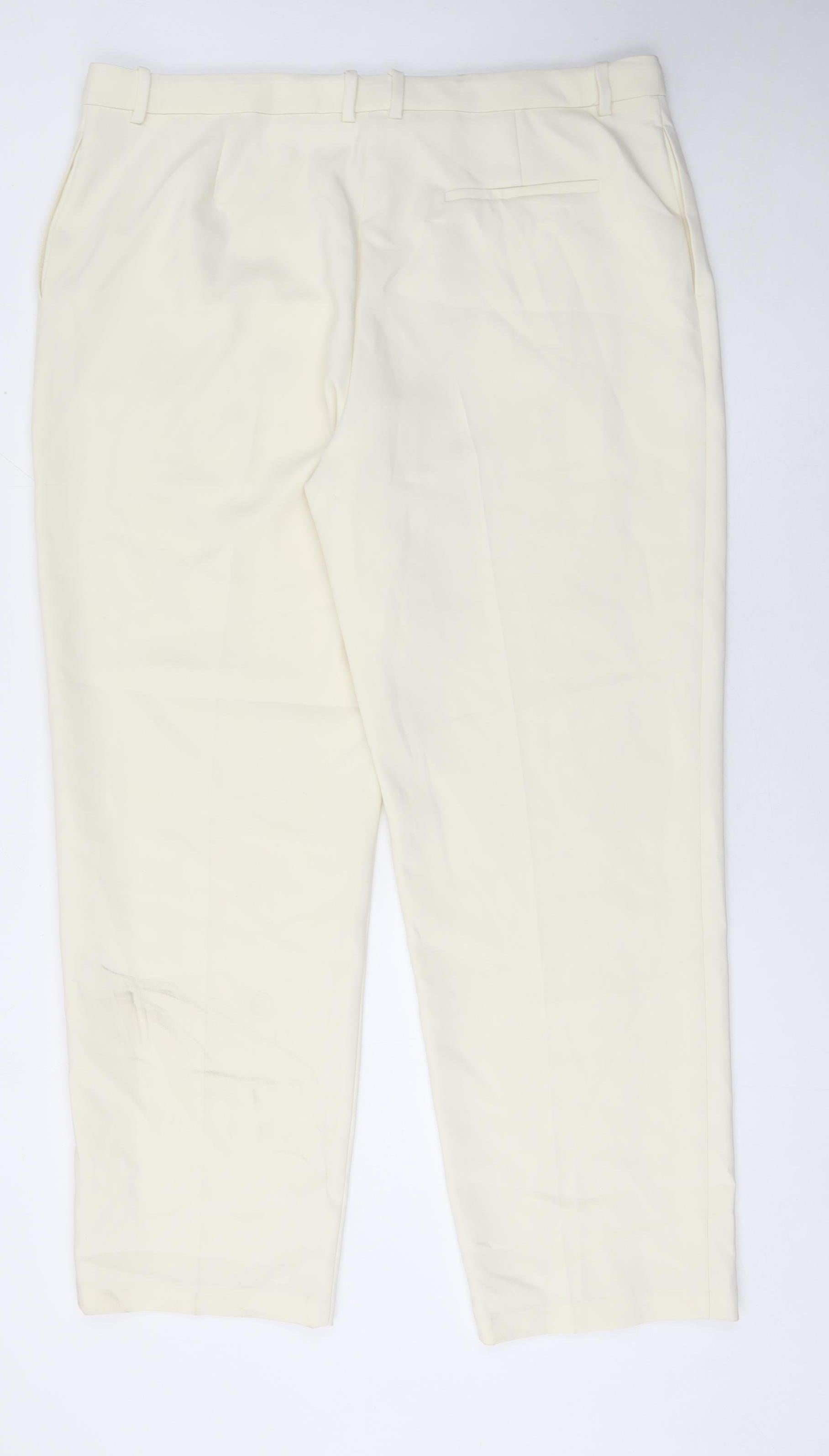 Step into sophisticated comfort with these beautiful Marks and Spencer women's ivory trousers in a size 20 Tall. Expertly crafted from a high-quality blend of 75% polyester, 20% viscose, and 5% elastane, they deliver a polished look while ensuring comfort and flexibility throughout the day. The soft ivory shade provides a timeless, elegant appeal suitable for both smart and casual occasions. Featuring a flattering straight leg cut, these trousers elongate the silhouette while maintaining a refined, structured shape. The mid-rise waistband sits comfortably on the waist with belt loops for styling versatility, and the zip fastening ensures a secure fit. Thoughtfully designed with pockets for practicality and a clean flat front finish, they embody understated sophistication. Ideal for business meetings, office wear, or elegant casual outings, the lightweight fabric ensures breathability across multiple seasons, making them perfect for spring, summer, and autumn. The smooth twill fabric gives a gently textured feel and maintains a crisp appearance with minimal effort due to its easy-care design. Whether worn with a blouse and blazer for work or paired with a soft knit for weekend outings, these trousers bring timeless style and confidence to any wardrobe. The Marks and Spencer brand guarantees durability and comfort, making them a trusted choice for stylish practicality. These trousers are in very good pre-loved condition, showing light signs of wear with minor marks on the back leg area that do not detract from their overall charm or wearability. Perfect for those seeking classic tailoring with modern comfort, they offer a flattering fit and versatile elegance ready to elevate your everyday looks. A tasteful and functional addition to any collection, these ivory trousers encapsulate the effortless British style Marks and Spencer is known for, balancing comfort, quality, and sophistication in equal measure.