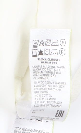 Elevate your wardrobe with these stylish ivory trousers from Marks and Spencer, tailored perfectly for women. Crafted from a comfy cotton blend featuring 50% cotton, 47% polyamide, and 3% elastane, these trousers ensure a wonderful blend of comfort and flexibility. The flat front design coupled with an elastic waist makes them easy to wear and suitable for casual occasions. Brand new with tags, these trousers present an unbeatable choice for those who appreciate simplicity and elegance. Machine washable for easy care, they are a practical addition to any seasonal collection. Their classic ivory hue makes them a versatile choice for pairing with various tops and accessories.