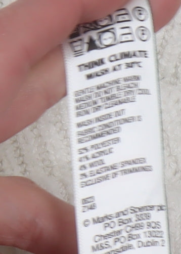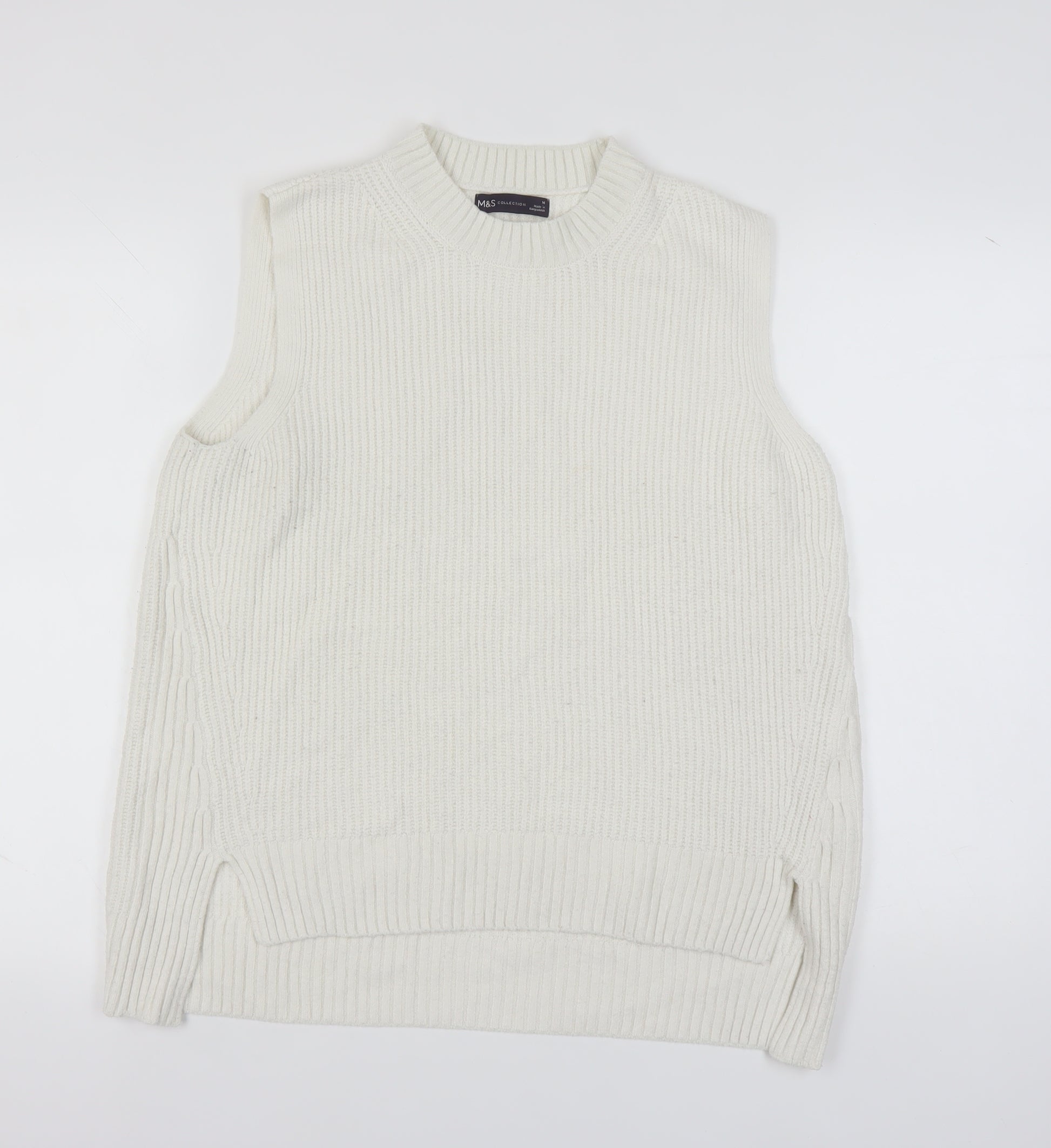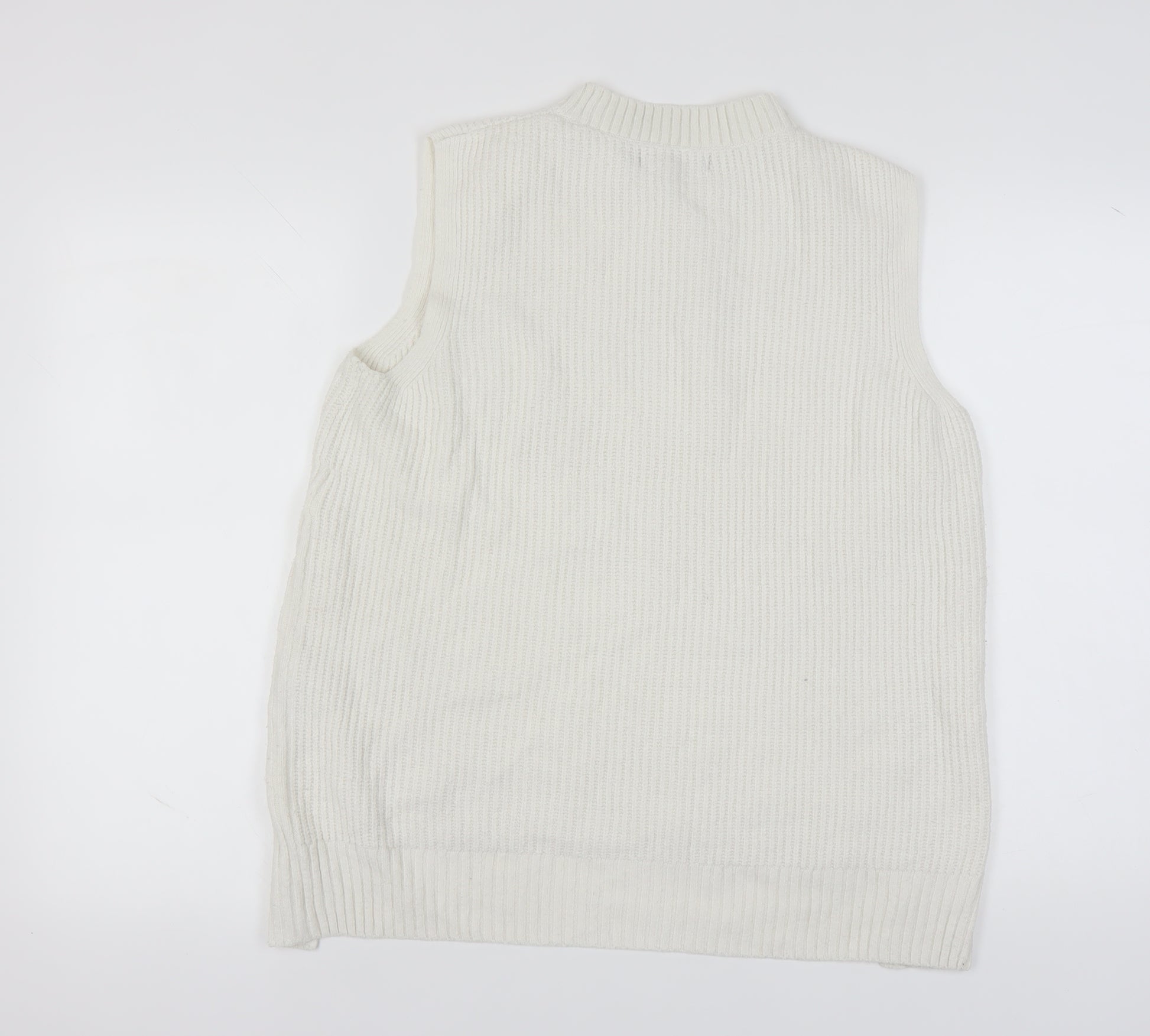 This elegant ivory vest from Marks and Spencer makes a versatile addition to any woman's wardrobe. Crafted from a blend of polyester, acrylic, wool, and elastane, this knitted piece offers both comfort and durability with its chunky-knit style. The sleeveless design and crew neck make it perfect for layering, while its lightweight quality ensures it’s suitable for all seasons. Ideal for casual occasions, this vest can be easily paired with a variety of outfits to create chic, layered looks. The regular fit offers a relaxed yet stylish appearance, and while it doesn’t sport any additional patterns or accents, its simplicity is what makes it a timeless choice. Machine washable and crafted with care, this vest holds up well against regular use. In excellent condition, showing minimal wear without original sales tags, it is available at an incredibly reasonable price. This Marks and Spencer vest combines the brand’s renowned quality with effortless style, making it a smart addition to any fashion-forward wardrobe.