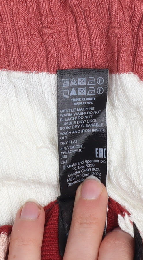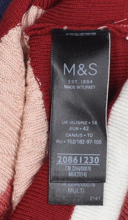 Brighten your wardrobe with this stylish Marks and Spencer women’s multicoloured knit top in a beautifully textured striped design. Crafted from a soft blend of viscose and acrylic, this lightweight jersey knit provides comfort and gentle stretch for a flattering fit. The short sleeves and classic crew neckline give it a timeless silhouette, while the colourful palette of red, navy, blue, cream, and pink stripes adds a vibrant touch of personality to any outfit. The breathable fabric makes it ideal for transitioning through the seasons, whether layered in cooler months or worn on its own in warmer weather. Styled in a relaxed, regular fit, this versatile top pairs perfectly with high-waisted jeans, skirts, or tailored trousers for a polished casual look. Designed for modern women who love effortless style, it combines comfort with sophistication. This piece is easy to care for with machine-washable convenience, making it a practical choice for everyday wear. The lightly textured knit fabric adds depth and dimension, creating subtle detailing that elevates its overall appearance. Perfect for casual days out, travel, or brunch with friends, this top delivers a refined yet relaxed charm suitable for multiple occasions. The Marks and Spencer quality ensures lasting wear and a comfortable feel throughout the day. Though pre-owned, it remains in very good condition with only a faint mark near the hem that does not detract from the overall look. A beautifully versatile addition to any wardrobe, offering timeless elegance with modern ease. Size UK 14 provides a comfortable, flattering fit. A must-have for fans of M&S’ understated, stylish essentials, ready to wear and easy to style for any season.