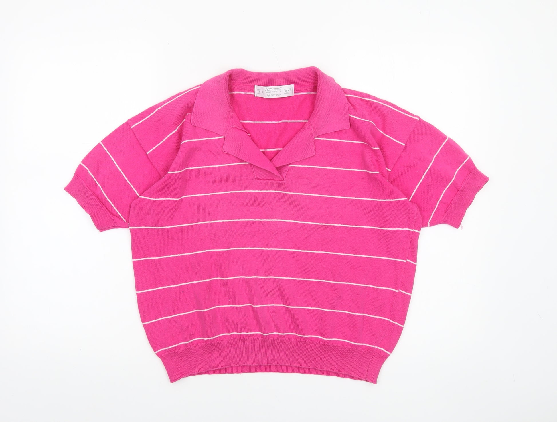 Women Pink Striped Cotton Collared Short Sleeve Jumper Size 12-14